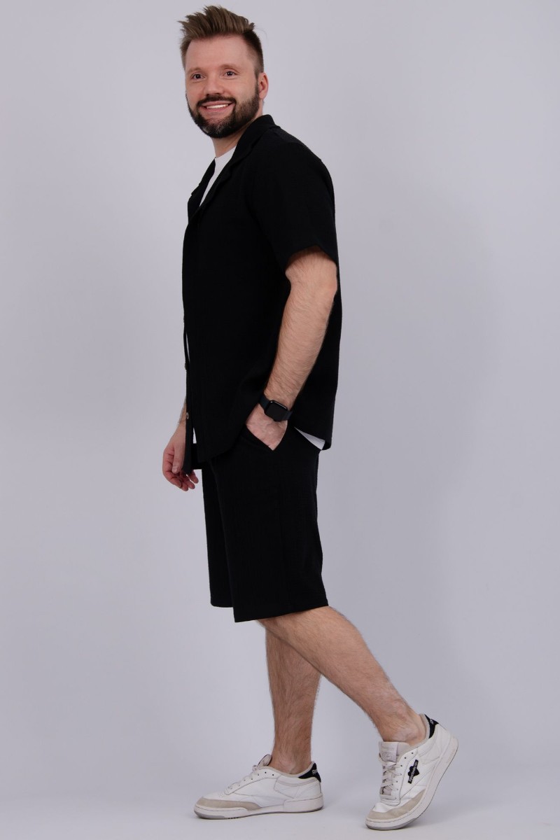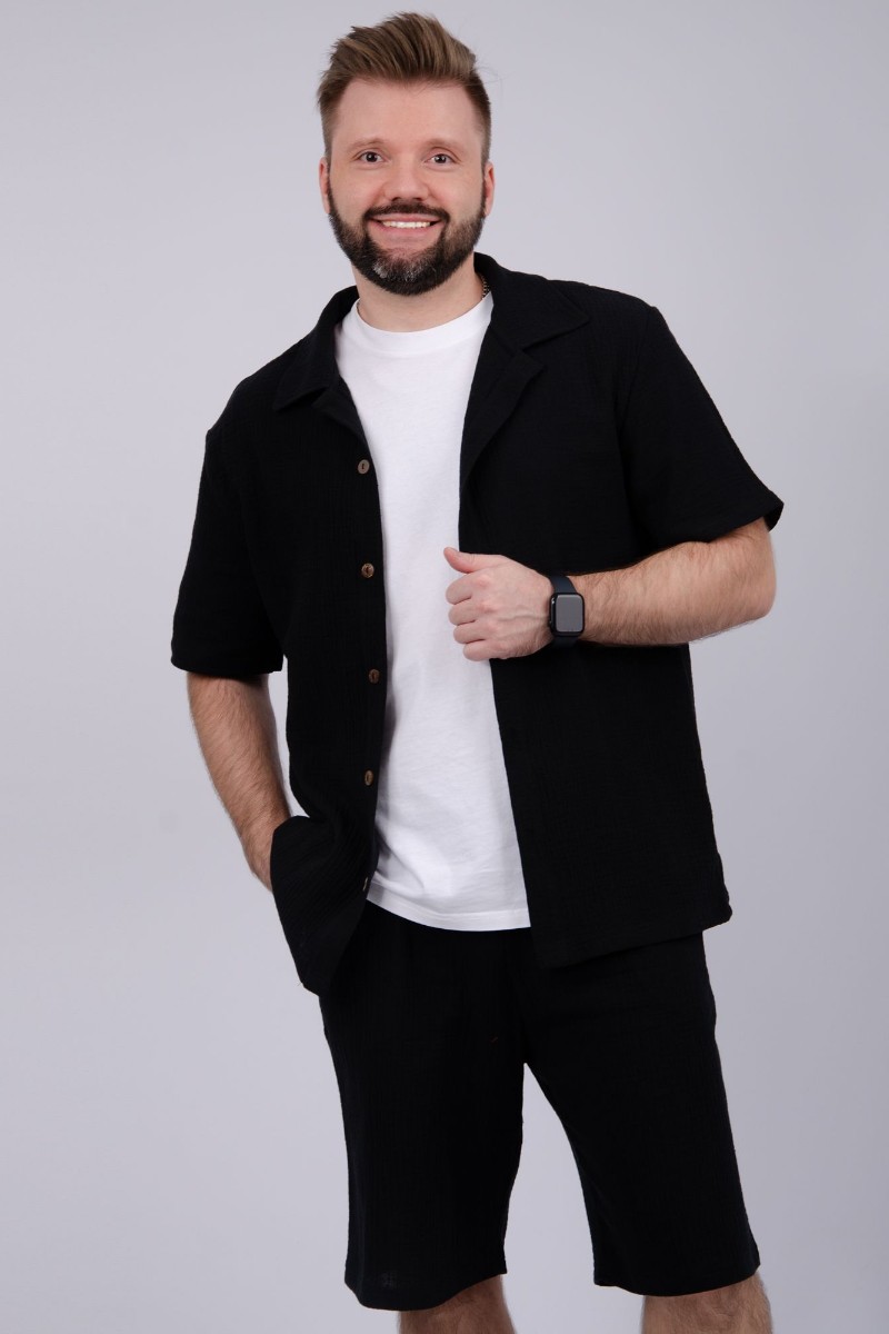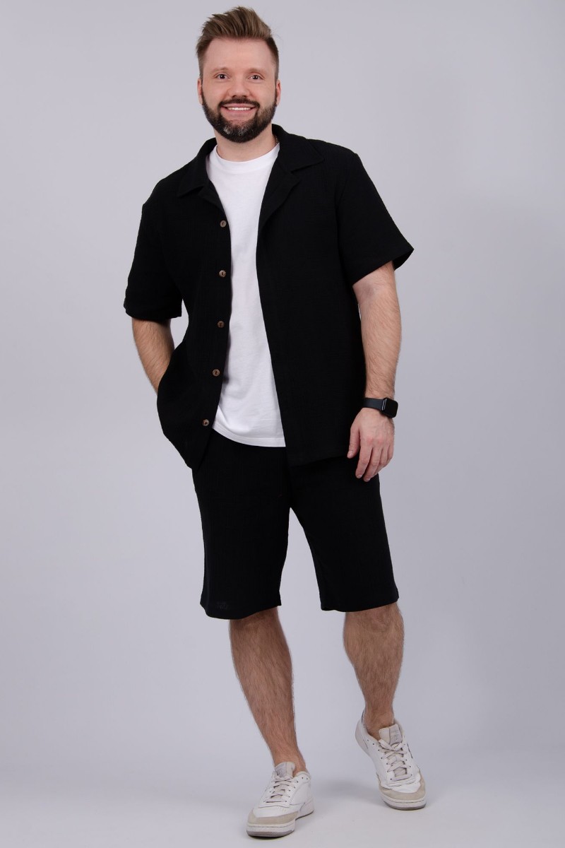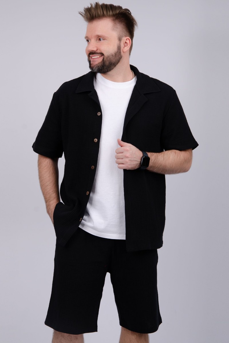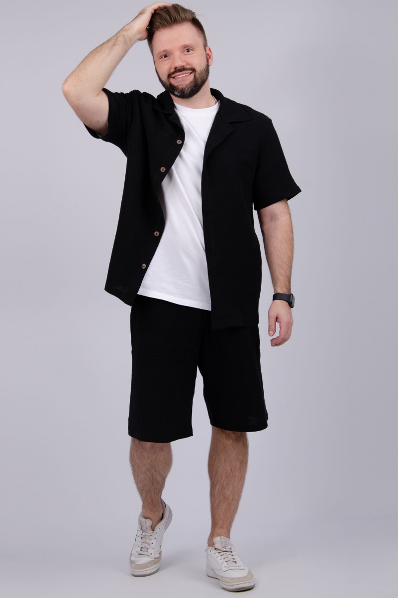 Представляем Вашему вниманию мужской костюм двойку, состоящий из рубашки на пуговицах и шортов. Сшито из высококачественного муслина - 100% хлопок, позволяющий коже дышать. Костюм хорошо сидит на фигуре и подчеркивает её достоинства. Отдых в нём будет максимально комфортным и расслабляющим.