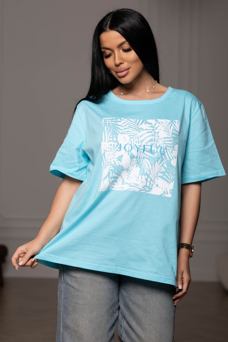Представляем Вашему вниманию лёгкую женскую футболку прямого силуэта с принтом на полочке и О-образной горловиной. Рукав короткий, свободный. Футболка выполнена из трикотажного полотна 100% хлопка.