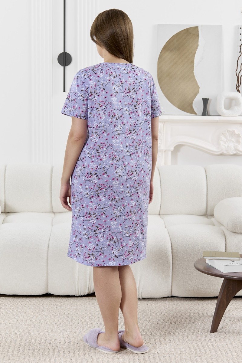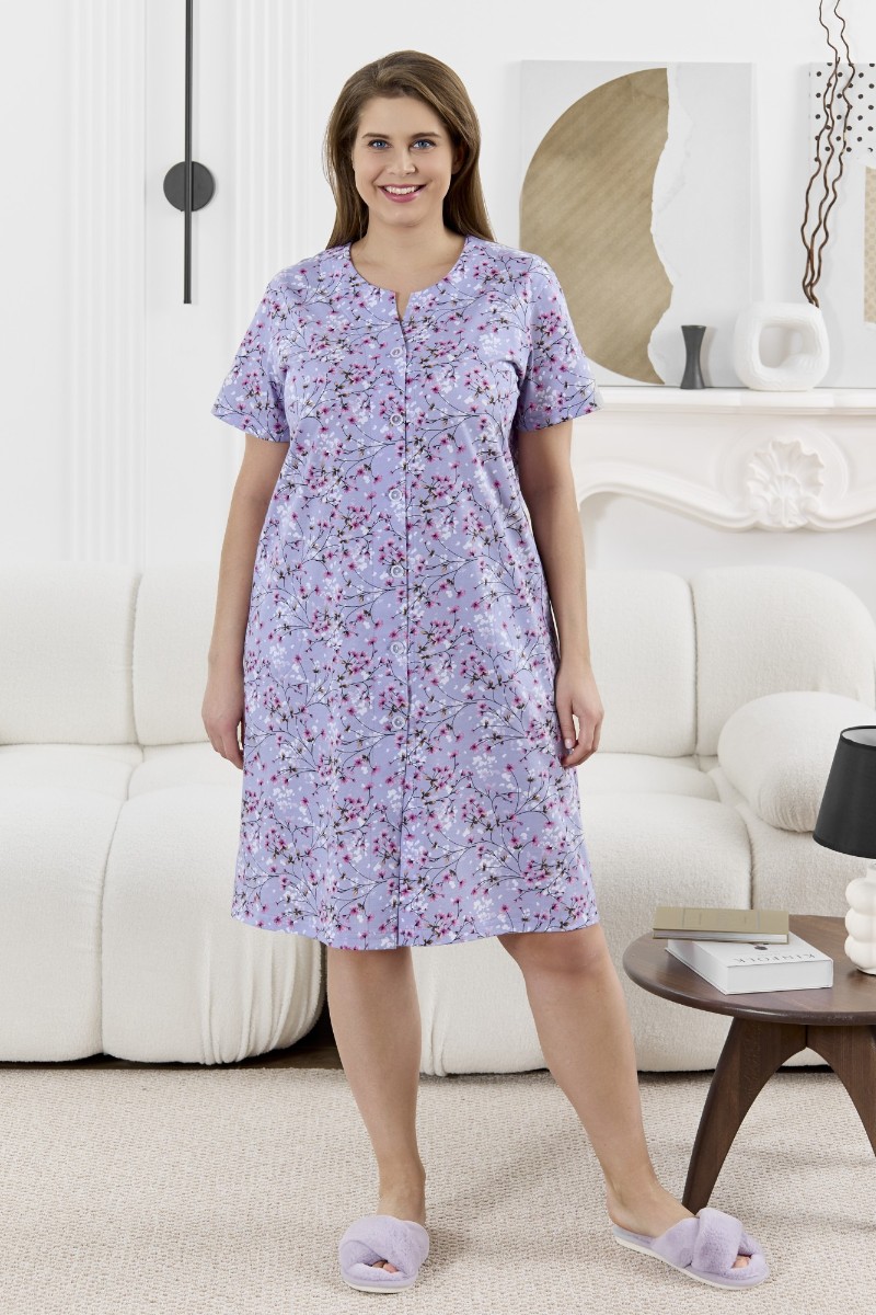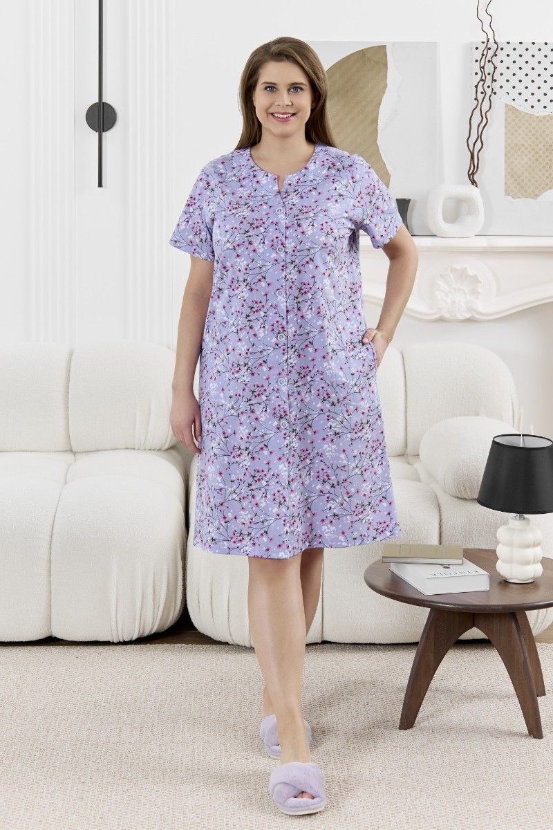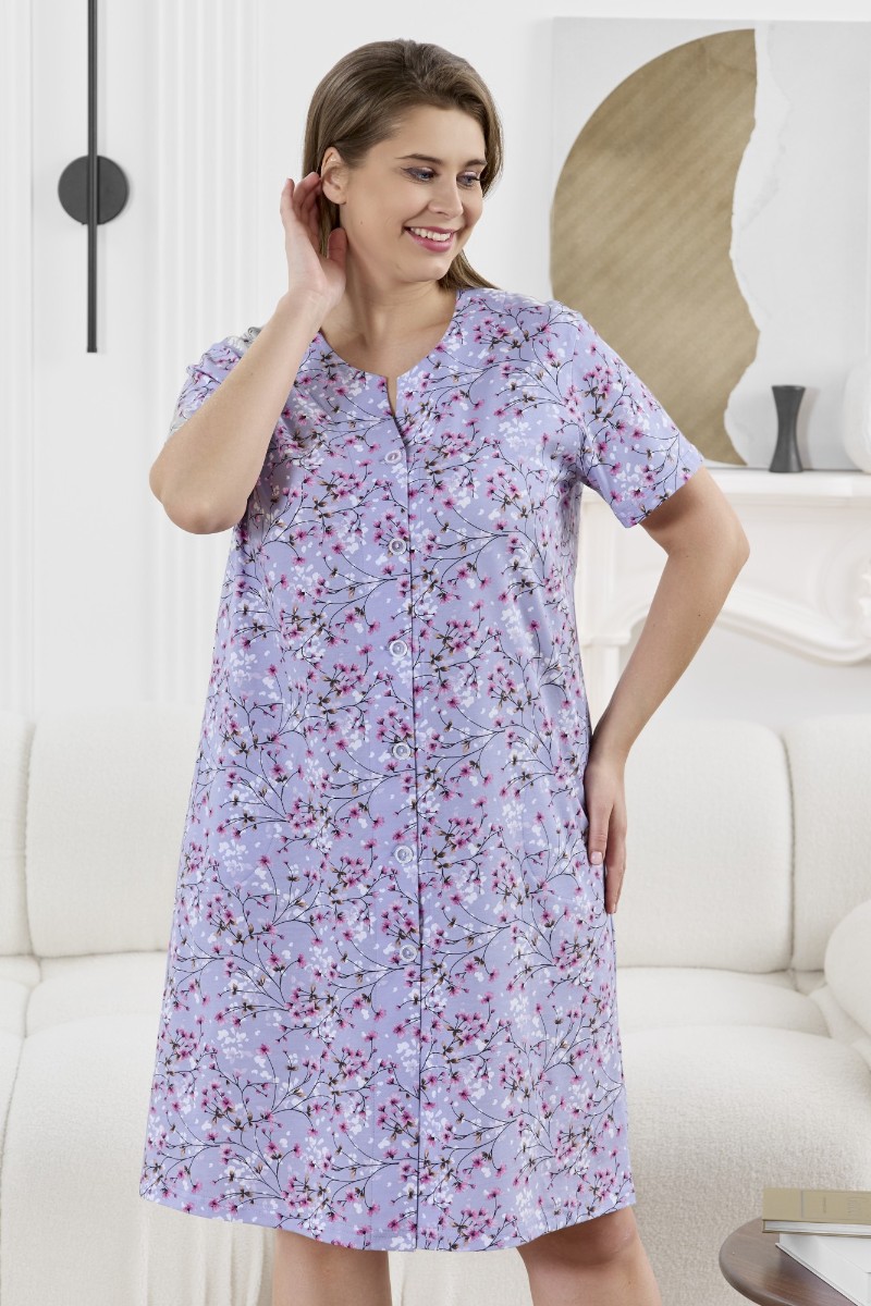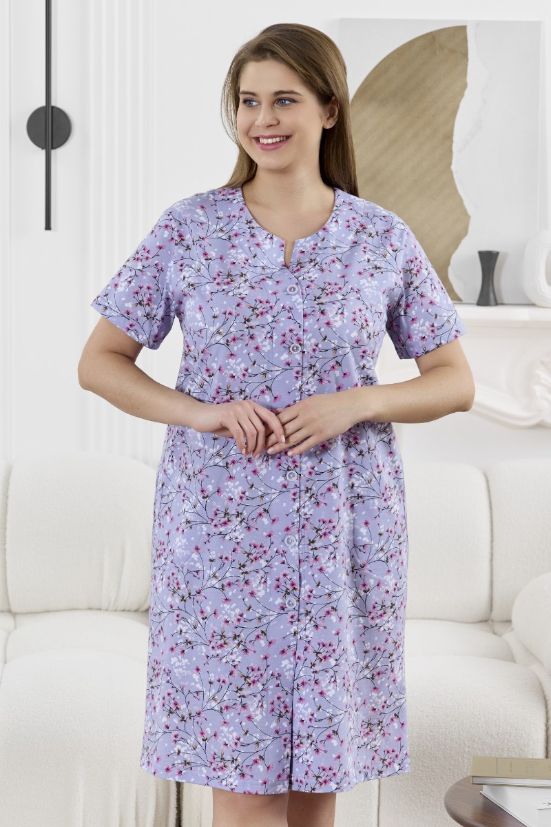 Представляем Вашему вниманию халат женский из трикотажного полотна «кулирка» с набивным рисунком, прямого силуэта, с короткими втачными рукавами, карманами в боковых швах и центральной бортовой застежкой на обметанные петли и пуговицы. Горловина – овальной формы, переходящая в небольшой v-образный вырез выше верхней пуговицы. Входы в карманы и горловина спинки окантованы.