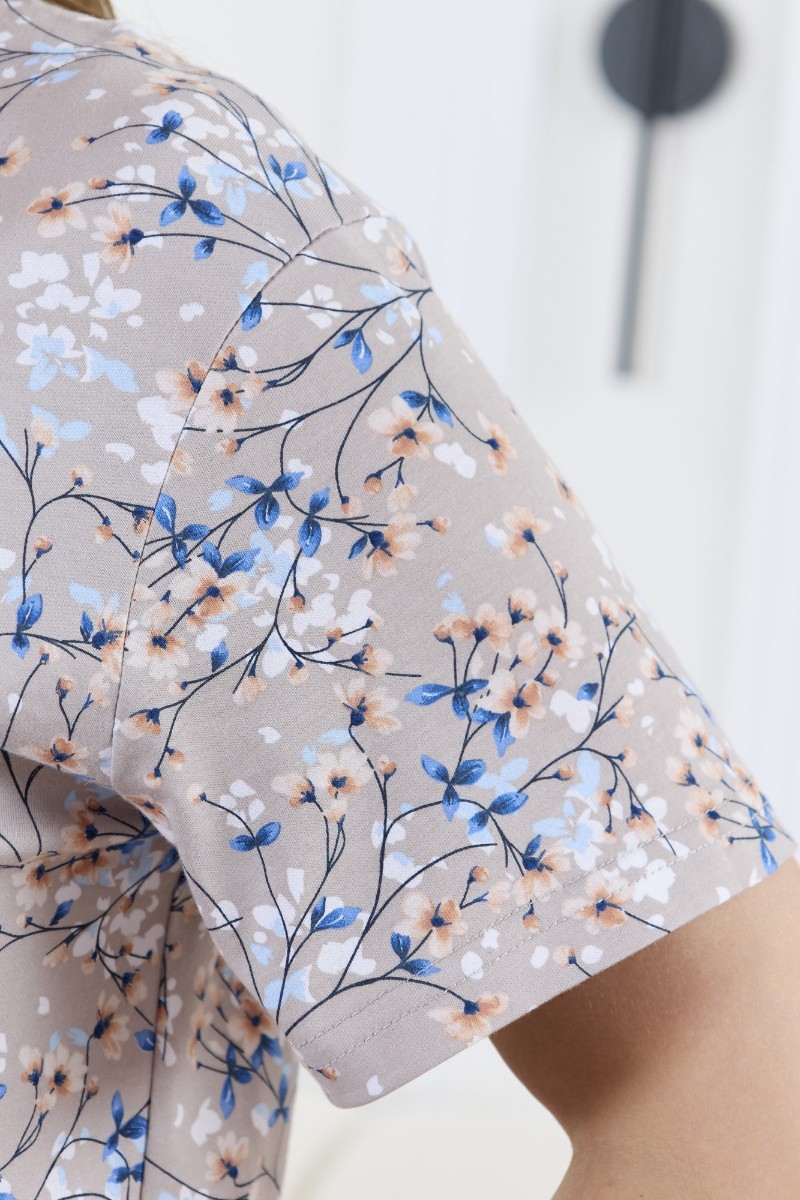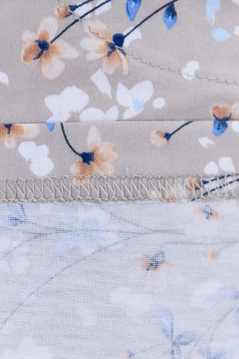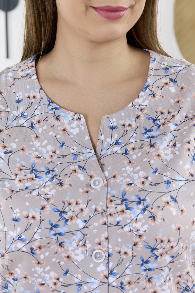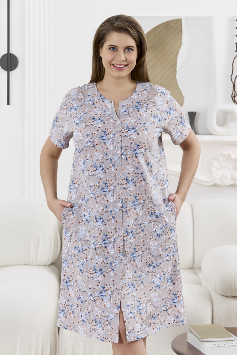 Представляем Вашему вниманию халат женский из трикотажного полотна «кулирка» с набивным рисунком, прямого силуэта, с короткими втачными рукавами, карманами в боковых швах и центральной бортовой застежкой на обметанные петли и пуговицы. Горловина – овальной формы, переходящая в небольшой v-образный вырез выше верхней пуговицы. Входы в карманы и горловина спинки окантованы.