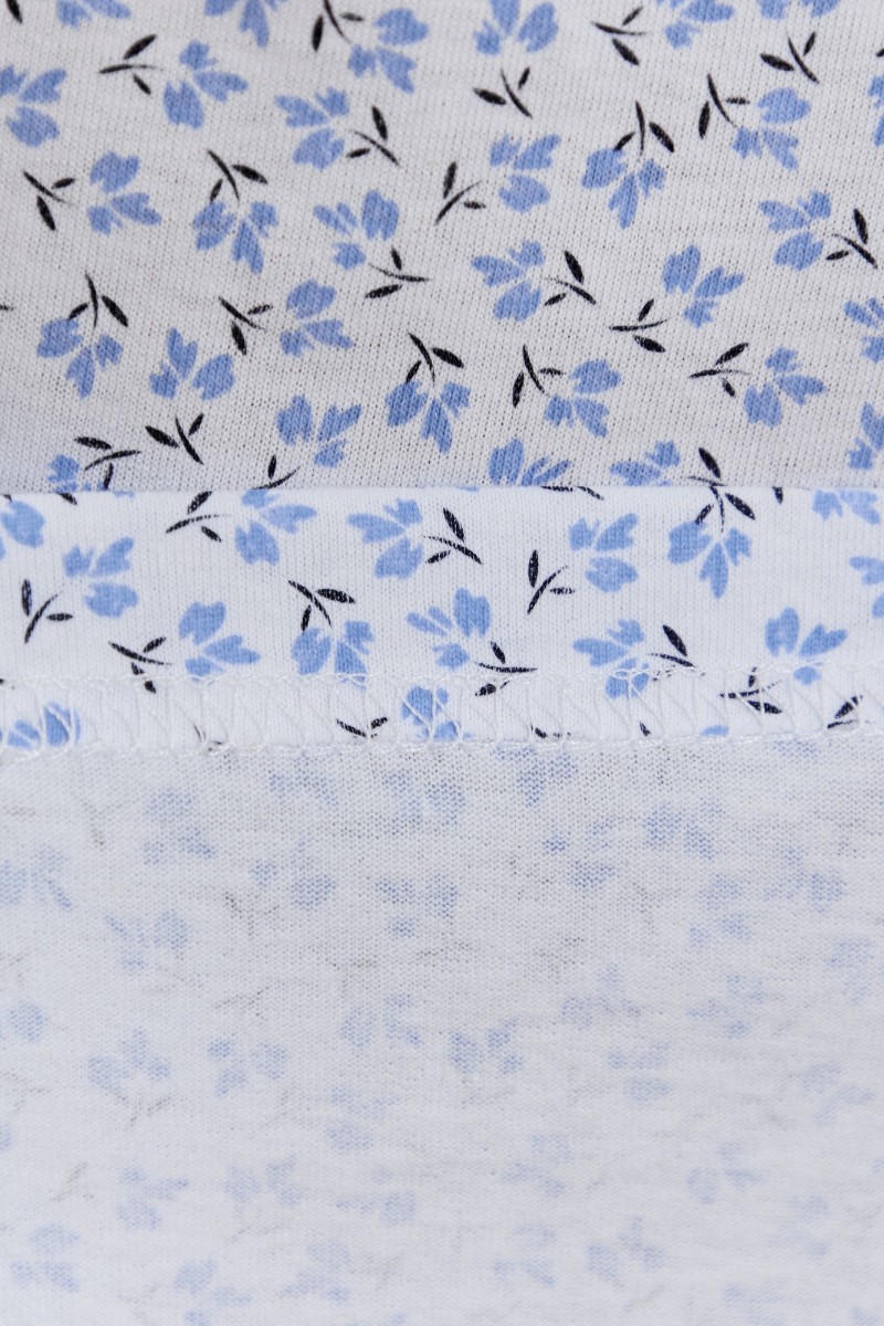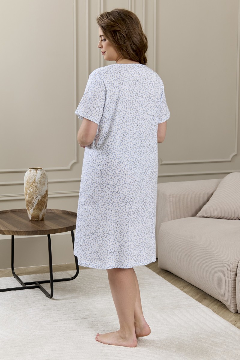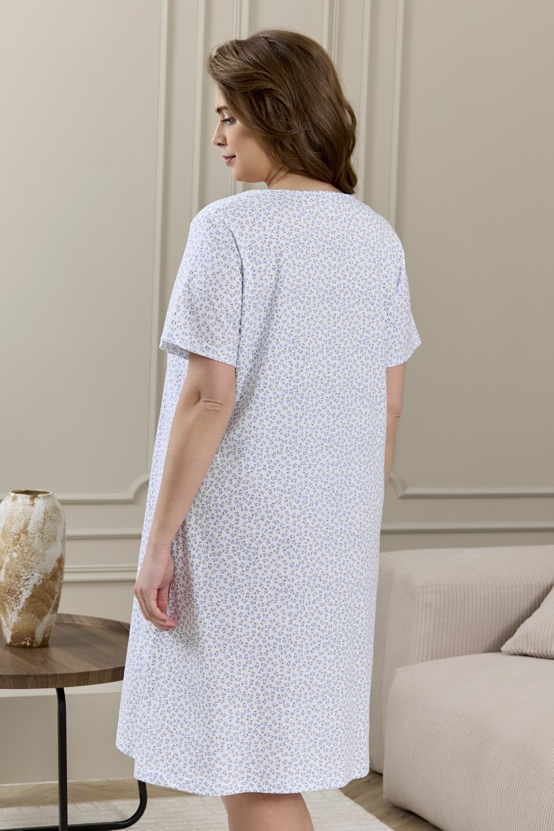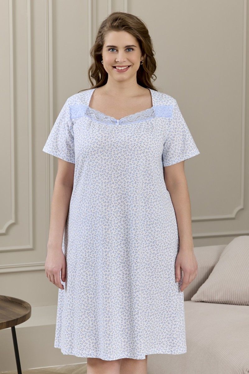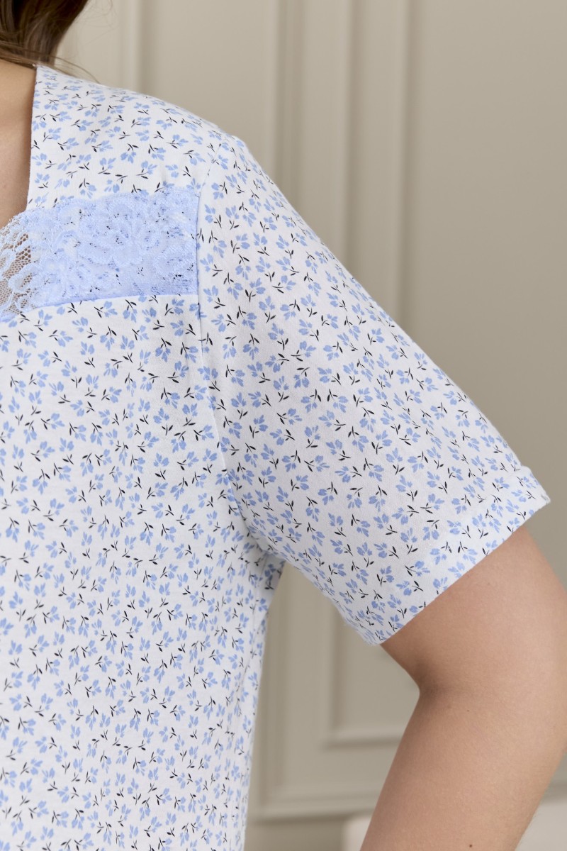 Представляем Вашему вниманию женскую сорочку из трикотажного полотна «кулирка» с набивным рисунком, свободного кроя, расширенная книзу, без рукавов на широких бретелях, с углублённой V-образной горловиной. Полочка с притачной кокеткой, состоящей из двух деталей. На нижней части полочки по шву притачивания кружевной кокетки заложены симметричные складки, горловина спинки и проймы окантованы основным материалом.