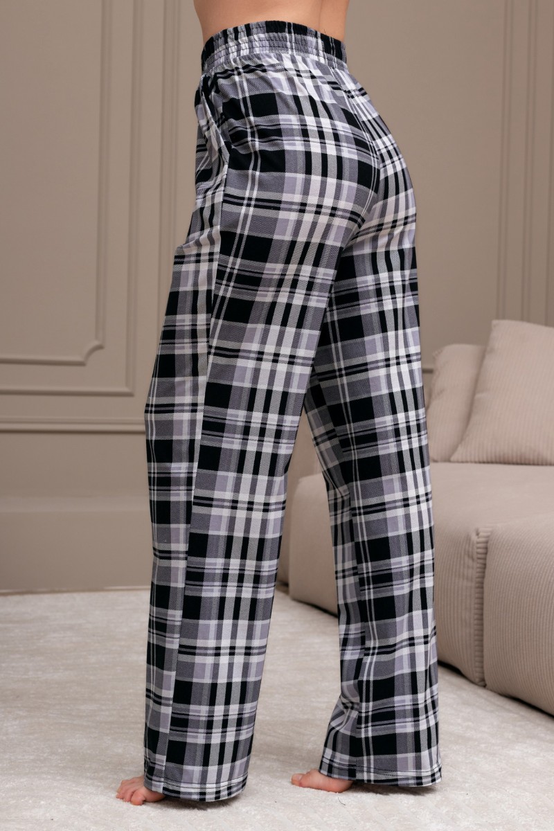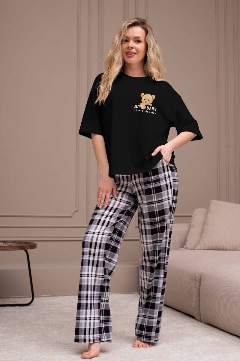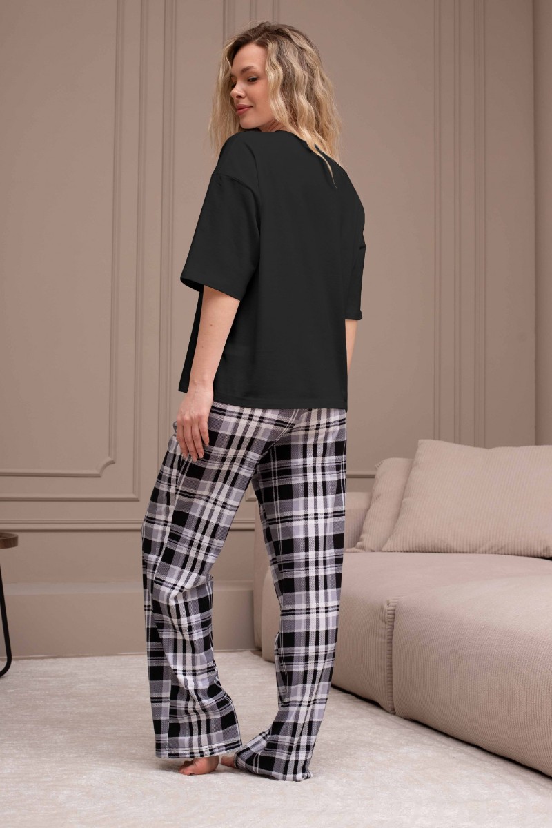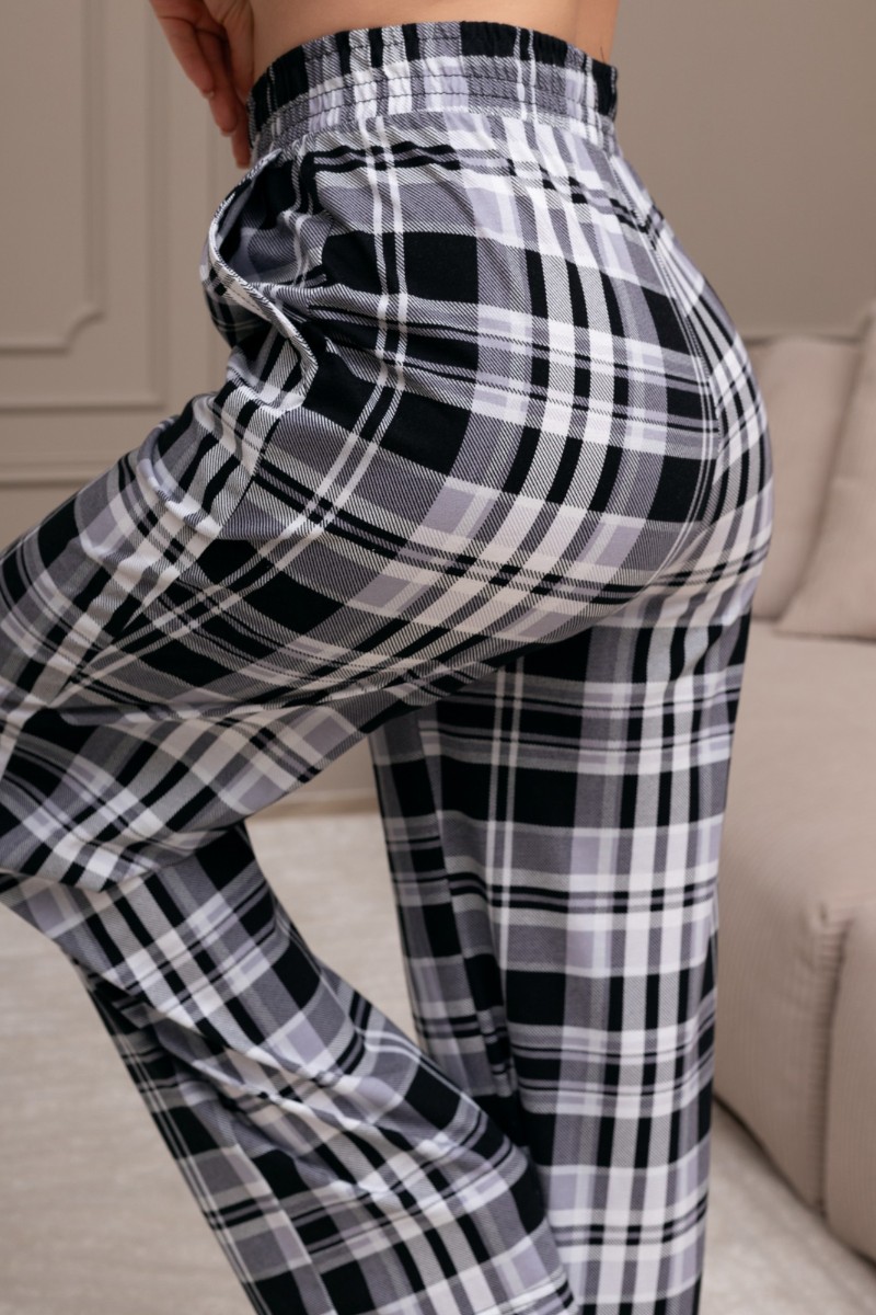 Представляем Вашему вниманию костюм женский из трикотажного полотна "кулирка" в комбинации двух видов: гладкокрашеного и набивного с тематическим рисунком, состоящий из футболки и брюк. Футболка из гладкокрашеного полотна, свободного силуэта, со спущенной линией плеч и втачными короткими рукавами, горловиной овальной формы, обработанной втачной планкой и отделочной строчкой. В центре переда - принт, выполненный в технике шелкографии. Брюки из полотна с набивным рисунком длинные, прямые, на притачном поясе с эластичной тесьмой внутри и карманами в боковых швах.