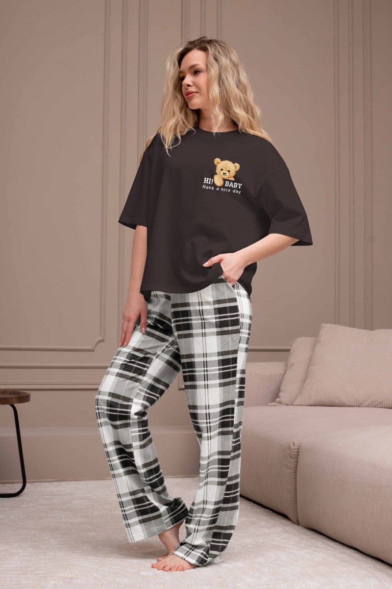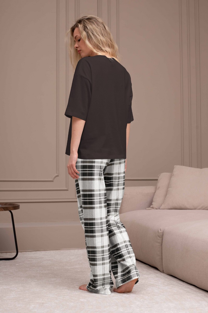 Представляем Вашему вниманию костюм женский из трикотажного полотна "кулирка" в комбинации двух видов: гладкокрашеного и набивного с тематическим рисунком, состоящий из футболки и брюк. Футболка из гладкокрашеного полотна, свободного силуэта, со спущенной линией плеч и втачными короткими рукавами, горловиной овальной формы, обработанной втачной планкой и отделочной строчкой. В центре переда - принт, выполненный в технике шелкографии. Брюки из полотна с набивным рисунком длинные, прямые, на притачном поясе с эластичной тесьмой внутри и карманами в боковых швах.