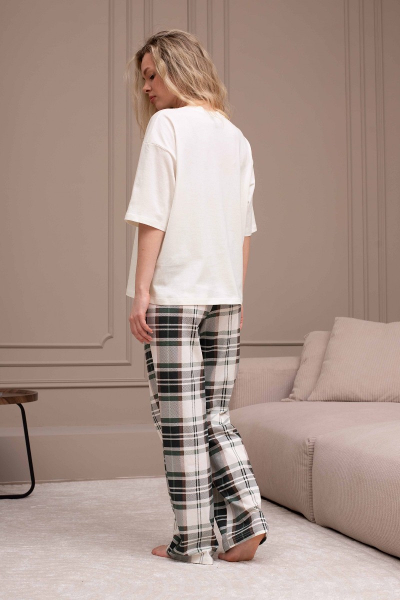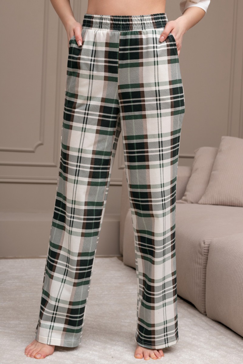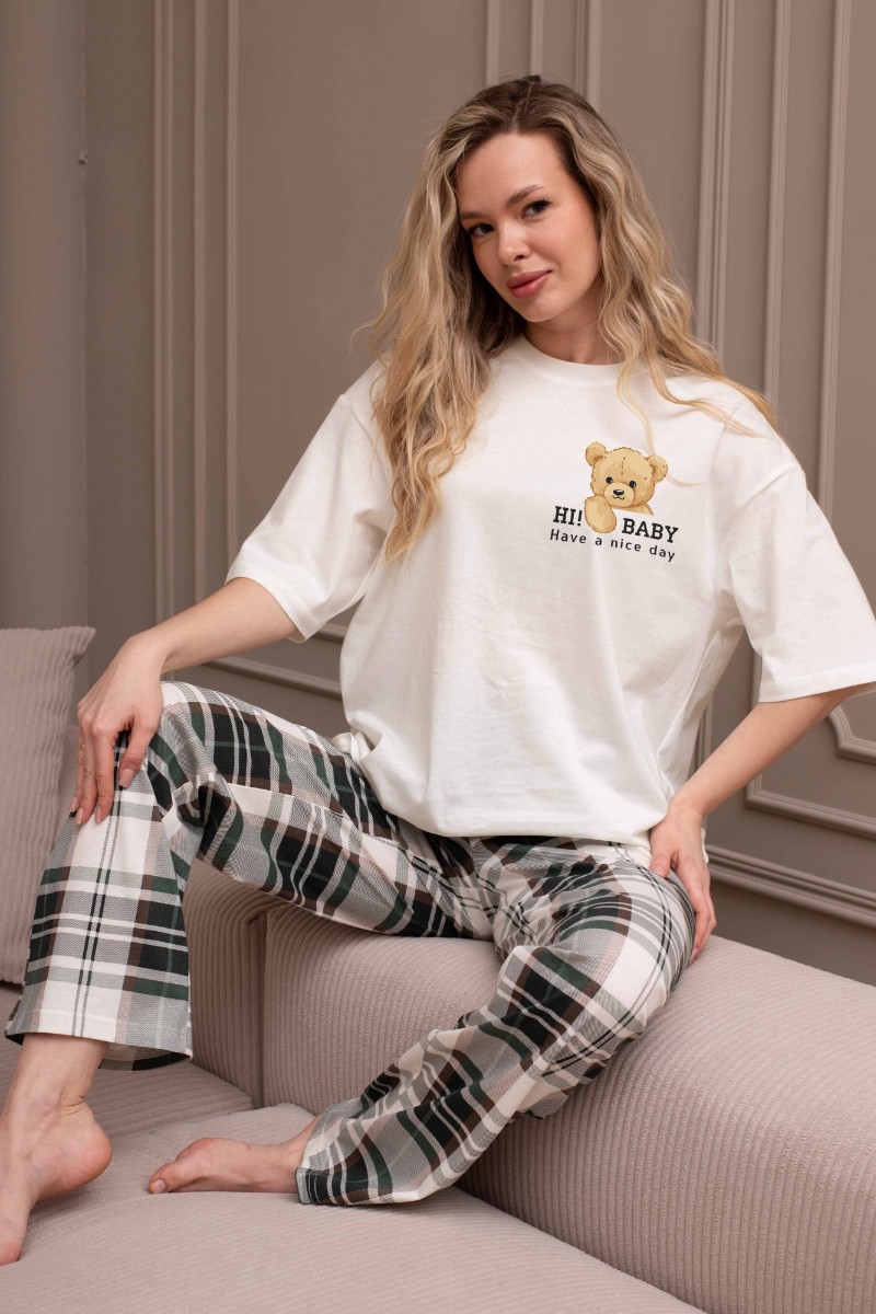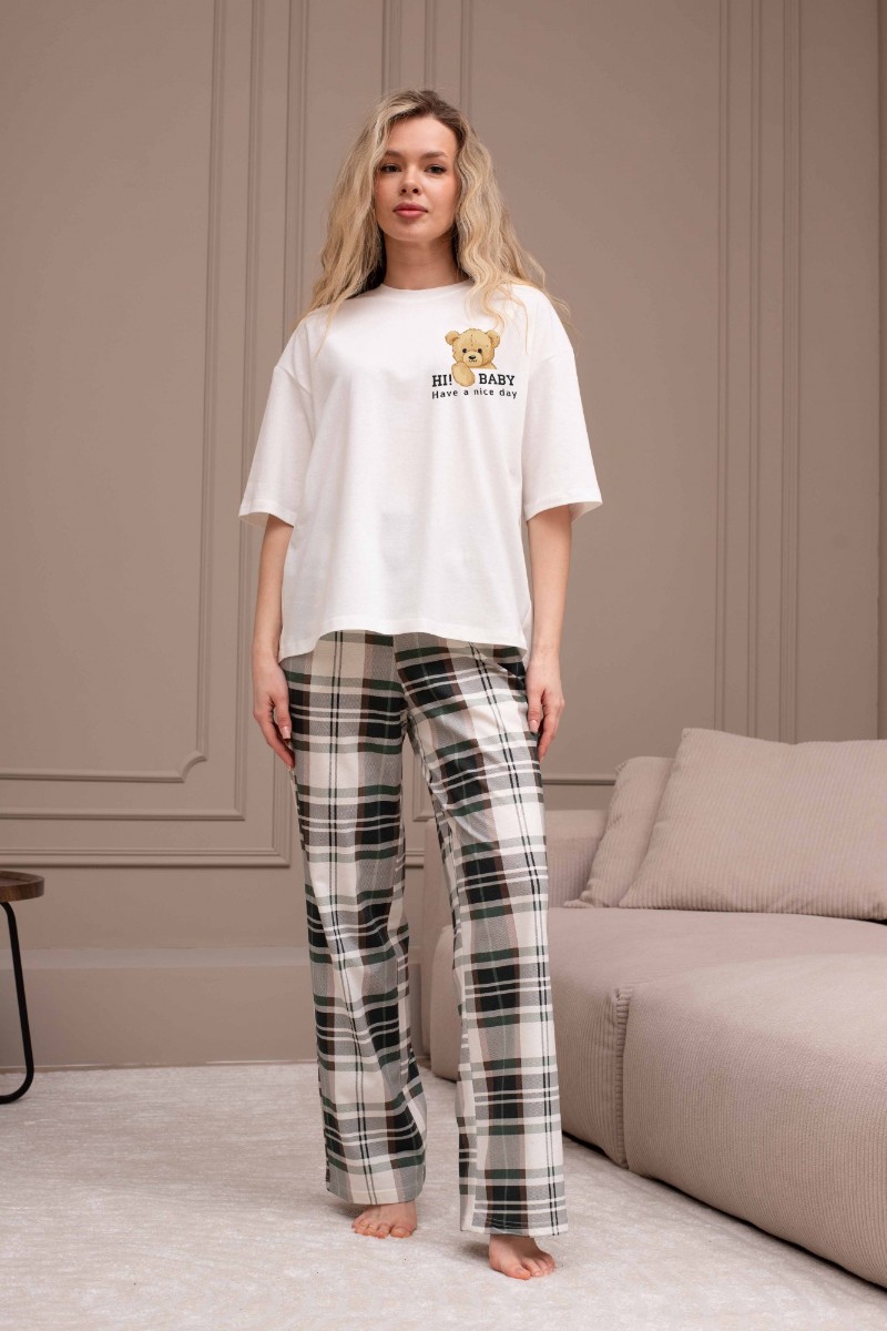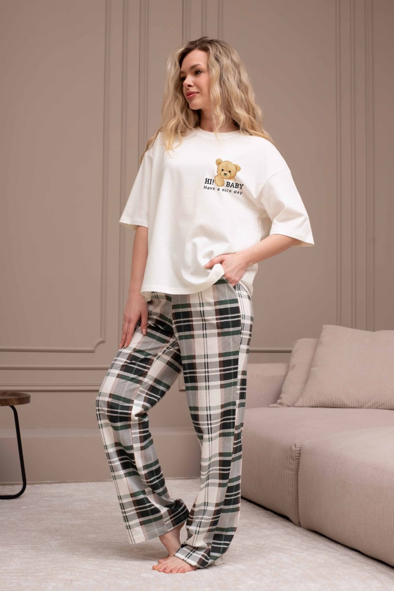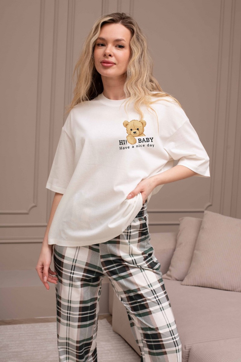 Представляем Вашему вниманию костюм женский из трикотажного полотна "кулирка" в комбинации двух видов: гладкокрашеного и набивного с тематическим рисунком, состоящий из футболки и брюк. Футболка из гладкокрашеного полотна, свободного силуэта, со спущенной линией плеч и втачными короткими рукавами, горловиной овальной формы, обработанной втачной планкой и отделочной строчкой. В центре переда - принт, выполненный в технике шелкографии. Брюки из полотна с набивным рисунком длинные, прямые, на притачном поясе с эластичной тесьмой внутри и карманами в боковых швах.