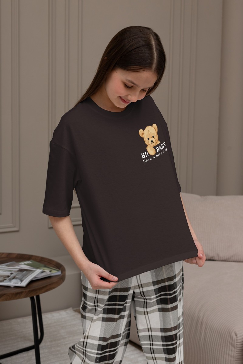 Представляем Вашему вниманию костюм для девочки из трикотажного полотна "кулирка" в комбинации двух видов: гладкокрашеного и набивного с тематическим рисунком, состоящий из футболки и брюк. Футболка из гладкокрашеного полотна, свободного силуэта, со спущенной линией плеч и втачными короткими рукавами, горловиной овальной формы, обработанной втачной планкой и отделочной строчкой. В центре переда - принт, выполненный в технике шелкографии. Брюки из полотна с набивным рисунком длинные, прямые, на притачном поясе с эластичной тесьмой внутри и карманами в боковых швах.