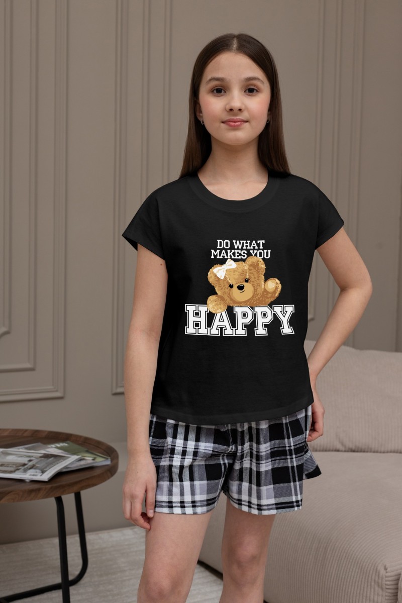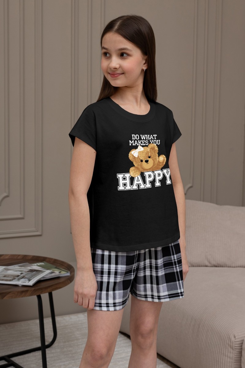 Представляем Вашему вниманию костюм для девочки из трикотажного полотна "кулирка" в комбинации двух видов: гладкокрашеного и набивного с тематическим рисунком, состоящий из футболки и шорт. Футболка из гладкокрашеного полотна, с цельнокроеными короткими рукавами, горловиной овальной формы, обработанной втачной планкой и отделочной строчкой. В центре переда - принт, выполненный в технике шелкографии. Шорты из полотна с набивным рисунком, свободного силуэта, на цельнокроеном поясе с эластичной тесьмой внутри.