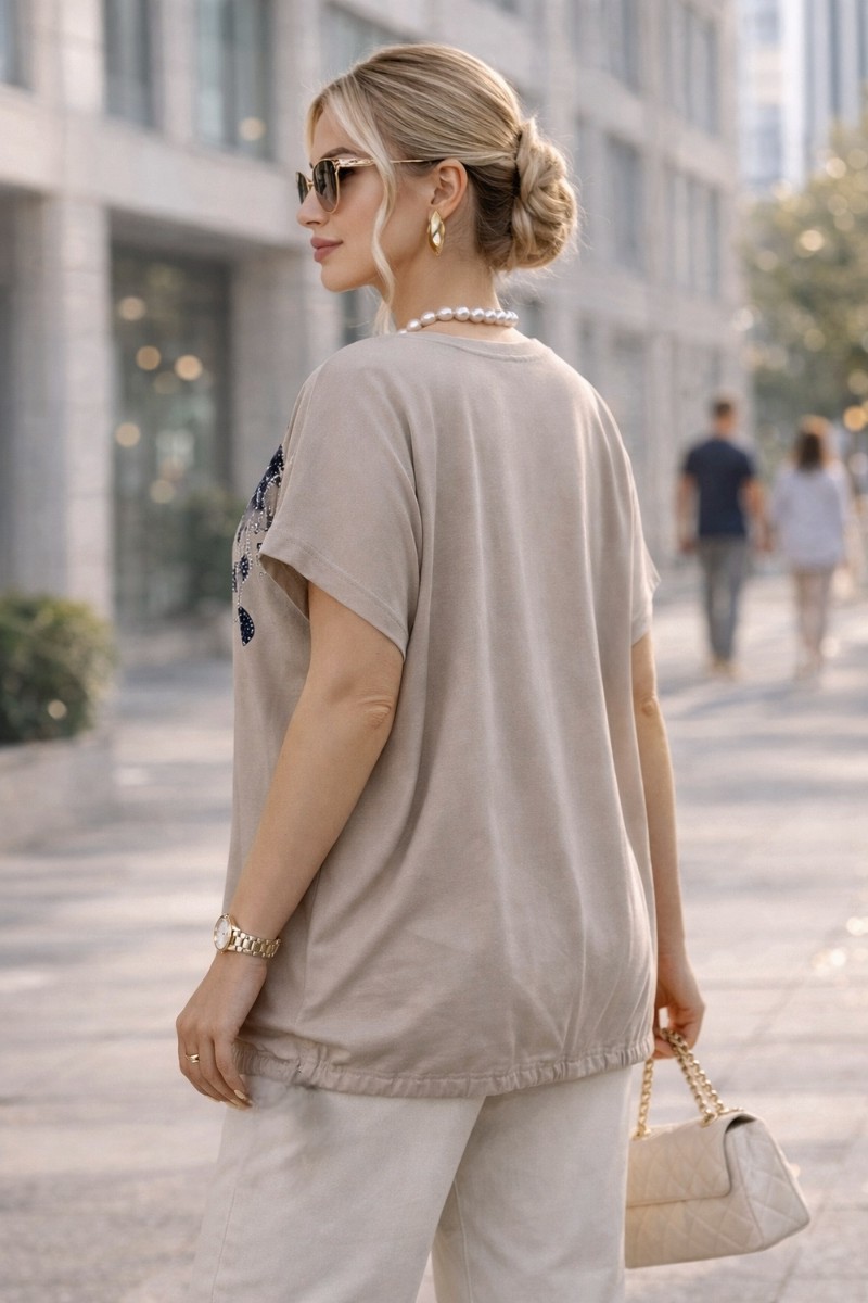 Эта футболка — настоящий акцент в образе. Её легко сочетать с джинсами, брюками или юбками, создавая как повседневные, так и вечерние луки. Стразы добавляют нотку роскоши, а мягкая ткань обеспечивает комфорт. Сочетайте её с белыми брюками для лаконичного образа или с джинсами для непринужденного стиля — в любом случае вы будете выглядеть безупречно!