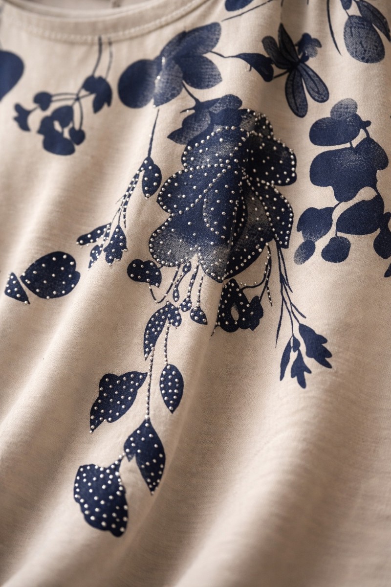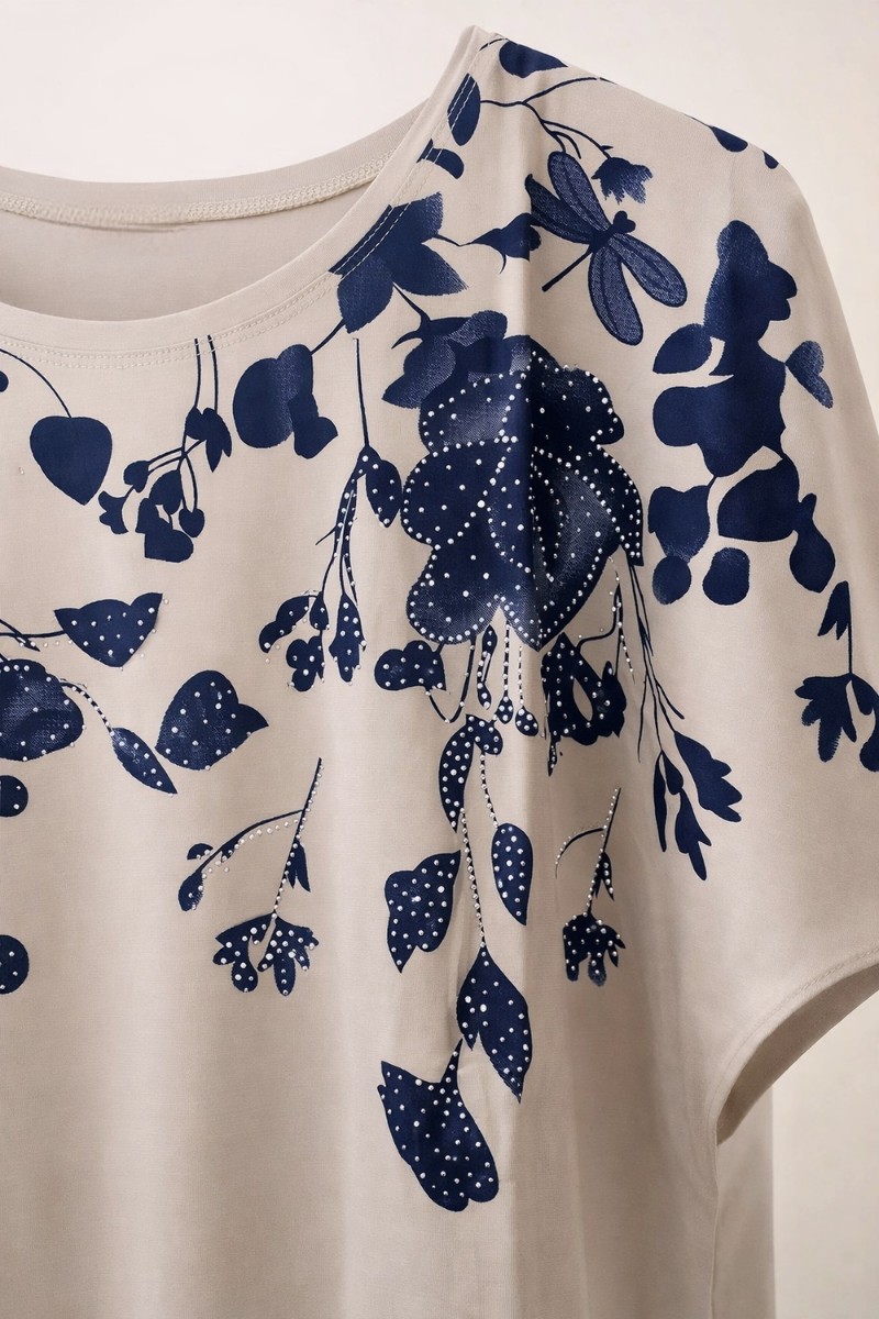 Футболка украшена изысканным цветочным принтом в оттенках синего, дополненным сверкающими стразами. Каждый элемент узора словно оживает на солнце, создавая игру света и бликов, которая привлечет взгляды. Плавные линии цветов и листьев, с аккуратными стразами, придают модели романтичности и шарма. Опущенная линия плеча добавляет современности и обеспечивает комфорт — никаких стягивающих ощущений, только легкость и свобода движений. Благодаря такому крою модель выглядит стильно даже в повседневной обстановке, подчеркивая вашу естественную грацию.