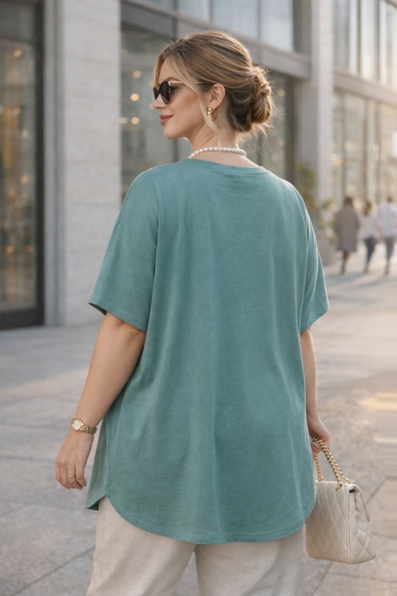 Крой — оверсайз с опущенной линией плеча, что придаёт модели современный, расслабленный силуэт и визуально удлиняет корпус. Такой крой особенно комфортен в повседневной носке и подходит для фигур размеров 58–68 — универсальный размер, который работает благодаря свободному крою и эластичности ткани.