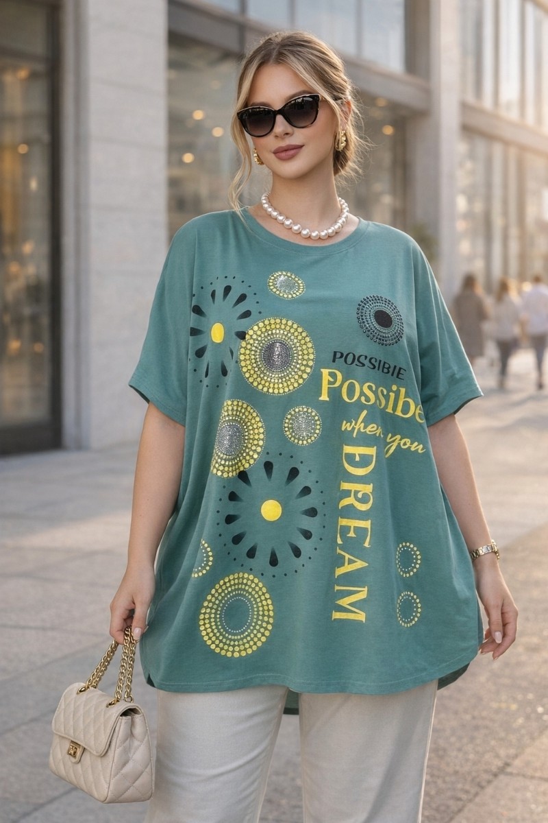 Эта туника — не просто одежда, а вдохновляющее заявление: «Всё возможно, если ты мечтаешь» — так звучит надпись на передней части изделия, гармонично вписанная в яркий, солнечный принт. Артикул F9702 создан для женщин, которые ценят смелость, женственность и утончённую роскошь в каждой детали.
