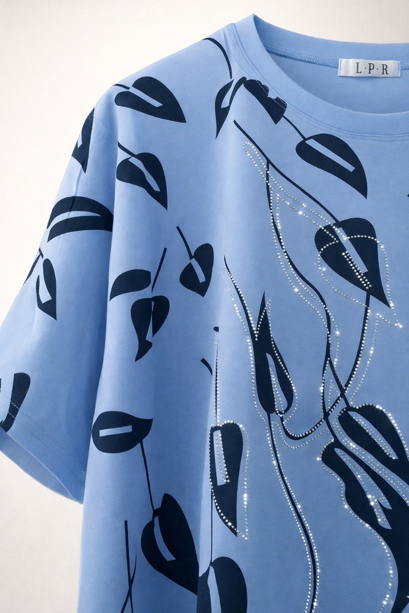 Центральный акцент — ботанический принт в темной гамме, дополненный расстановкой страз по контурам листьев и ветвей. Стразы переливаются в свете, создавая эффект «живого» декора — не кричащего, а деликатного, с глубиной и текстурой. Это не блеск ради блеска, а акцент, который говорит о вашем вкусе и внимании к деталям.
