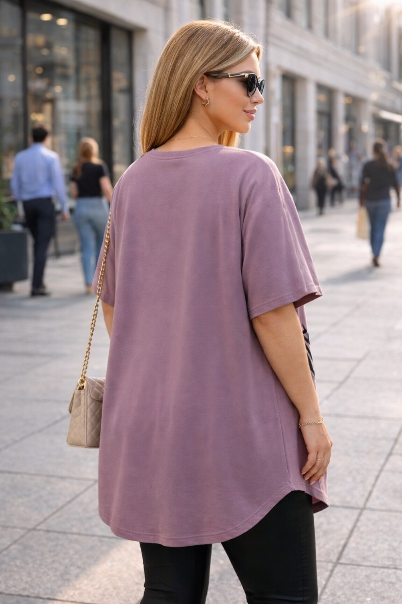 Спущенная линия плеча создаёт расслабленный, модный силуэт, визуально удлиняющий шею и придающий образу лёгкую небрежную грацию. Крой оверсайз обеспечивает универсальность: туника легко садится на фигуры размеров 58–68, скрывая недостатки и подчёркивая достоинства. Это действительно единый размер, который работает благодаря продуманному крою и эластичности ткани.