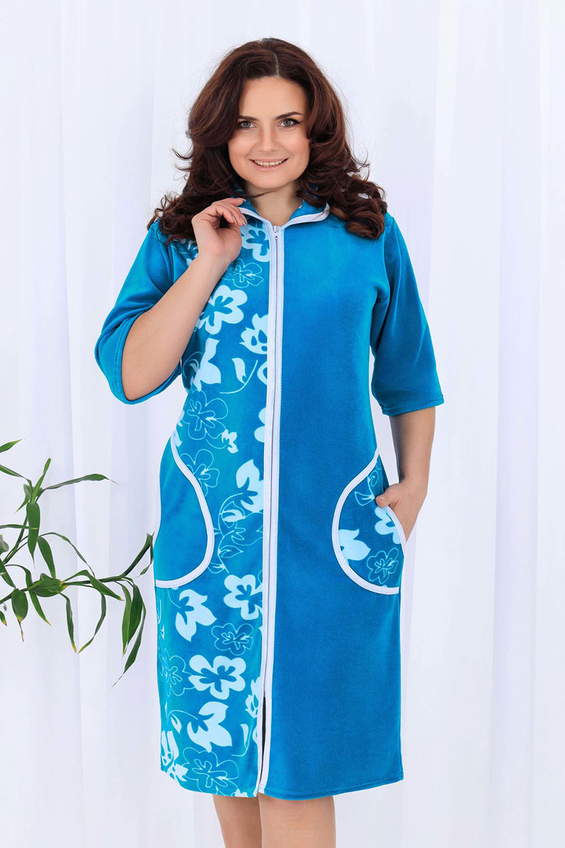 Представляем Вашему вниманию удобный и практичный халат на молнии. Рукав короткий, длина ниже колена, в боковых швах два полупояса, воротник круглый. Такое изделие станет любимой вещью в гардеробе.