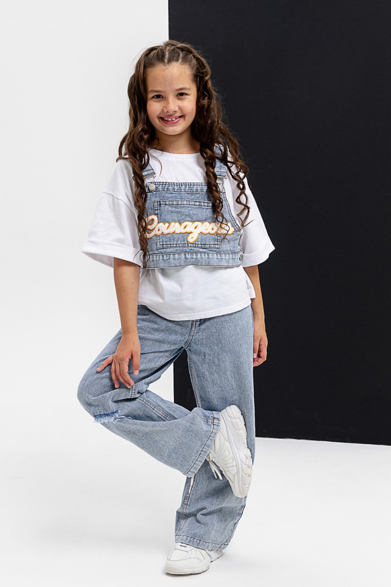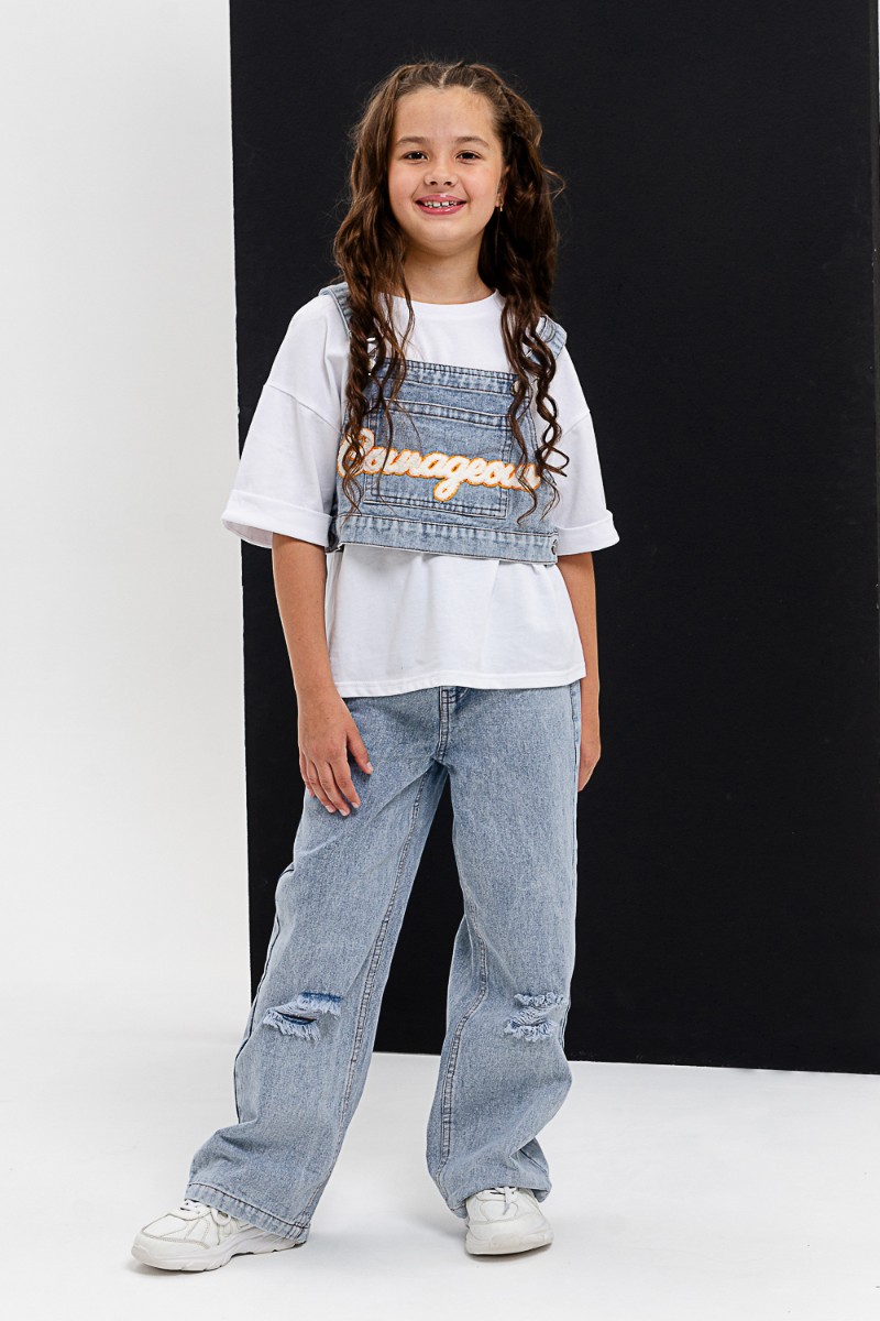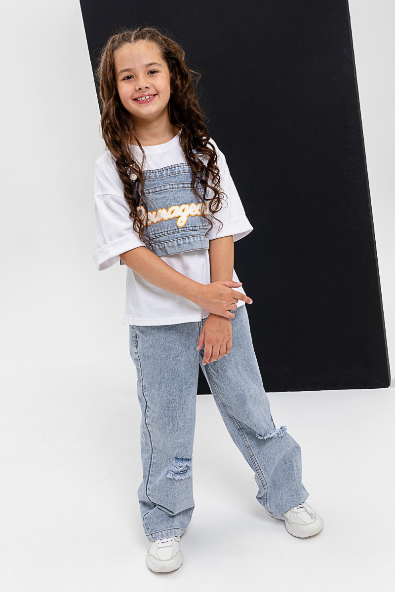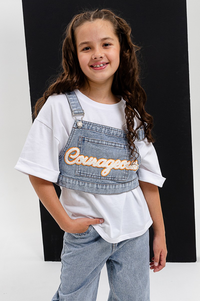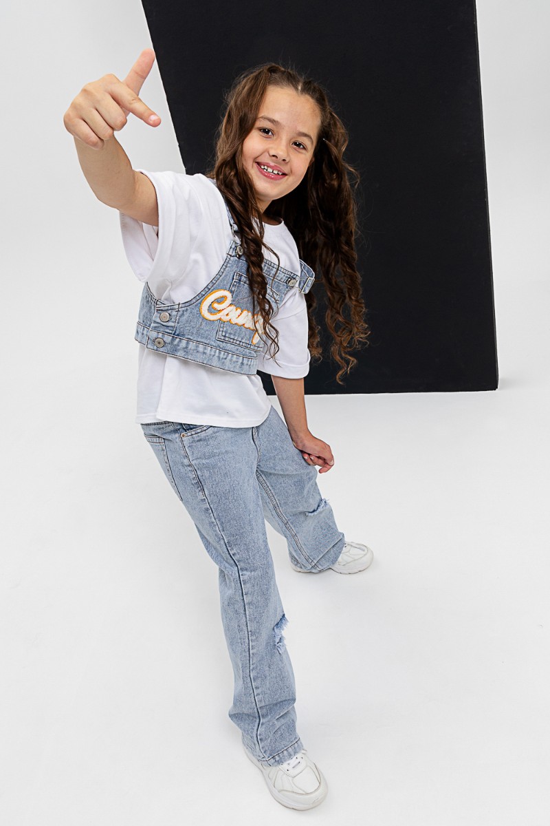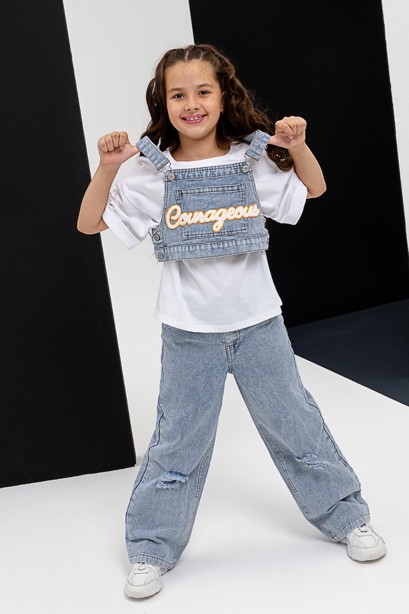 Представляем Вашему вниманию костюм тройка для девочки, состоящий из футболки, жилета и брюк. Футболка оверсайз из 100% хлопка. Жилетка и джинсы из плотной ткани джинс. На жилетке вышивка.