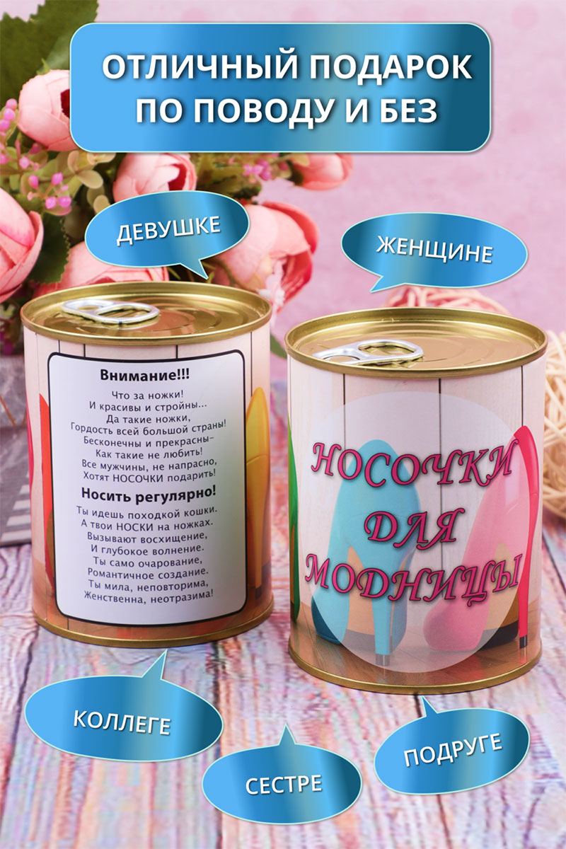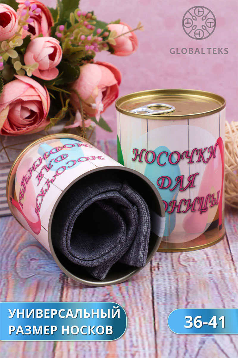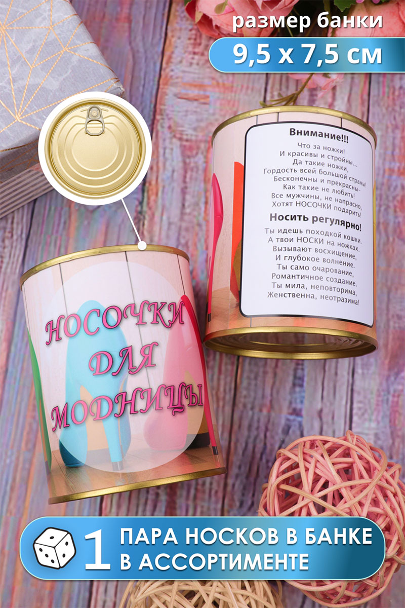 Представляем Вашему вниманию женские носки в банке — отличный подарок! Герметично упакованные в банку женские носки мягкие, максимально хлопковые и прочные. Носки в подарочной упаковке всегда пригодятся, благодаря интересному дизайну их можно использовать как подарки коллегам. А еще носки внутри банки отличного качества! Носки женские - отличный, уже упакованный подарок для подруг, близких и родных, который не требует от вас дополнительной изобретательности! В банке одна пара цветных носков. Цвет носков - сюрприз!