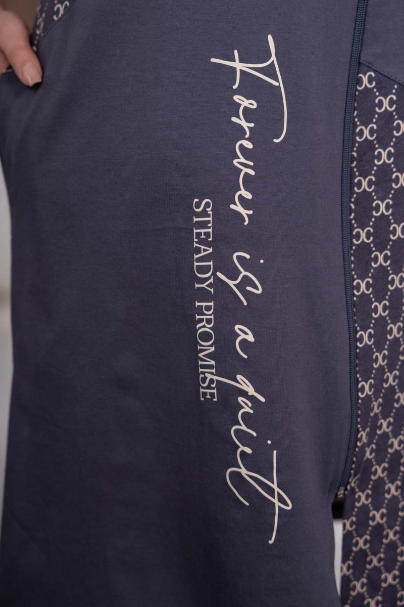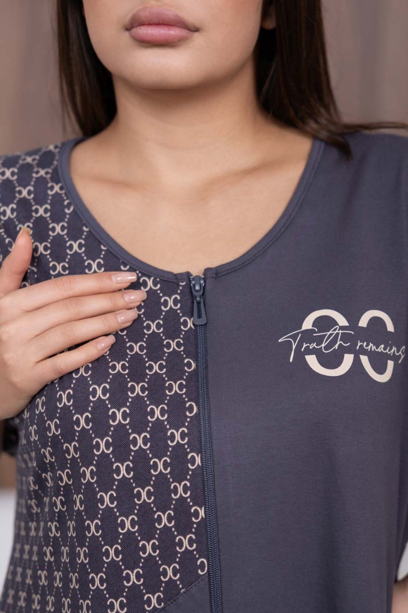 Представляем Вашему вниманию женский комбинированный халат с принтом на молнии. Халат прямого силуэта с о-образной горловиной и карманами в боковых швах.