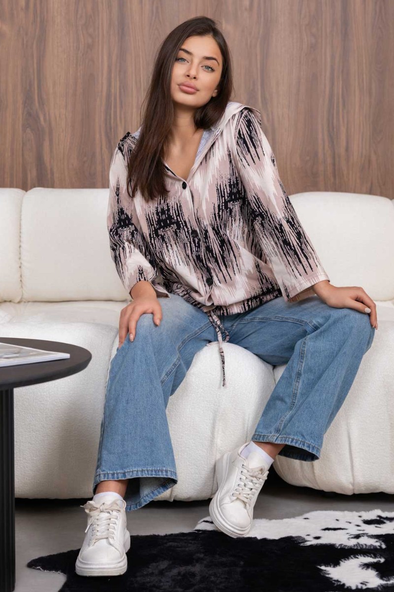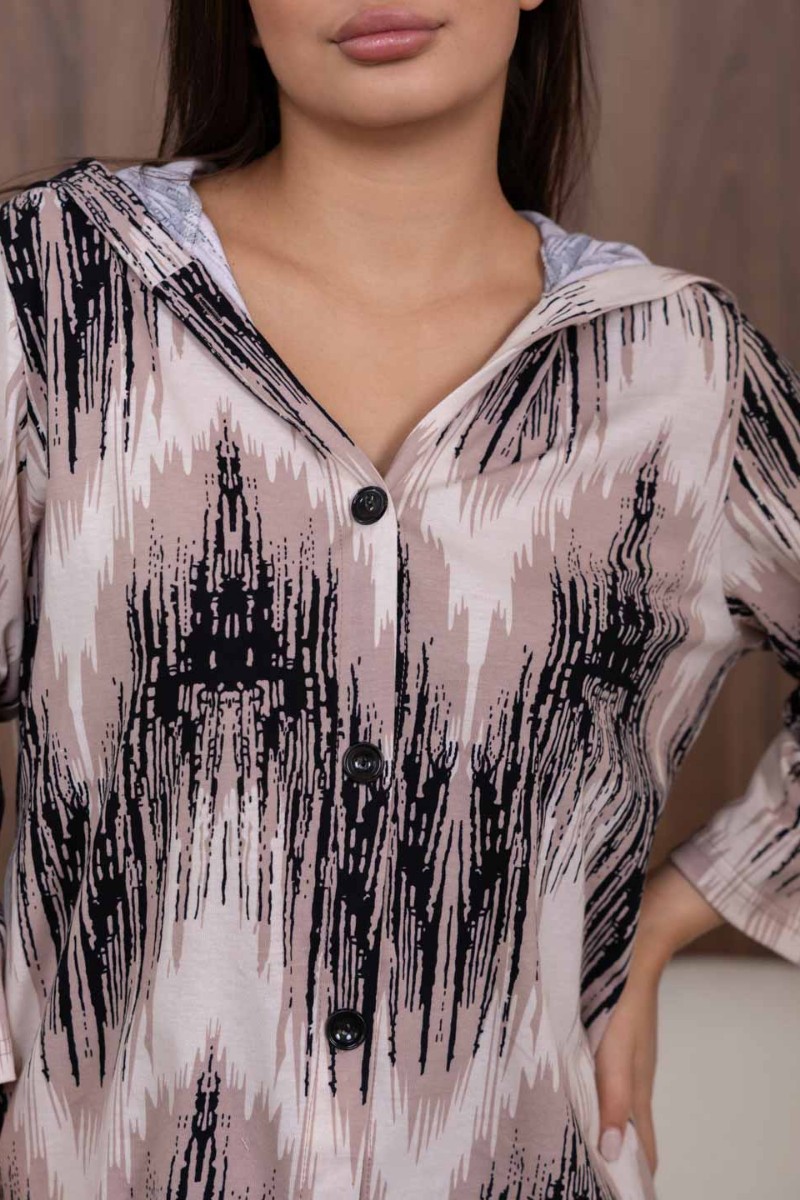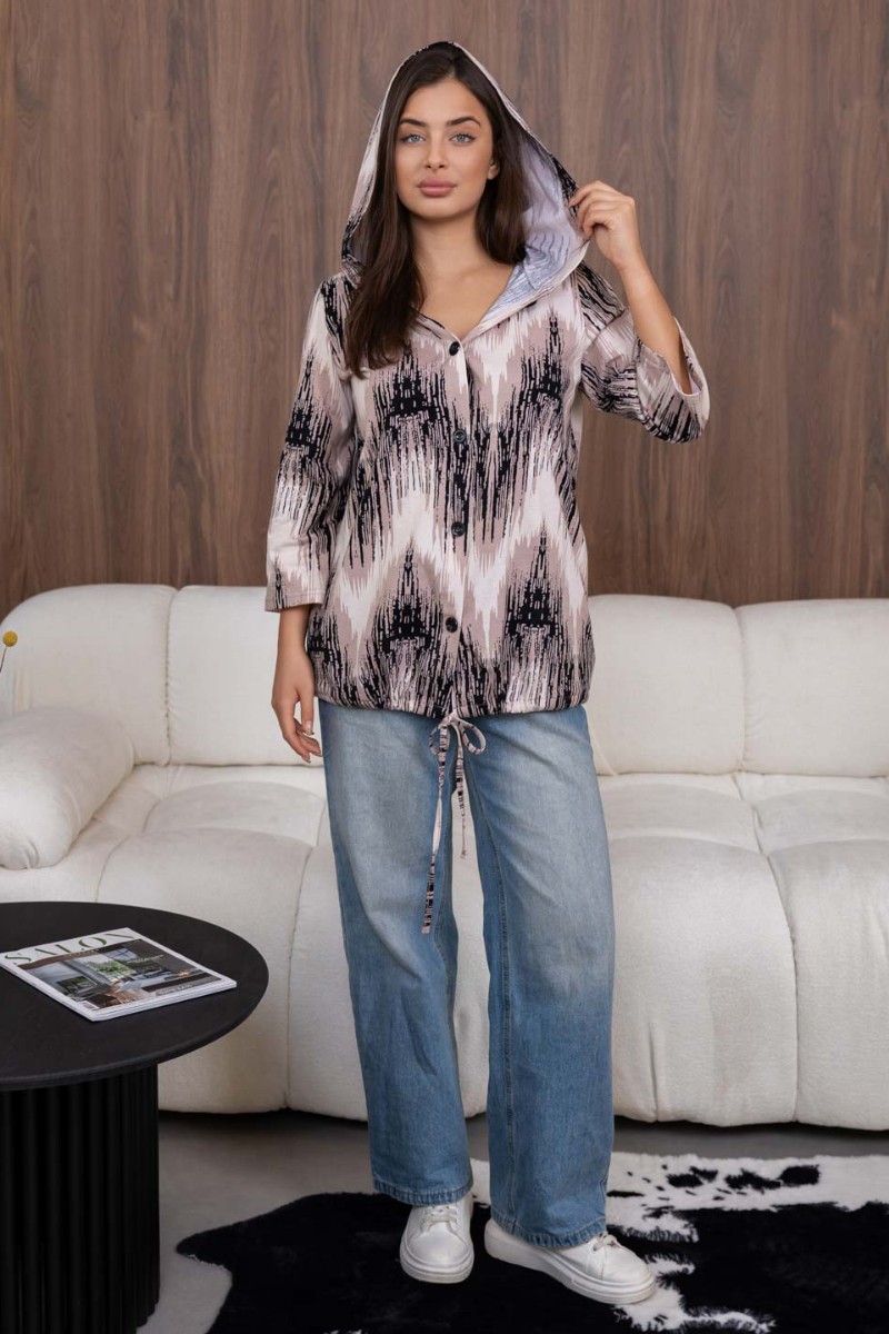Представляем Вашему вниманию женскую рубашку с капюшоном, сшитую из 100% хлопка. Модель на пуговицах и кулиске, с рукавом 3/4. Туника выполнена из набивной кулирки турецкого качества.