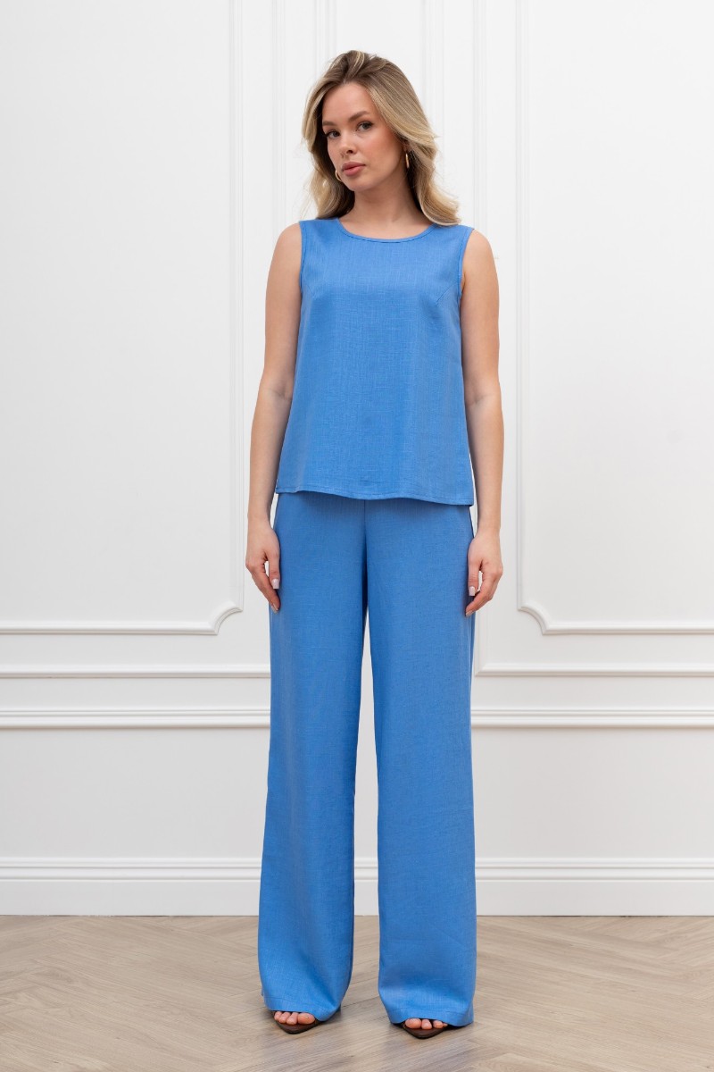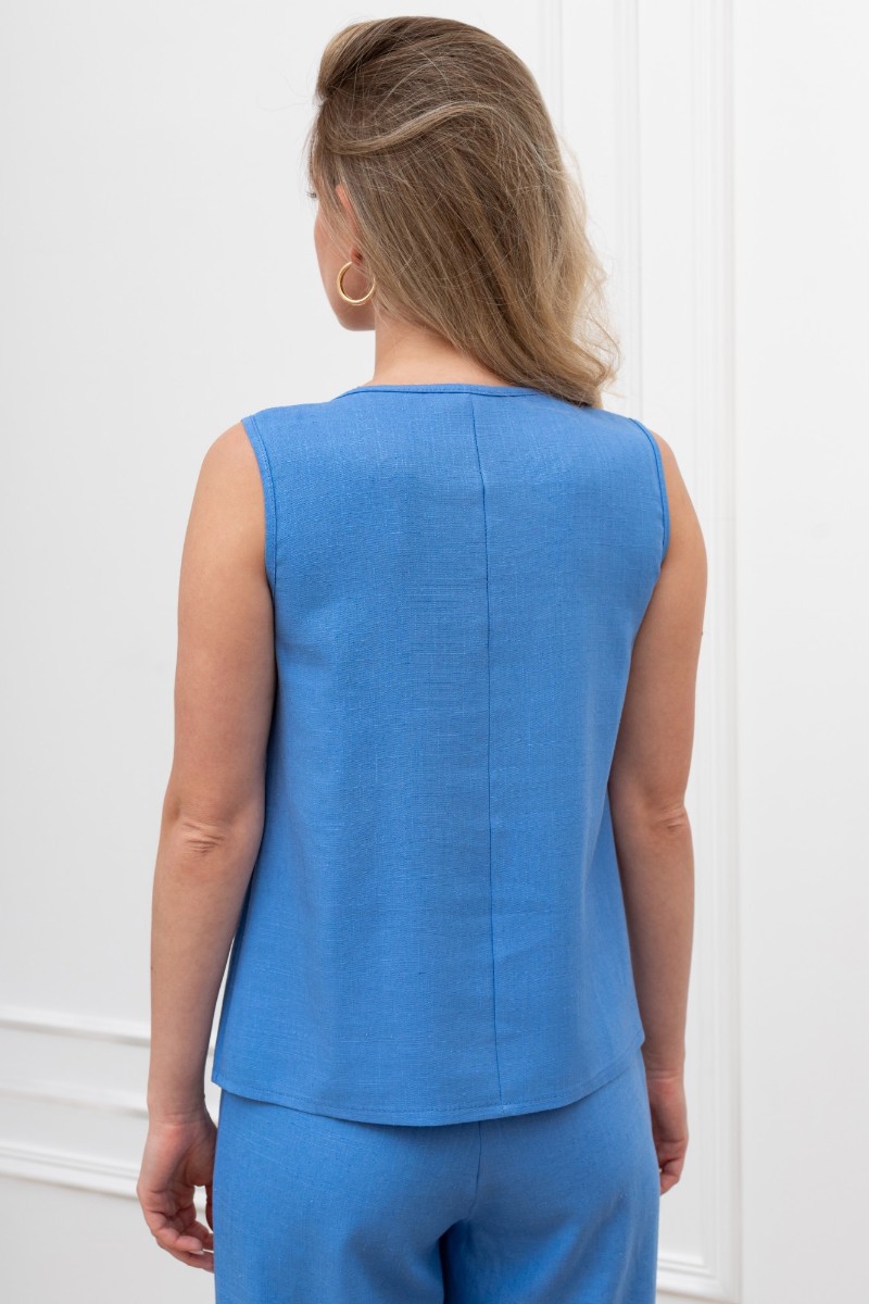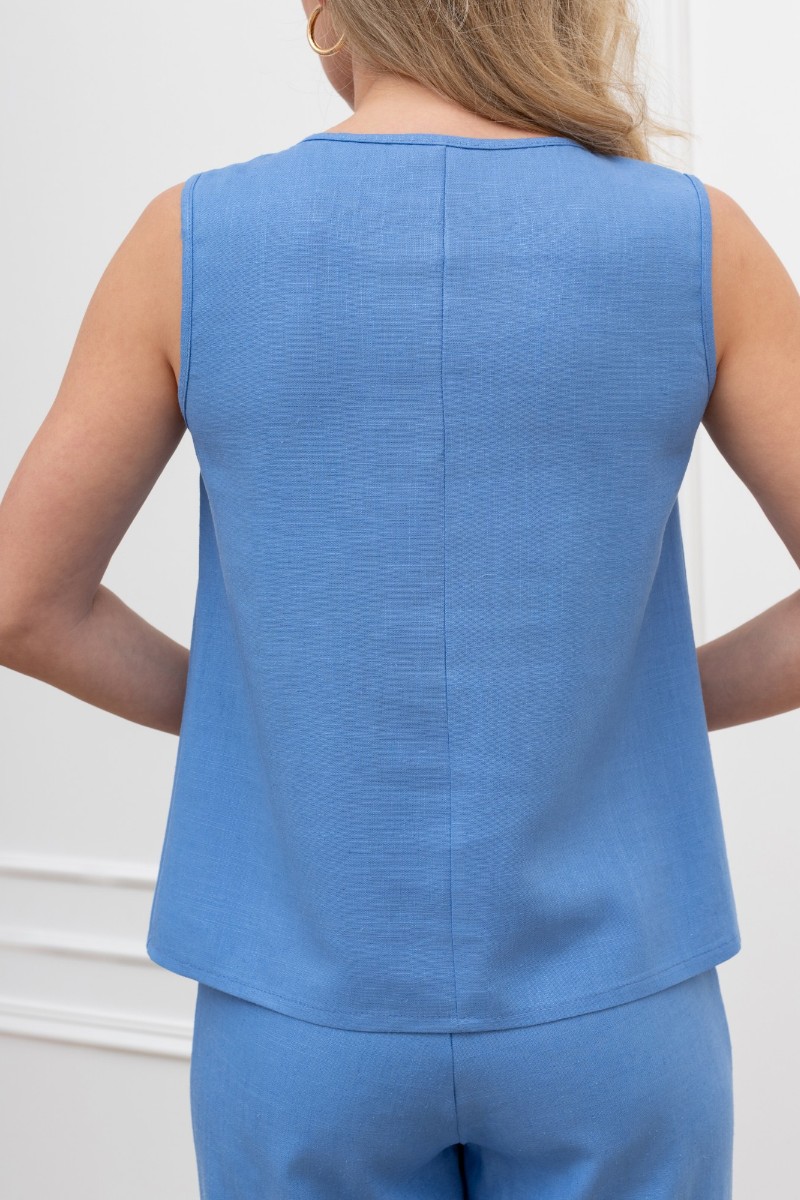 Представляем Вашему вниманию женскую блузку-топ из гладкокрашеного тканого полотна, полуприталенного силуэта, без рукавов, с горловиной овальной формы. Горловина и проймы окантованы основным материалом.