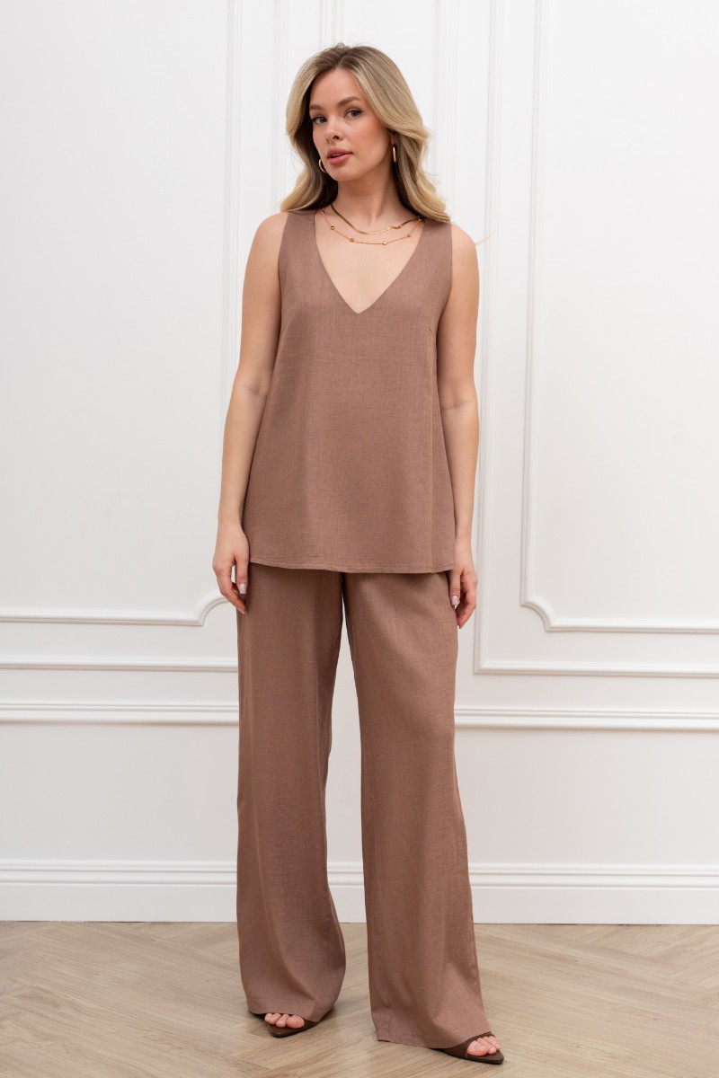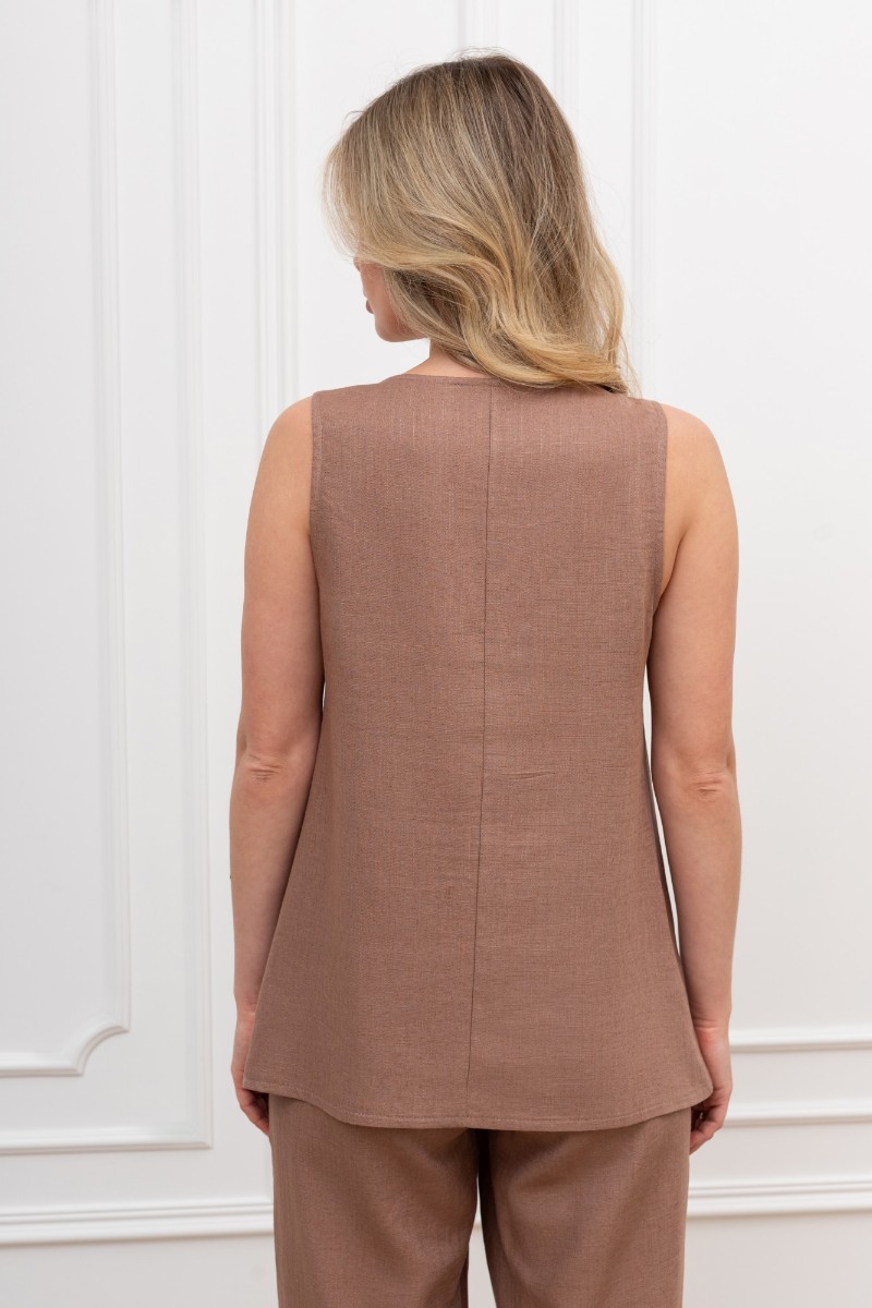 Представляем Вашему вниманию женскую блузку из гладкокрашеного тканого полотна, свободного силуэта, без рукавов, слегка расширенная к низу, с глубокой горловиной V-образной формы, вытачками в области груди.