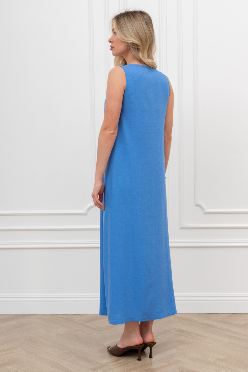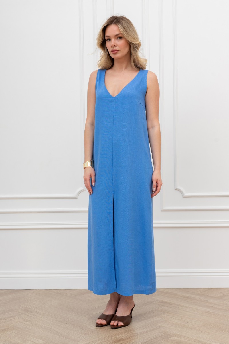 Представляем Вашему вниманию платье женское из гладкокрашеного тканого полотна, свободное, слегка расширенное к низу, с глубоким V-образным вырезом горловины, обработанным внутренней обтачкой, без рукавов, с вытачками в области груди. Перед состоит из двух частей, в шве соединения деталей по центру длинный разрез.