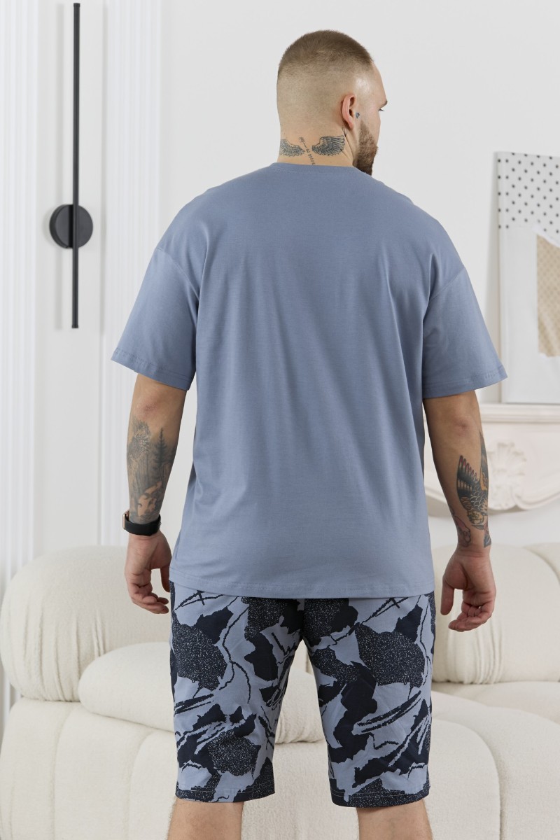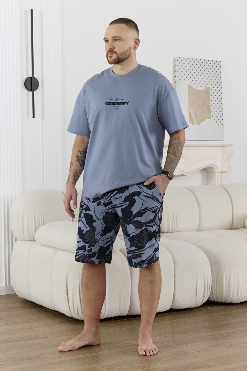 Представляем Вашему вниманию костюм мужской, состоящий из футболки и шорт. Футболка однотонная с принтом на груди; модель свободная, со спущенной линией плеч, втачными рукавами, овальным вырезом горловины. Шорты из полотна с набивным рисунком эксклюзивного дизайна, с боковыми карманами с обтачными входами, на притачном поясе с отстроченной эластичной тесьмой.