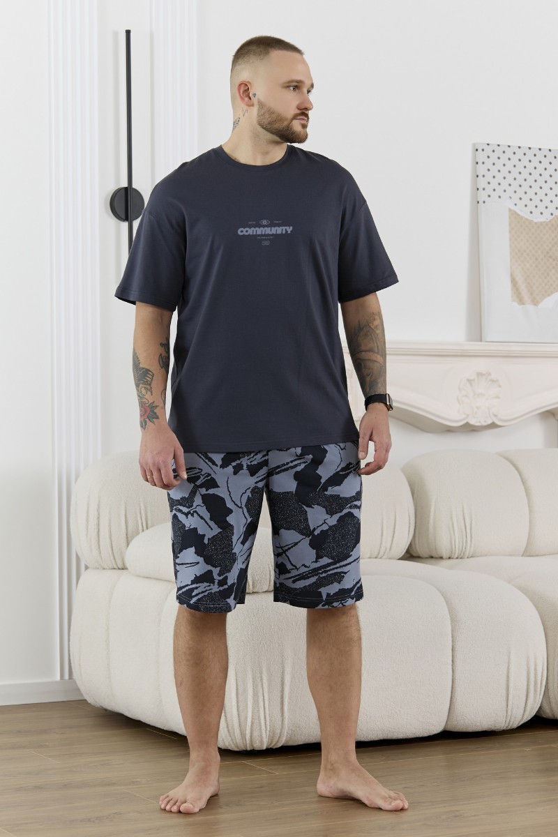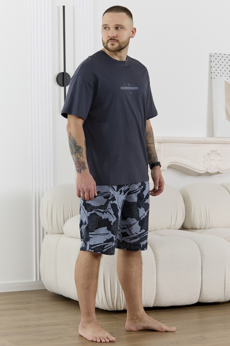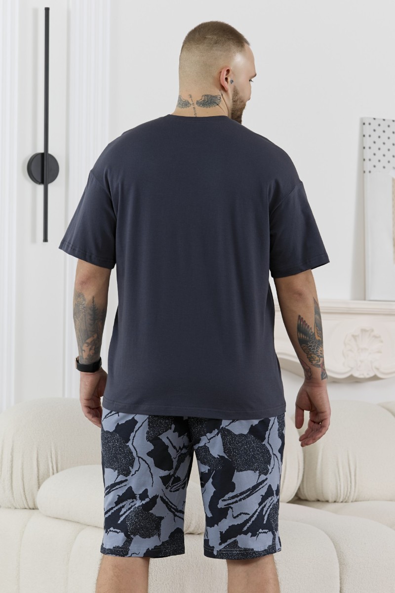 Представляем Вашему вниманию костюм мужской, состоящий из футболки и шорт. Футболка однотонная с принтом на груди; модель свободная, со спущенной линией плеч, втачными рукавами, овальным вырезом горловины. Шорты из полотна с набивным рисунком эксклюзивного дизайна, с боковыми карманами с обтачными входами, на притачном поясе с отстроченной эластичной тесьмой.
