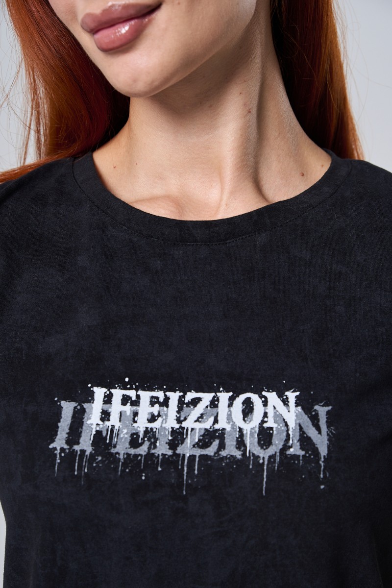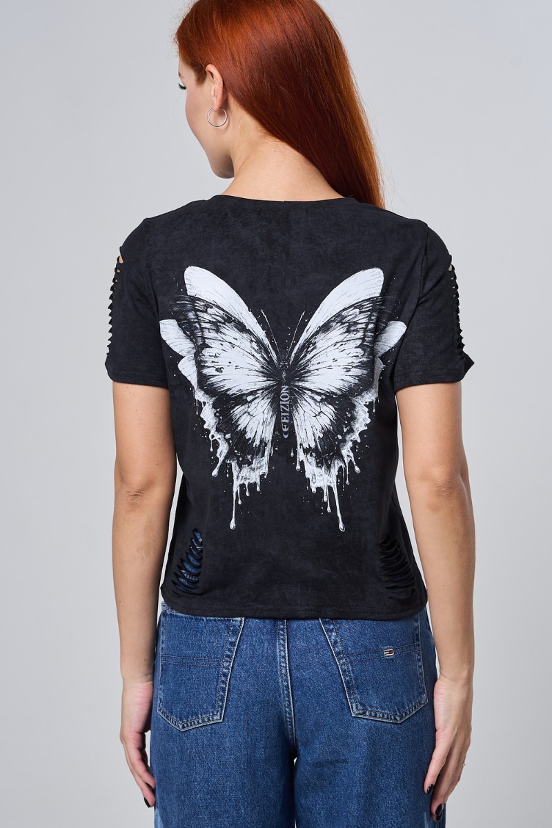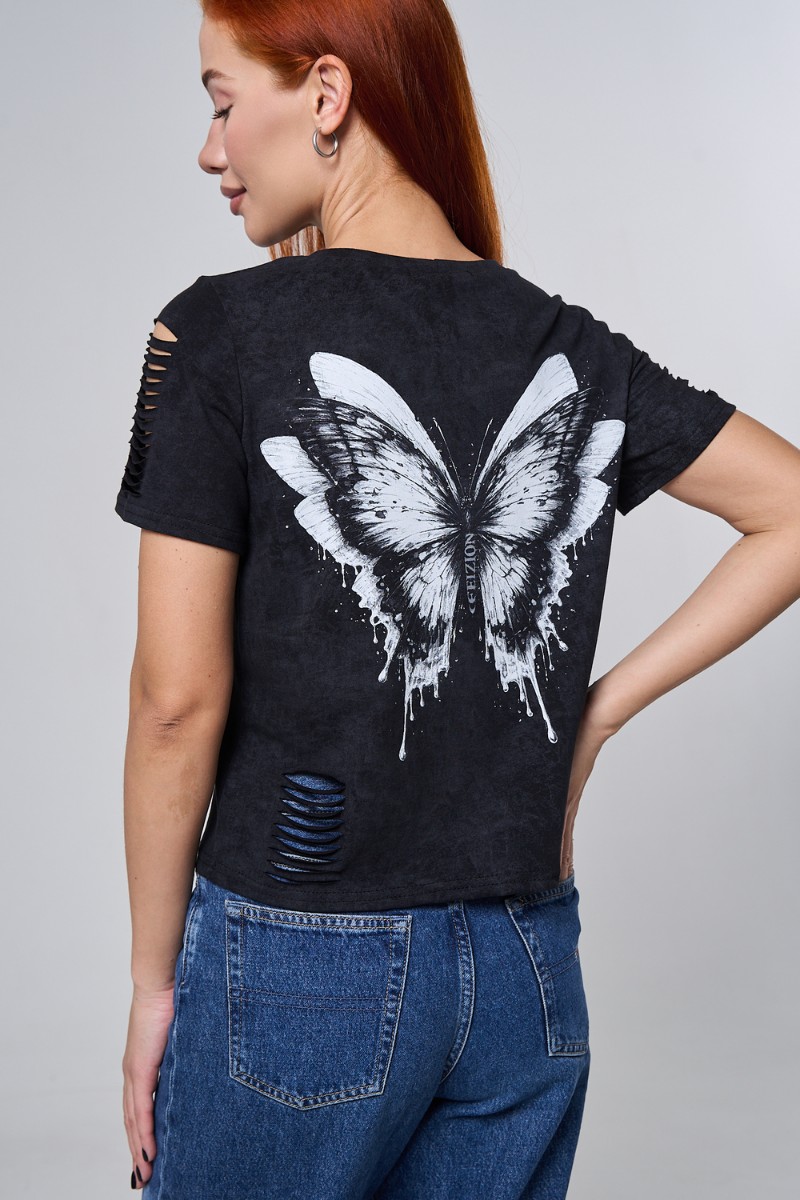 Футболка женская №7502 кулирка с лайкрой (р-ры: 42-52) черный винтаж-бабочка