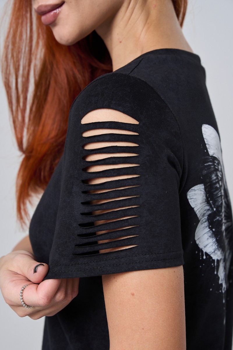 Представляем Вашему вниманию чёрную футболку с эффектным принтом на спине — это больше, чем просто одежда. Дерзкие прорези по рукавам добавляют характер и индивидуальность вашему образу. Бабочка, величественный собор, вдохновляющая надпись “Dream Big Act Now” или яркая люстра — выберите тот мотив, который отражает вашу энергию и характер! Стильный винтажный эффект ткани и свободный крой идеально сочетаются с любимыми джинсами или шортами. Созданы для тех, кто не боится выделяться и воплощать свои мечты в повседневной жизни!