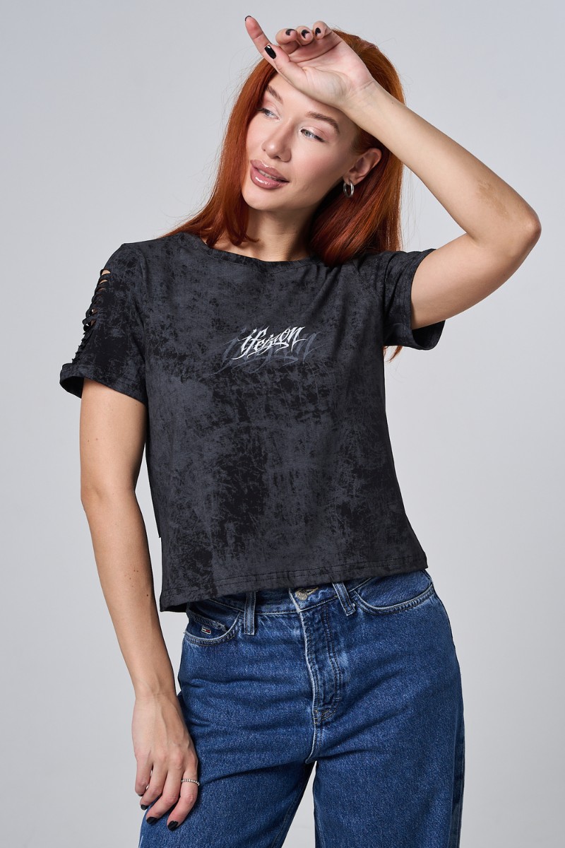 Футболка женская №7502 кулирка с лайкрой (р-ры: 42-52) черный винтаж-надпись
