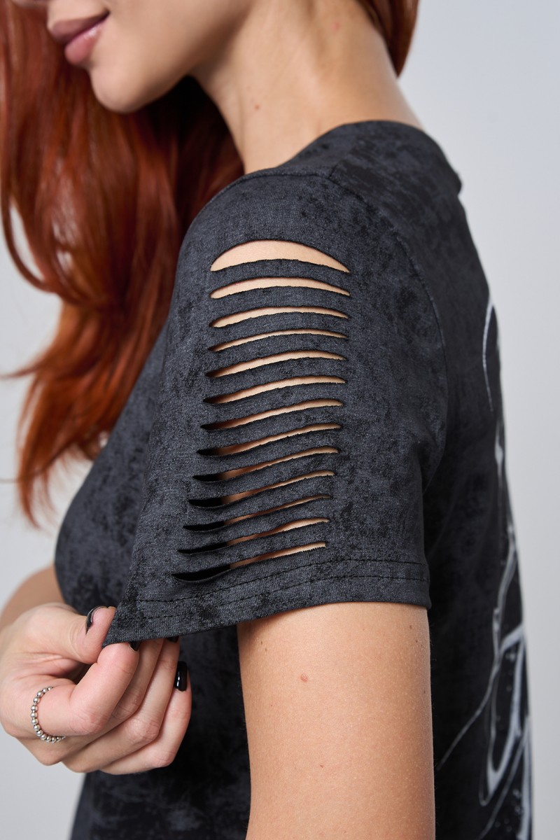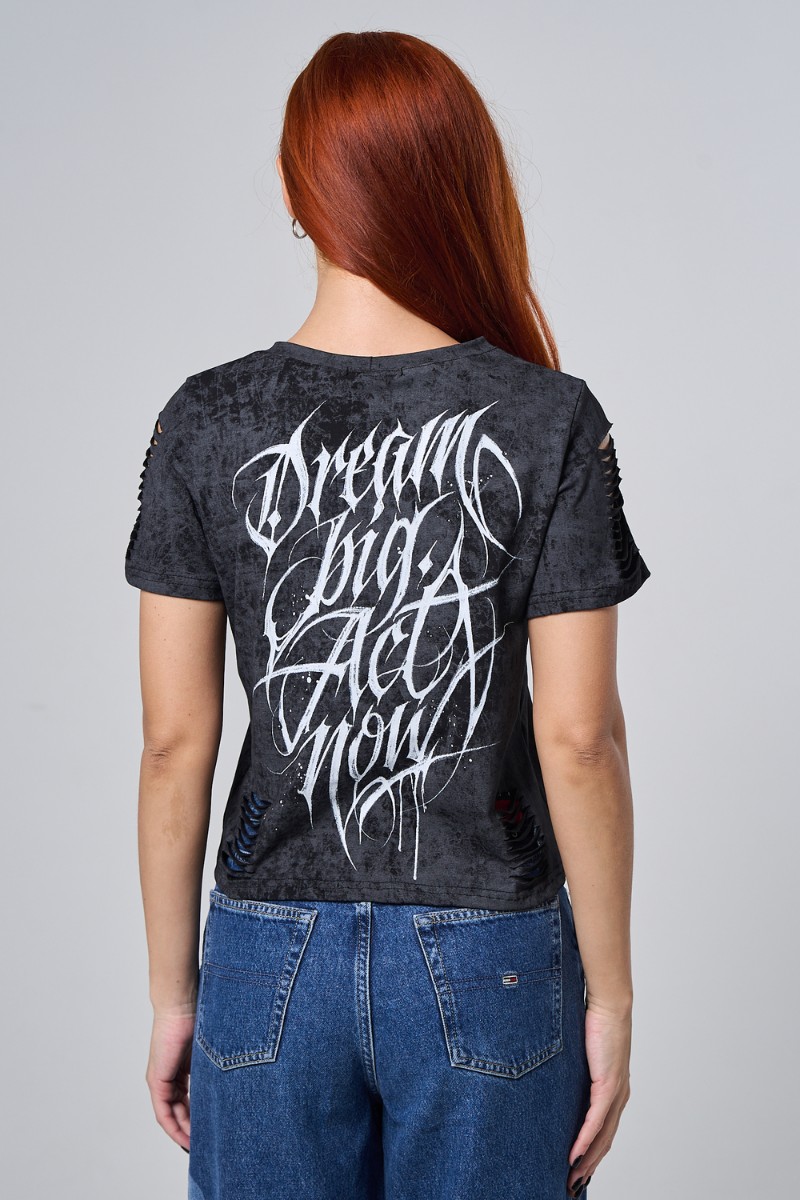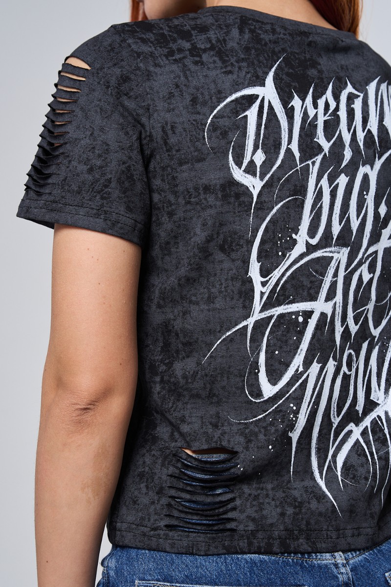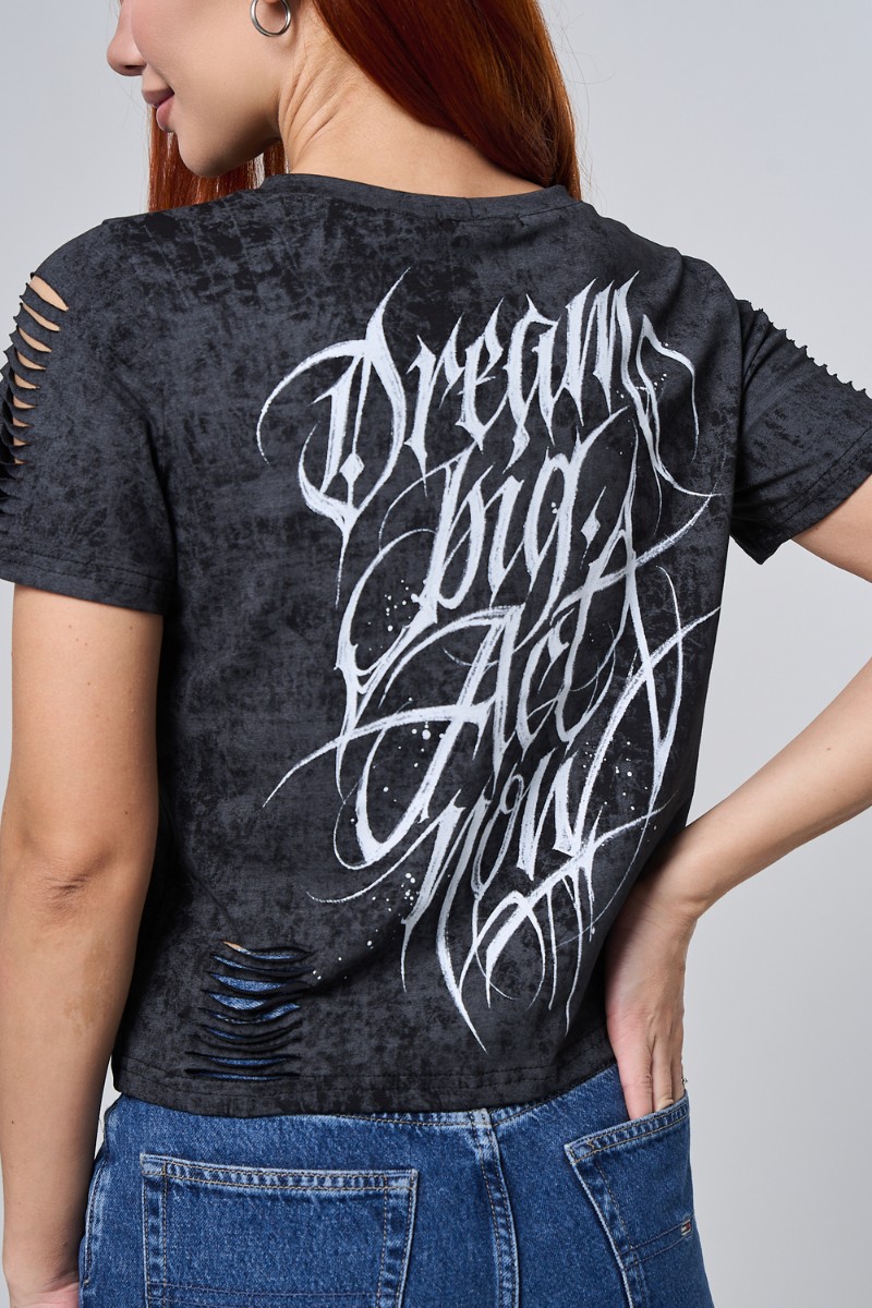 Представляем Вашему вниманию чёрную футболку с эффектным принтом на спине — это больше, чем просто одежда. Дерзкие прорези по рукавам добавляют характер и индивидуальность вашему образу. Бабочка, величественный собор, вдохновляющая надпись “Dream Big Act Now” или яркая люстра — выберите тот мотив, который отражает вашу энергию и характер! Стильный винтажный эффект ткани и свободный крой идеально сочетаются с любимыми джинсами или шортами. Созданы для тех, кто не боится выделяться и воплощать свои мечты в повседневной жизни!