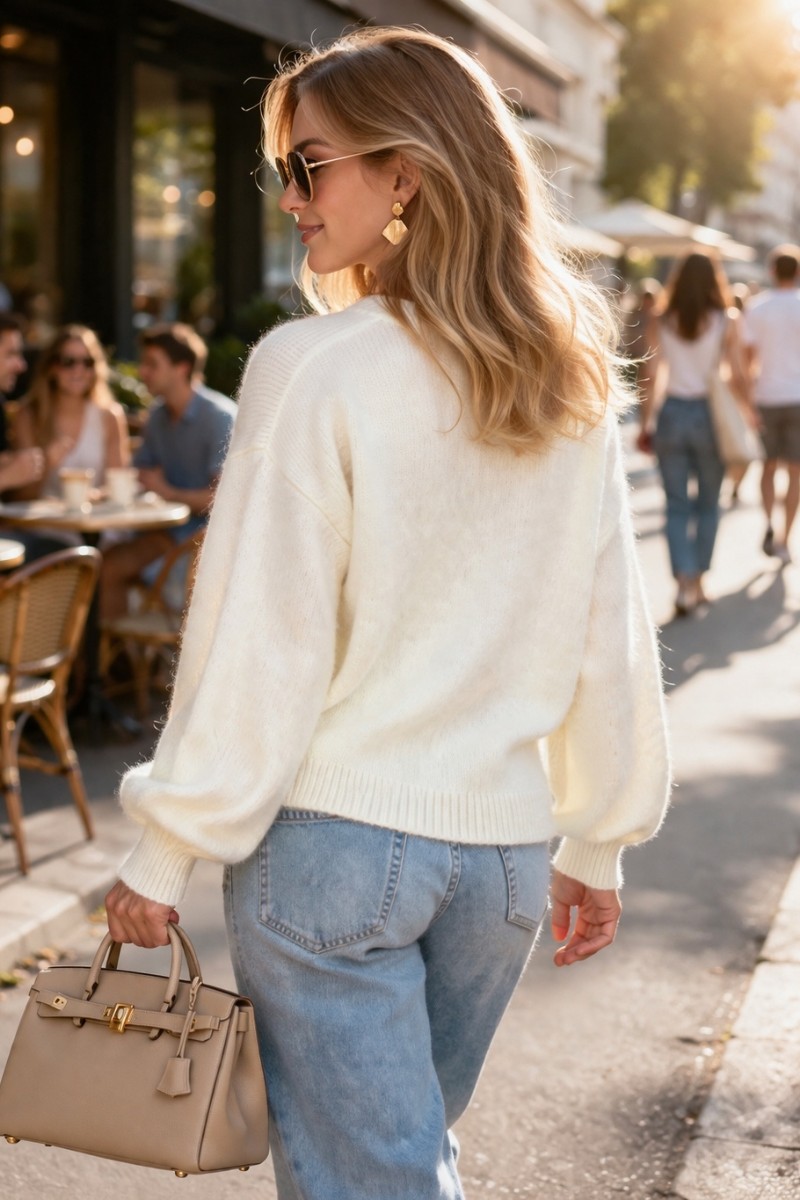 Главная изюминка модели — рукав-фонарик объемного кроя. Такая деталь придает джемперу романтичности и игривости, создавая актуальный силуэт в стиле современной классики. Объемные рукава собраны на эластичные манжеты с резинкой, что обеспечивает удобную посадку и комфорт в носке. Спущенная линия плеча и свободный крой по корпусу создают расслабленный, непринужденный образ.
