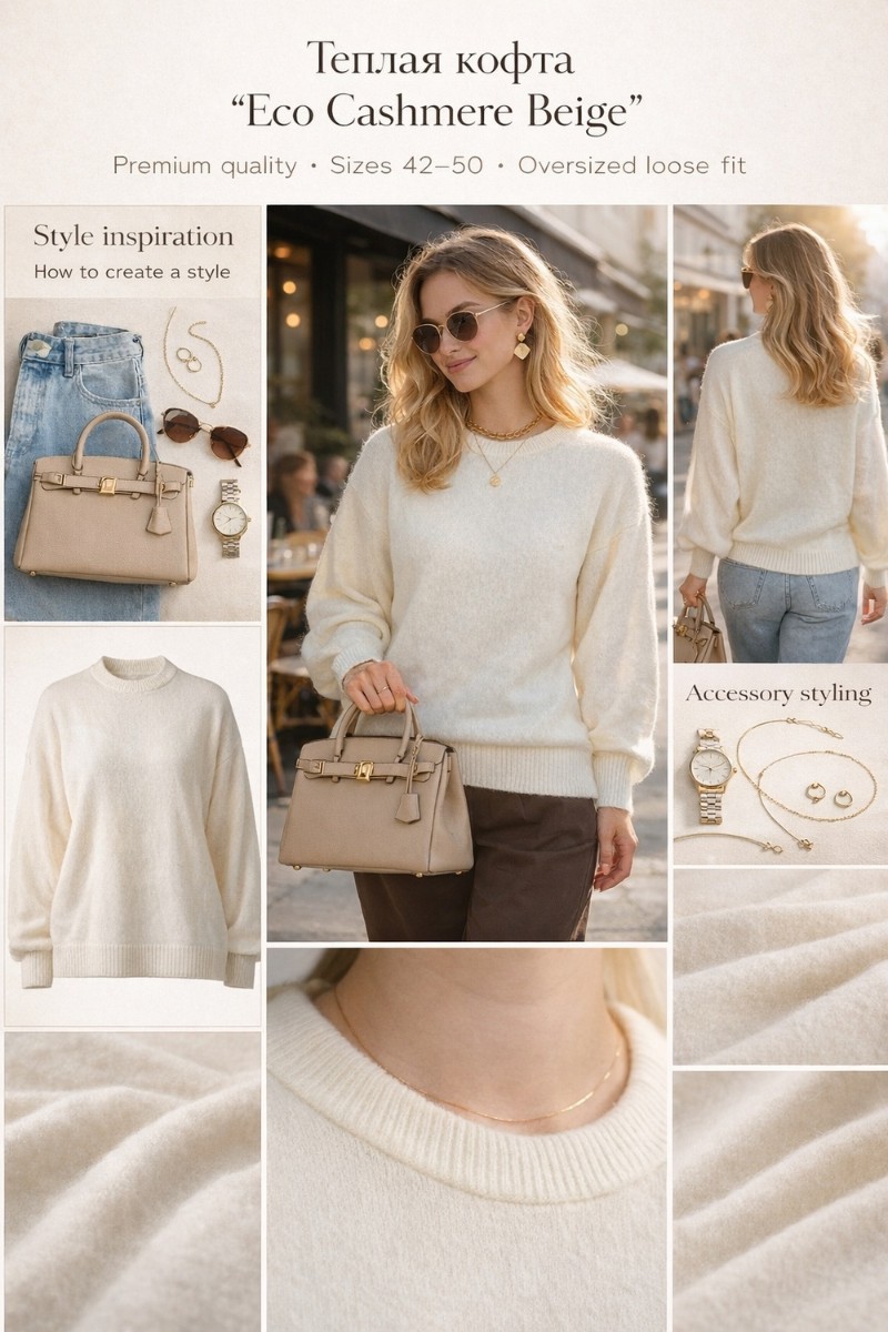 Представляем Вашему вниманию джемпер оверсайз с рукавом-фонарик, сшитый из качественного материала «эко-кашемир» — мягкой акриловой пряжи премиум-класса, которая по своим тактильным ощущениям и внешнему виду практически неотличима от натурального кашемира. Эта модель идеально сочетает в себе комфорт, стиль и доступную роскошь.