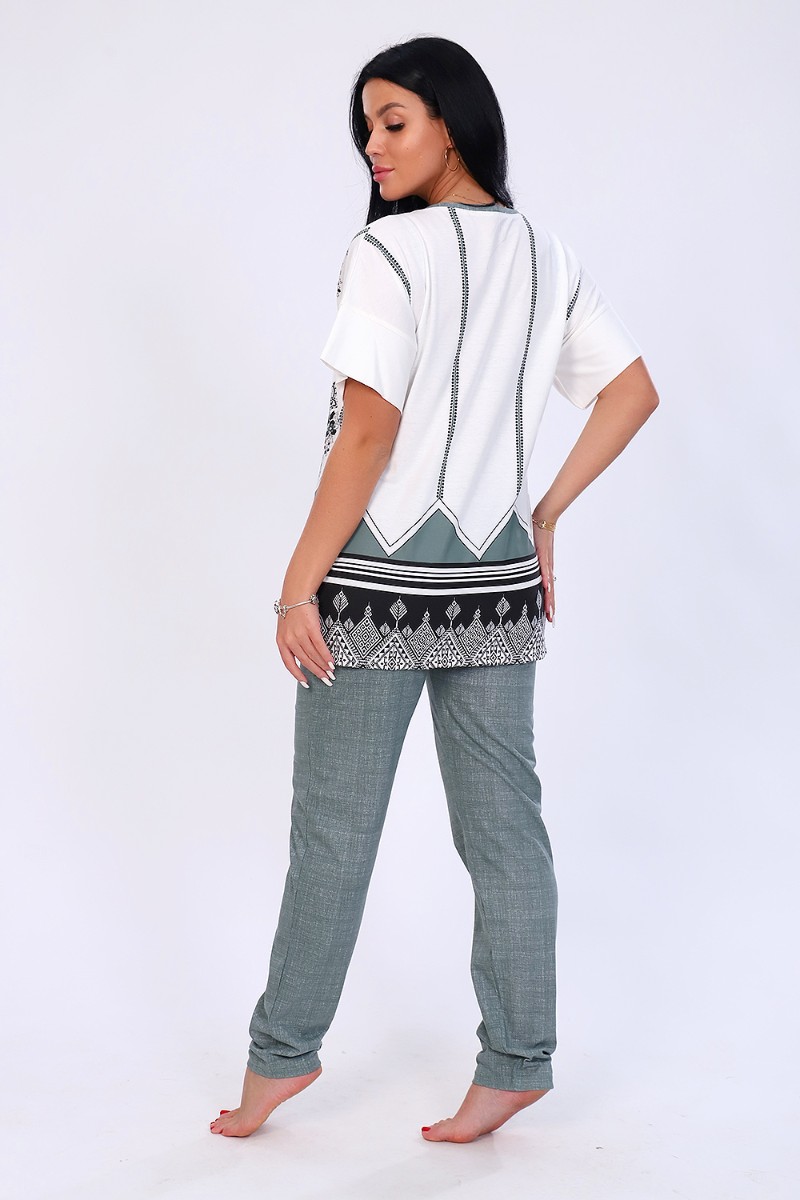 Представляем Вашему вниманию мягкий, уютный женский костюм двойку из 100% хлопка. Костюм состоит из кофты с короткими рукавами и брюк. На кофте выполнен оригинальный принт в стиле восточных мотивов, который будет ярким и качественным даже после многочисленных стирок. Брюки сшиты из яркой, качественной, натуральной трикотажной ткани. Костюм идеально подойдет для прогулок, занятий спортом или для повседневной носки. В этом костюме вам будет очень удобно, при этом вы будете себя чувствовать комфортно и расслабленно.