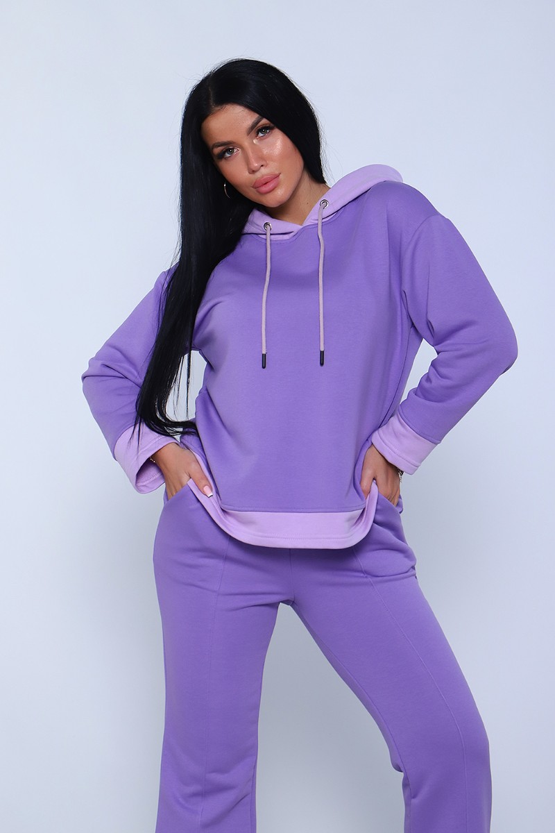 Представляем Вашему вниманию элегантный женский костюм полуприлегающего силуэта, состоящий из худи и брюк, сшитый из трикотажного полотна премиум качества - футер 3-х нитка петля без начеса. Высокое качество ткани обеспечит комфорт и удобство на долгое время. Хлопковая изнаночная сторона изделия дарит комфортные ощущения при ношении костюма. Брюки силуэта клеш с широким поясом с декоративной отсрочкой и с отстроченной стрелкой на передней половине брюк, что "вытягивает" силуэт и визуально делает ноги длиннее, что добавляет женственности образу. В боковых швах брюк расположены карманы с отрезным бочком. Худи прямое, свободное с длинными рукавами. Низ рукава и низ худи отделаны декоративными манжетами контрастного цвета. Вырез горловины округлый, с двойным капюшоном контрастного цвета в тон манжет. Объём капюшона регулируется декоративным шнурком. Сочетание комфорта и стиля делает этот костюм модным и удобным для каждой девушки и женщины. Идеальный комплект обеспечивает удобную посадку на любую фигуру, позволяет свободно двигаться, гулять, отдыхать и заниматься спортом.