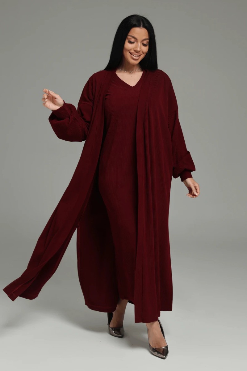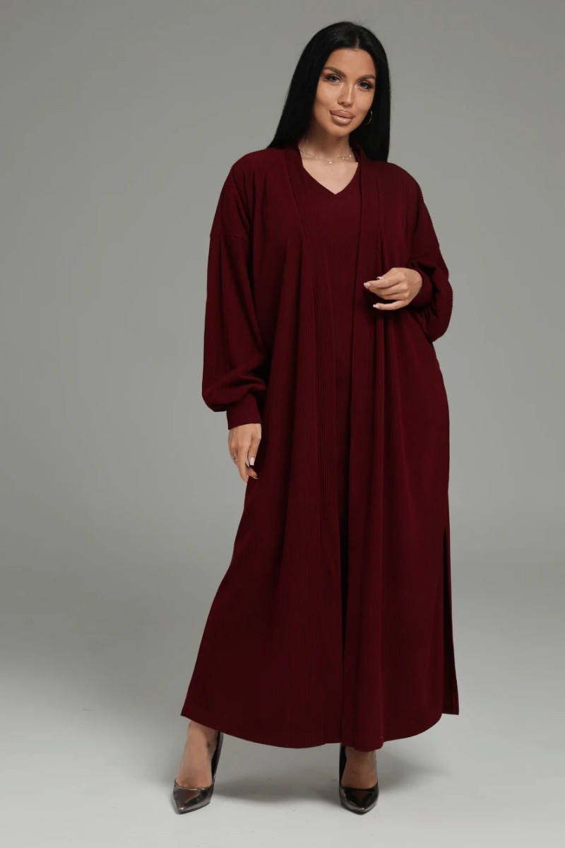 Безупречная посадка: Платье прилегающего кроя повторяет изгибы тела, а свободный кардиган с боковыми разрезами позволяет легко двигаться и создает летящий силуэт.