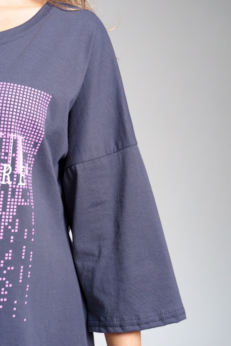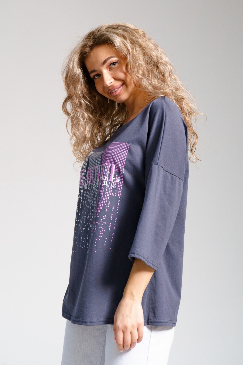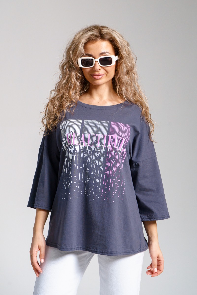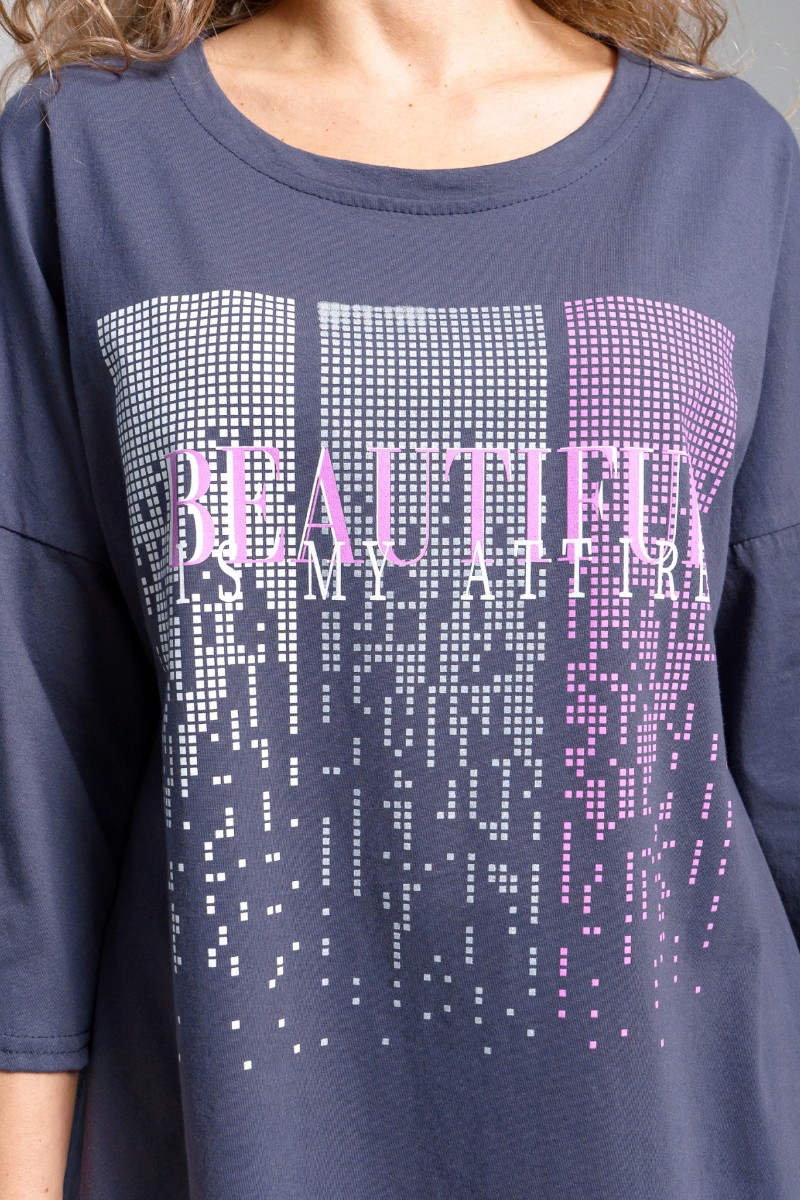 Представляем Вашему вниманию легкую женскую футболку из кулирки - 100% натурального, дышащего хлопка. Модель свободного покроя, длиной чуть ниже уровня бедра, со спущенным плечом и рукавом ¾, Перед декорирован оригинальным принтом. По горловине обработана кулиса. Прекрасный вариант нарядной туники на каждый день.