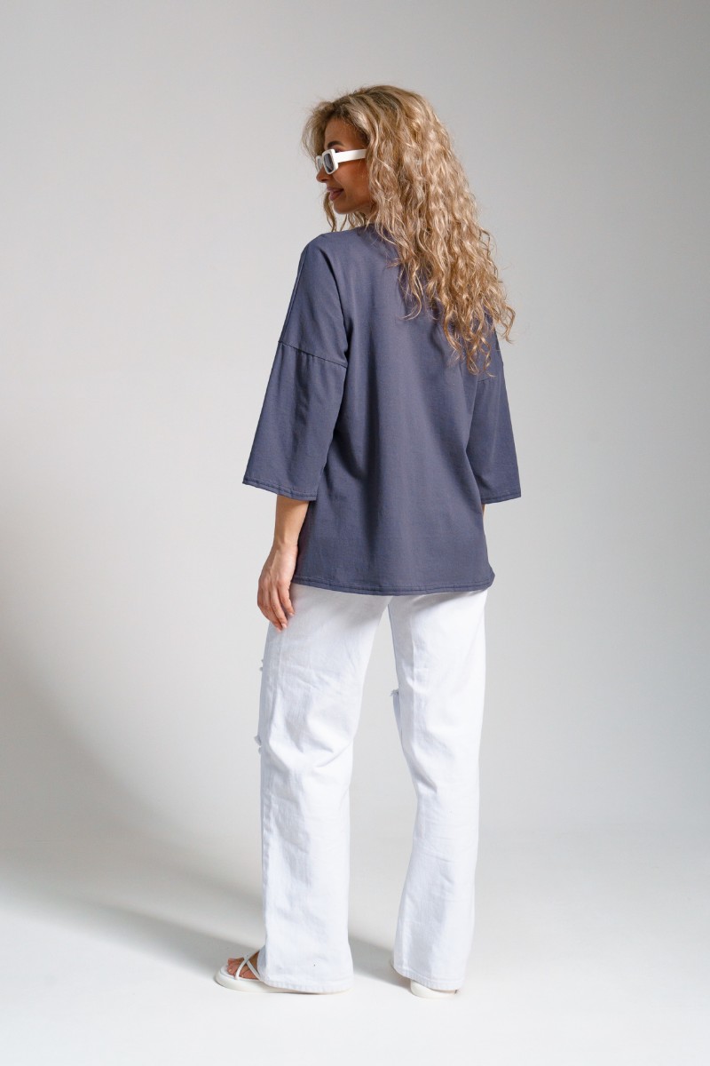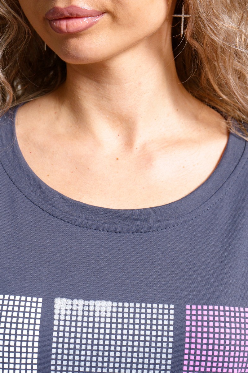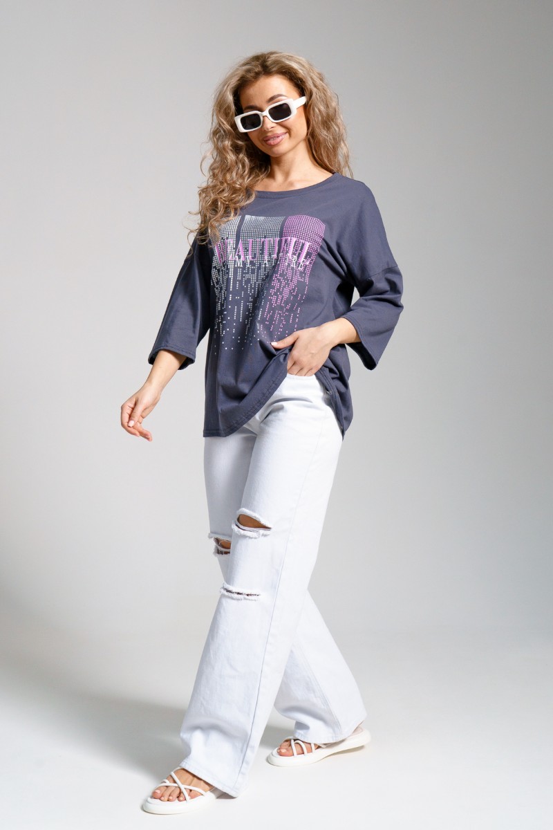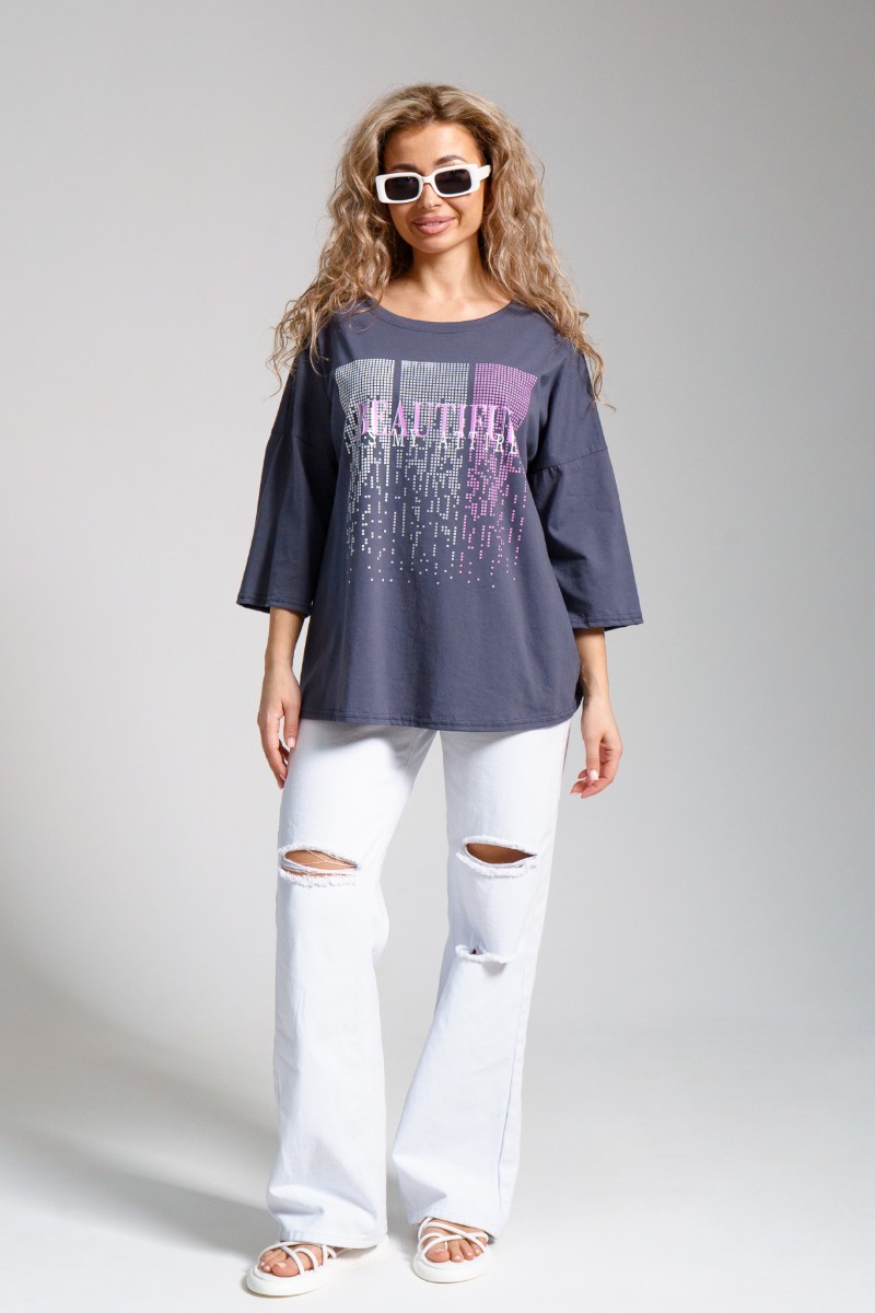 Представляем Вашему вниманию легкую женскую футболку из кулирки - 100% натурального, дышащего хлопка. Модель свободного покроя, длиной чуть ниже уровня бедра, со спущенным плечом и рукавом ¾, Перед декорирован оригинальным принтом. По горловине обработана кулиса. Прекрасный вариант нарядной туники на каждый день.