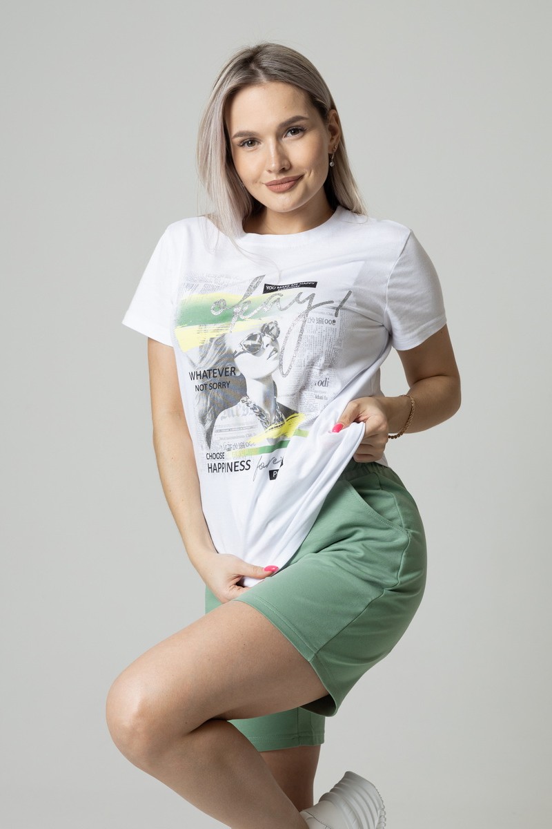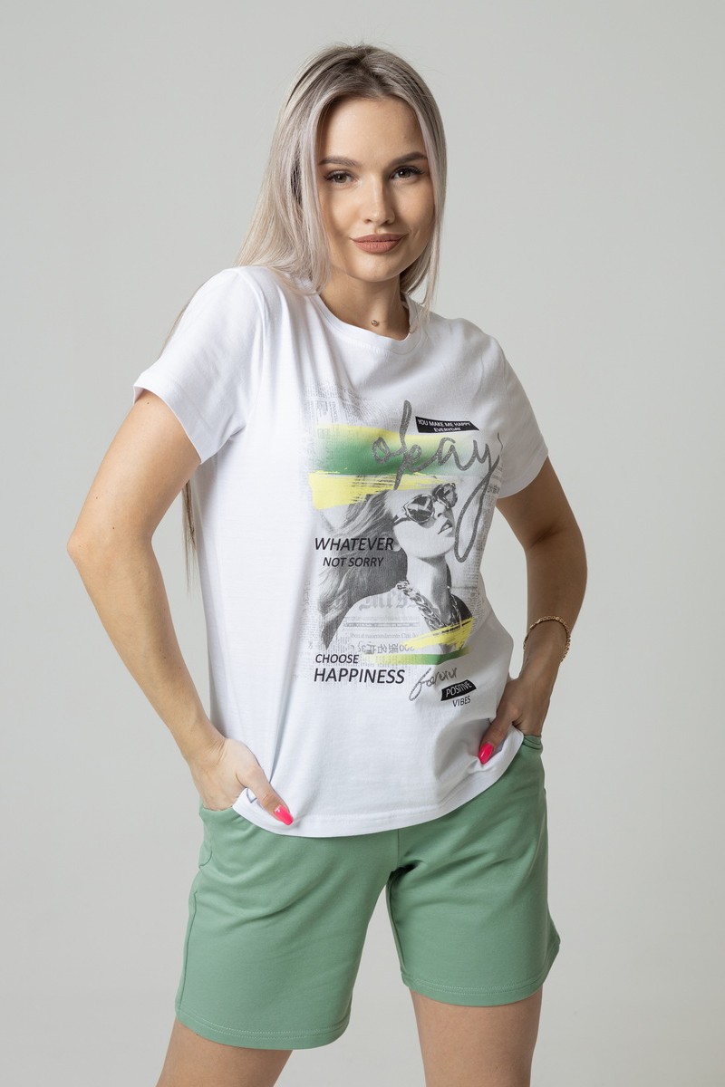 Представляем Вашему вниманию стильный женский костюм двойку, состоящий из футболки и шортов классической длины, дополненных небольшими карманами по бокам. Комплект сшит из приятного телу, высококачественного материала, который отлично пропускает воздух, позволяя коже дышать.