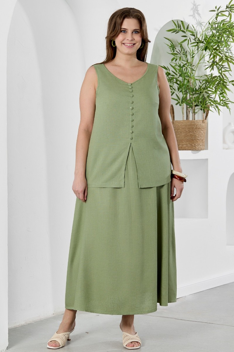 Представляем Вашему вниманию женскую блузку-топ из гладкокрашеного тканого полотна, полуприталенного силуэта, без рукавов, с V-образной горловиной и вытачками в области груди. Перед состоит из двух частей, в шве соединения деталей разрез. От горловины до разреза пришиты декоративные пуговицы имитирующие застежку. Горловина и проймы окантованы основным материалом.