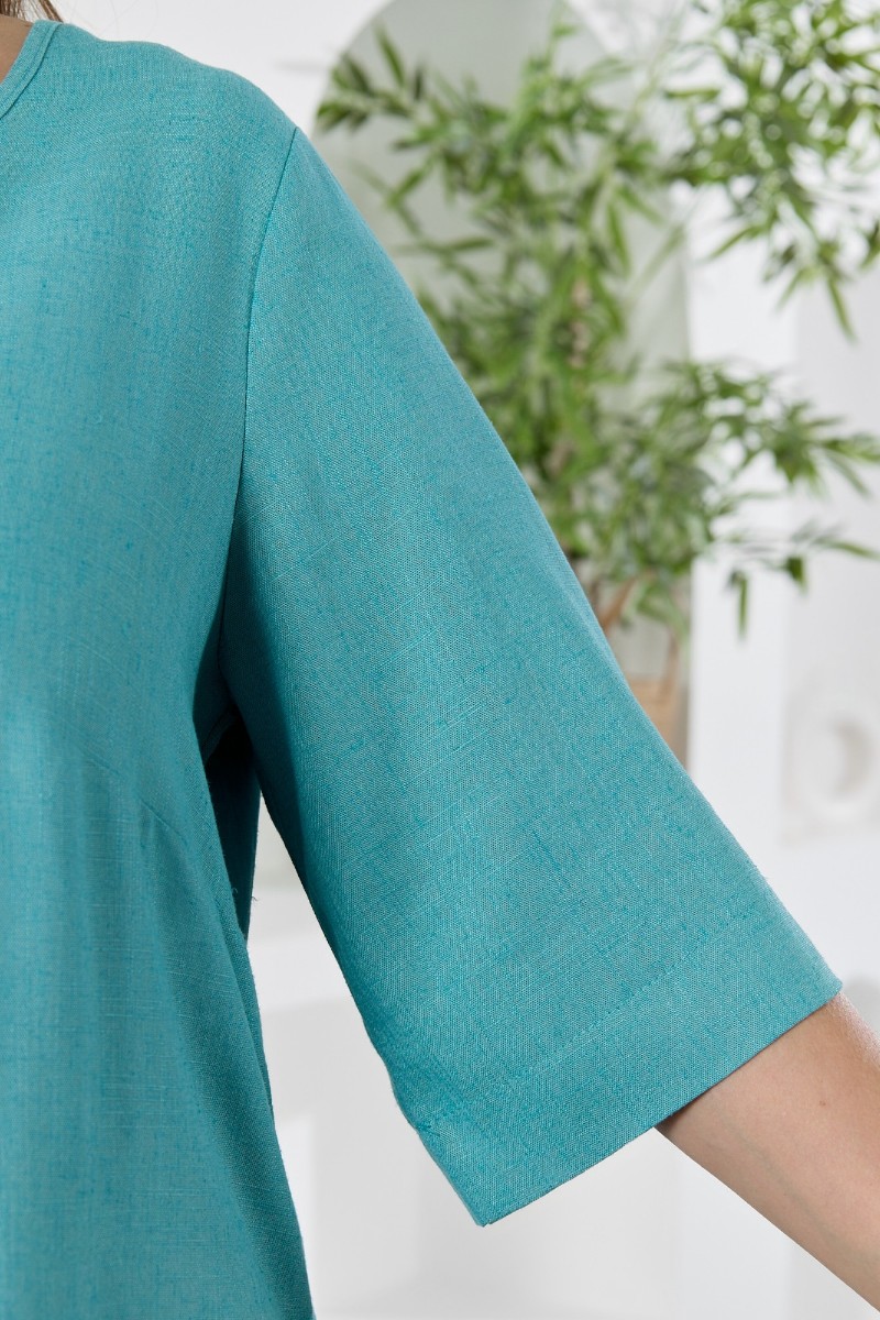 Представляем Вашему вниманию женское платье из гладкокрашеного тканого полотна, свободное,слегка расширенное к низу, с горловиной овальной формы, короткими втачными рукавами, вытачками в области груди, карманами в боковых швах. Перед состоит из двух частей, в шве соединения деталей по центру разрез, горловина окантована основным материалом.