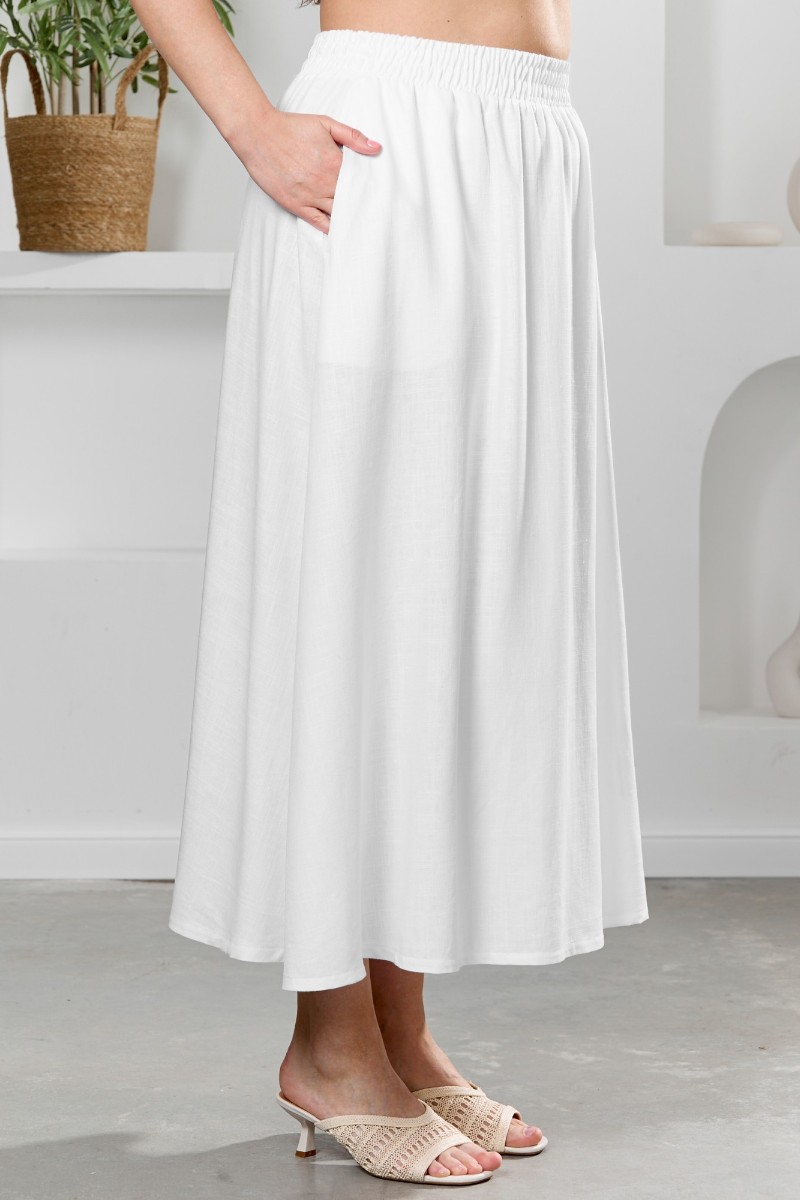 Представляем Вашему вниманию юбку женскую из гладкокрашеного тканого полотна, удлиненная, свободная, с карманами в боковых швах, на притачном поясе с эластичной тесьмой внутри.