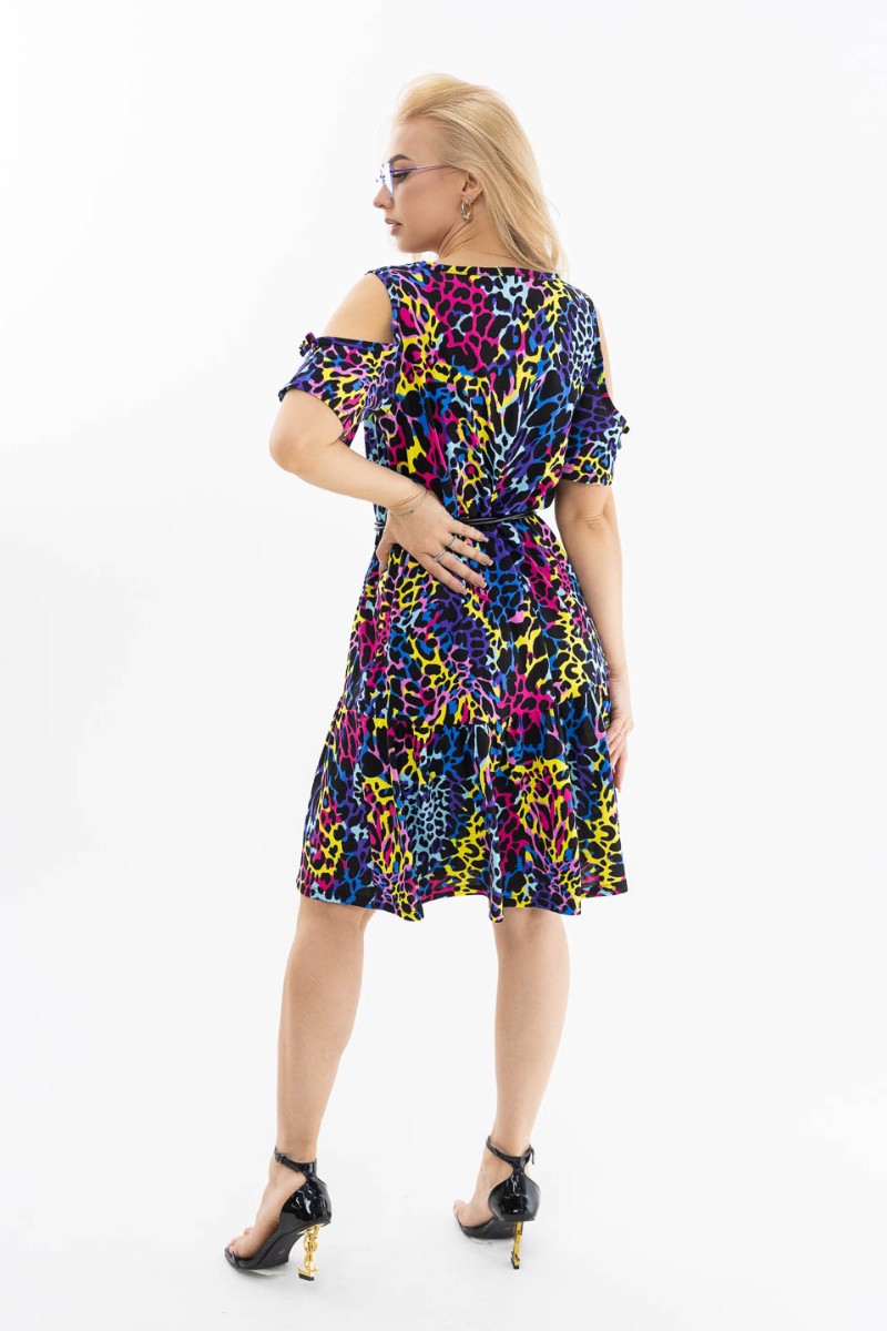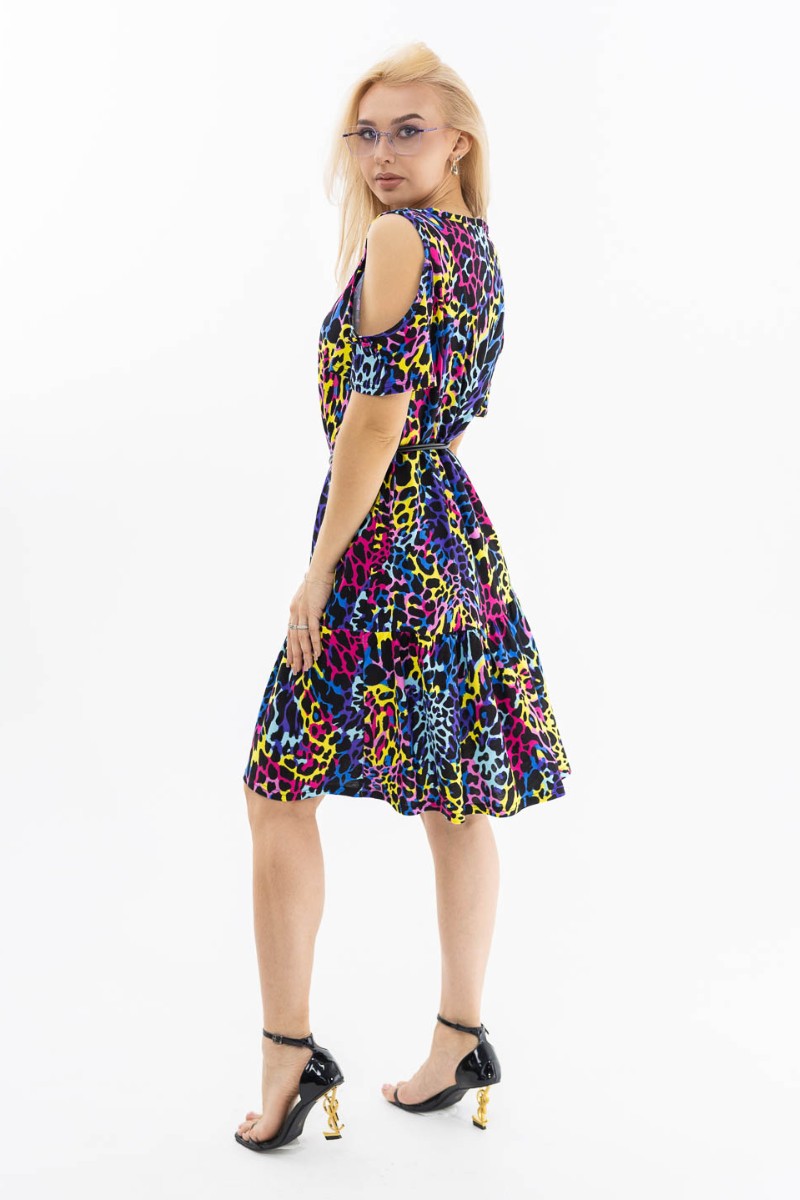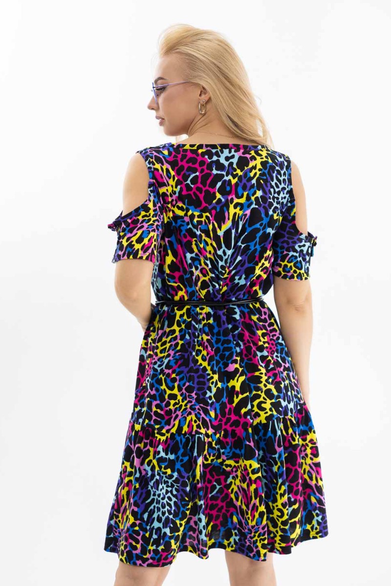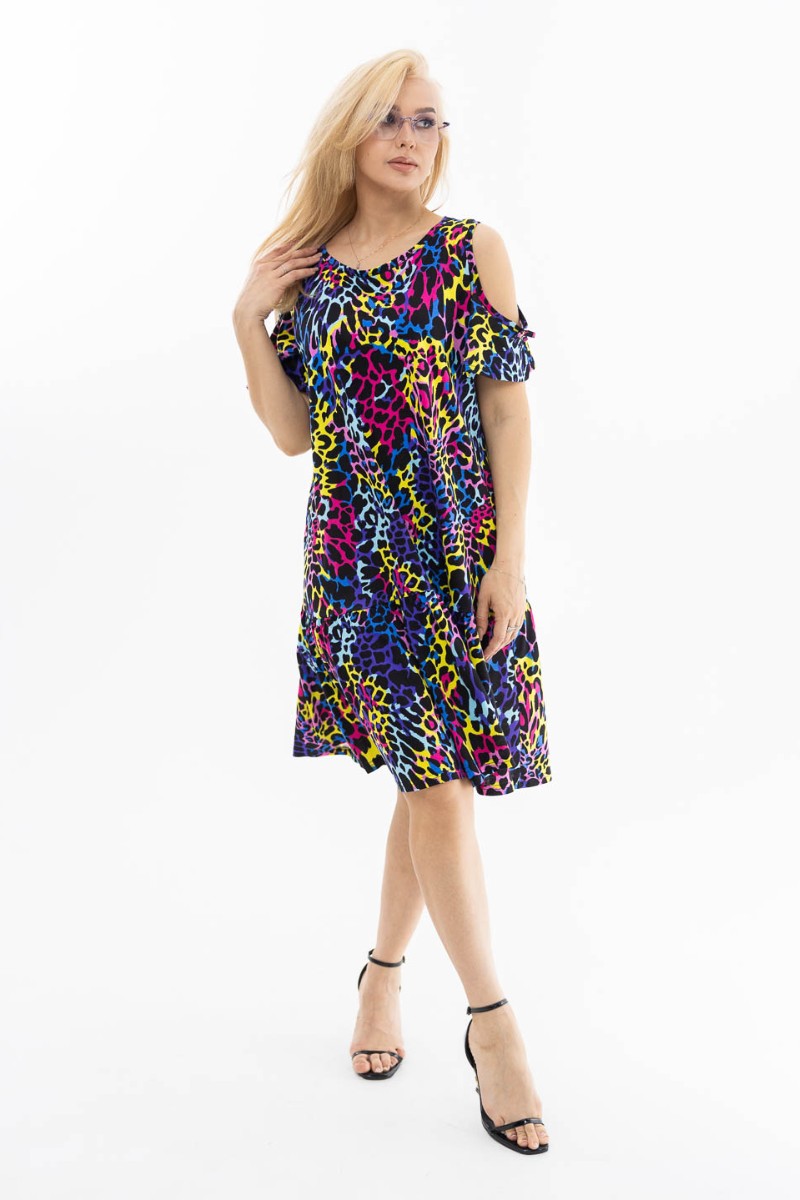 Представляем Вашему вниманию летнее трикотажное платье, длиной до уровня колена, с коротким рукавом и юбкой - волан. Вырез горловины - округлый. Уникальной особенностью модели является открытое плечо, которое подчеркнет ваш утонченный вкус и женственность.