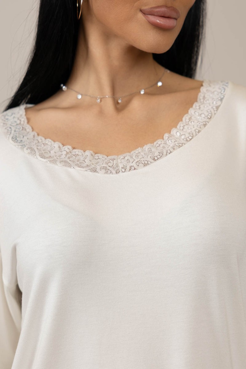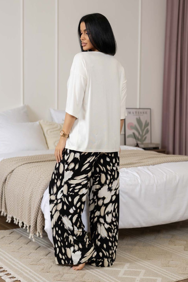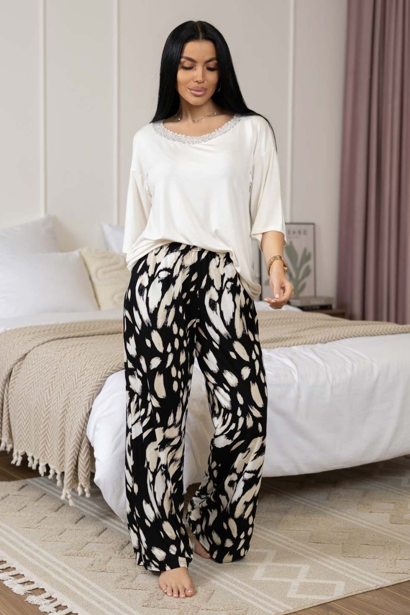 Представляем Вашему вниманию костюм из вискозы с брюками и футболкой. Футболка со спущенным рукавом и кружевом по горловине. Широкие брюки на резинке.