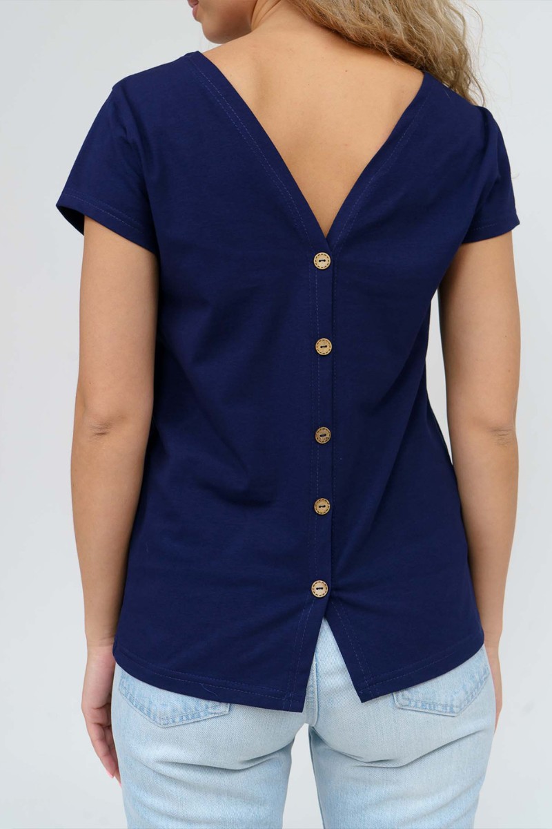 Представляем Вашему вниманию женскую футболку с оригинальным кроем, спинка выполнена на запах с фальшивой застежкой на пуговицы. Изделие представлено в нескольких базовых цветах.