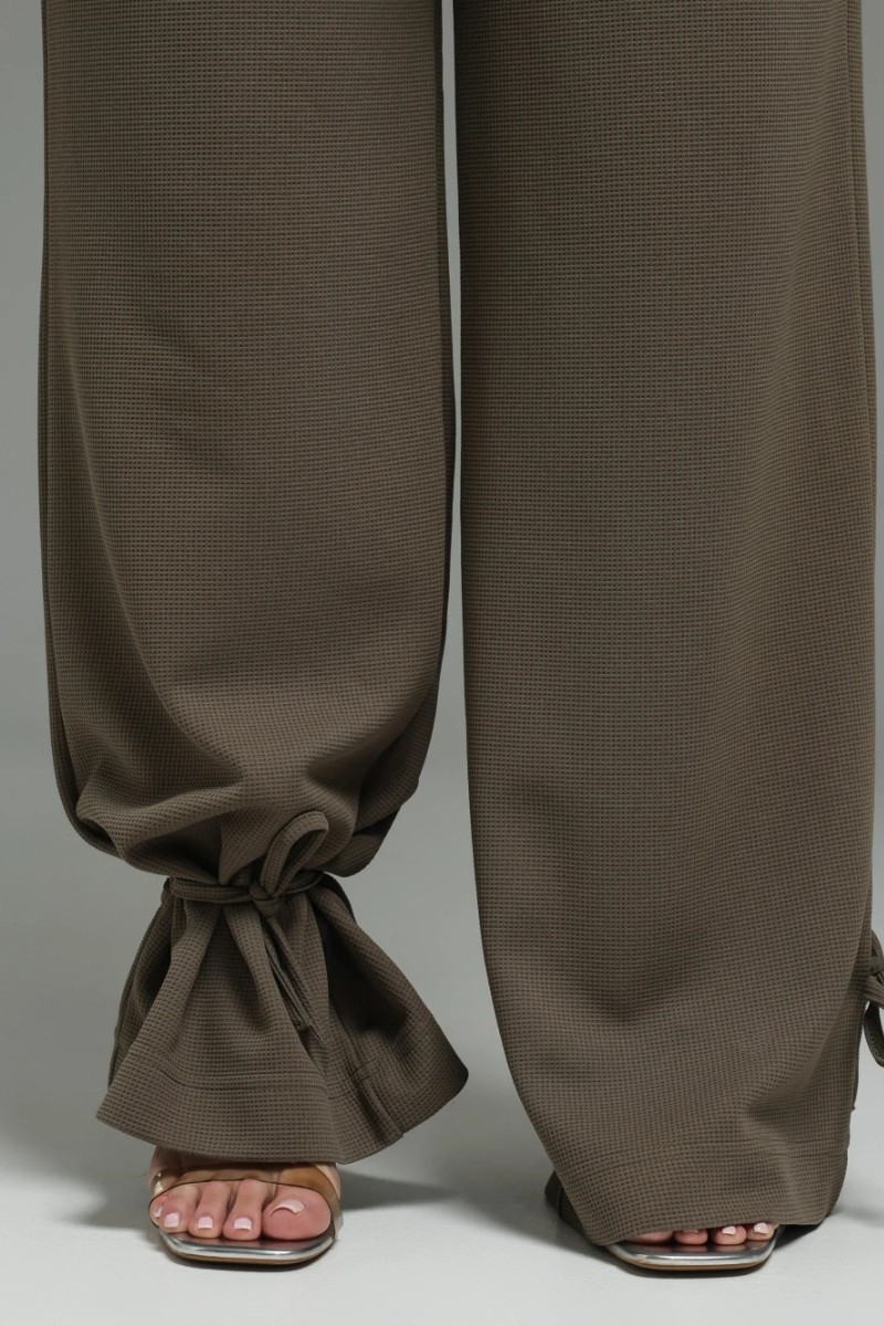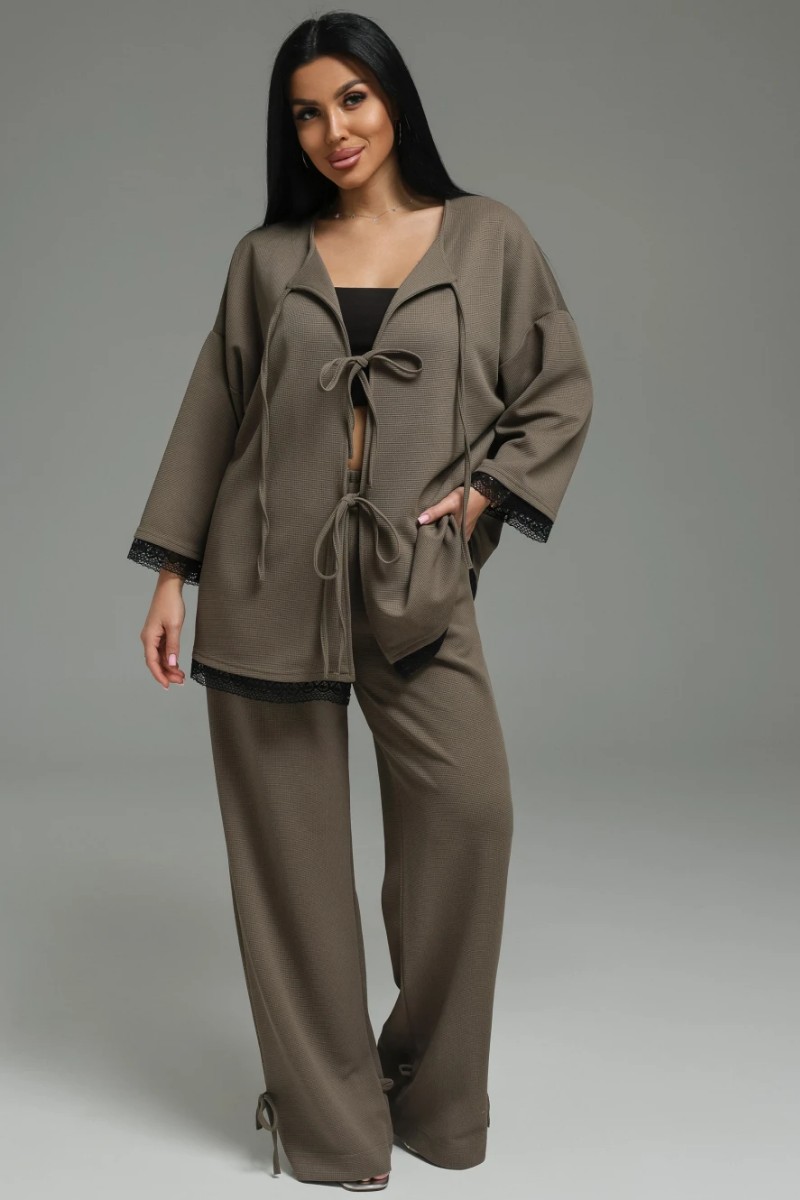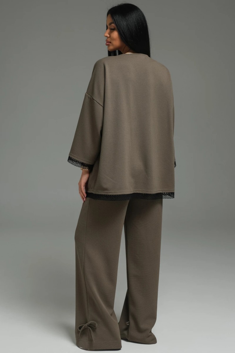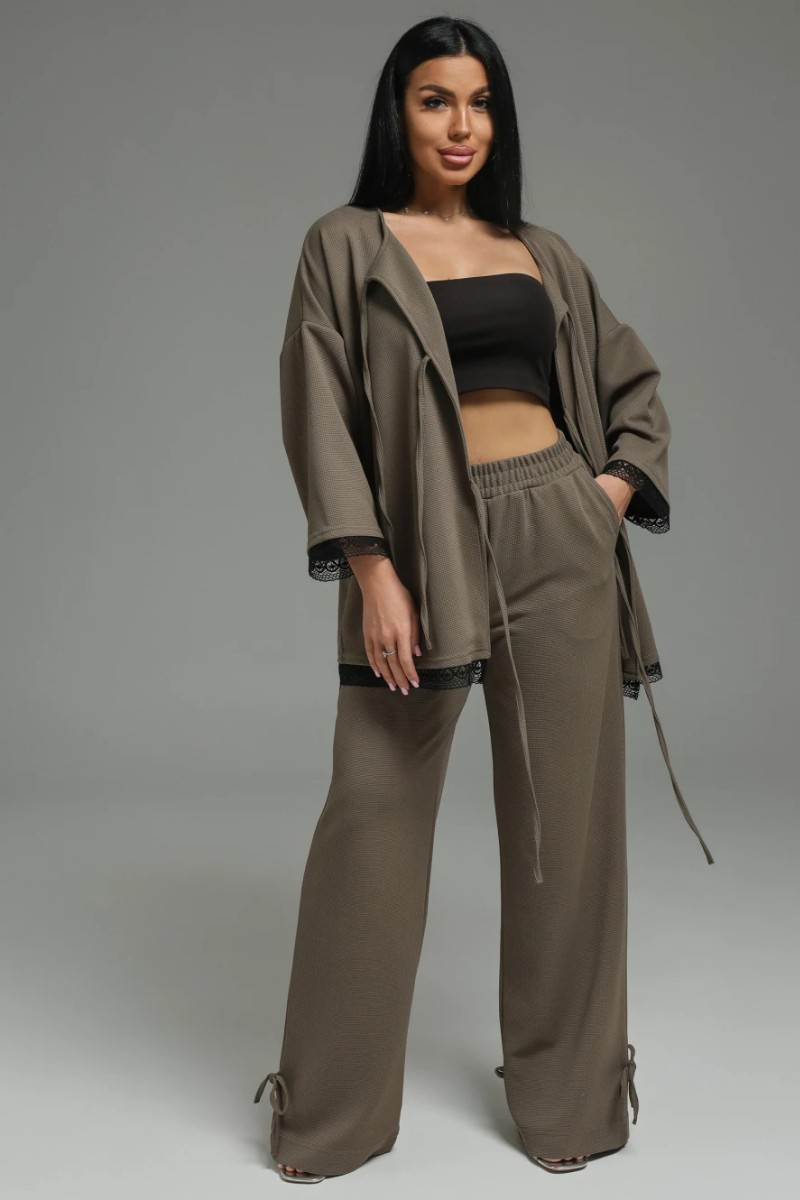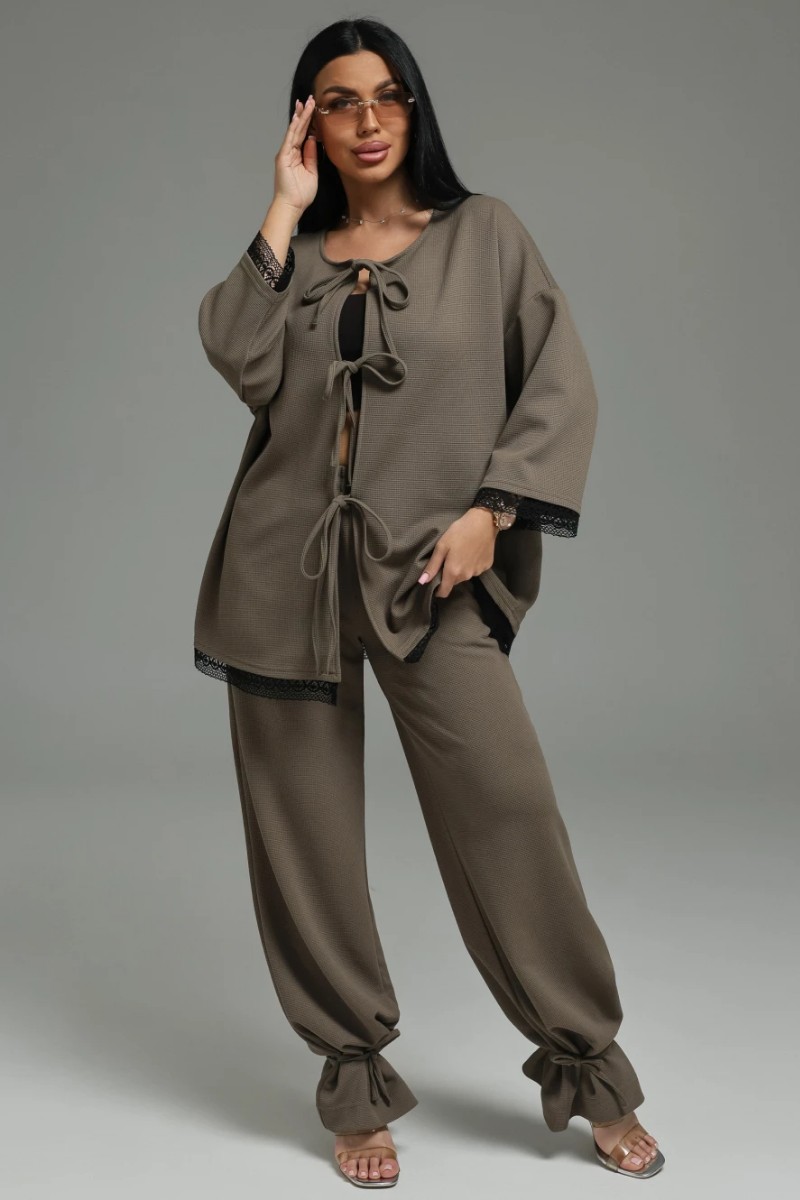 Представляем Вашему вниманию женский костюм-двойку из блузы и брюк. Романтичный образ с кружевом и регулируемыми деталями. Блуза: Крой: Прямой, свободный силуэт. Рукав: Длинный, втачной, длиной 3/4 — элегантно открывает запястья. Застёжка: Оригинальная центральная застёжка на завязках в трёх местах. Вы можете регулировать степень открытости и создавать разный силуэт. Декор: Нежное кружево, пришитое по низу рукавов и по нижнему краю блузы. Добавляет романтичности и изысканности. Брюки: Крой: Прямые, свободные от бедра, комфортные в движении. Посадка: На отрезном поясе — идеально сидят на талии. Карманы: Два функциональных кармана на передних половинках — удобно и практично. Деталь: В нижней части брючин, в боковые швы, втачаны петли для шнурка. Позволяют регулировать ширину низа, создавая эффект «фонарика» или собирая брючину в мягкую сборку. Общее впечатление: Цельный, продуманный образ, где романтика кружева встречается с практичностью и возможностью трансформации. Идеальный выбор для свидания, прогулки или фотосессии.