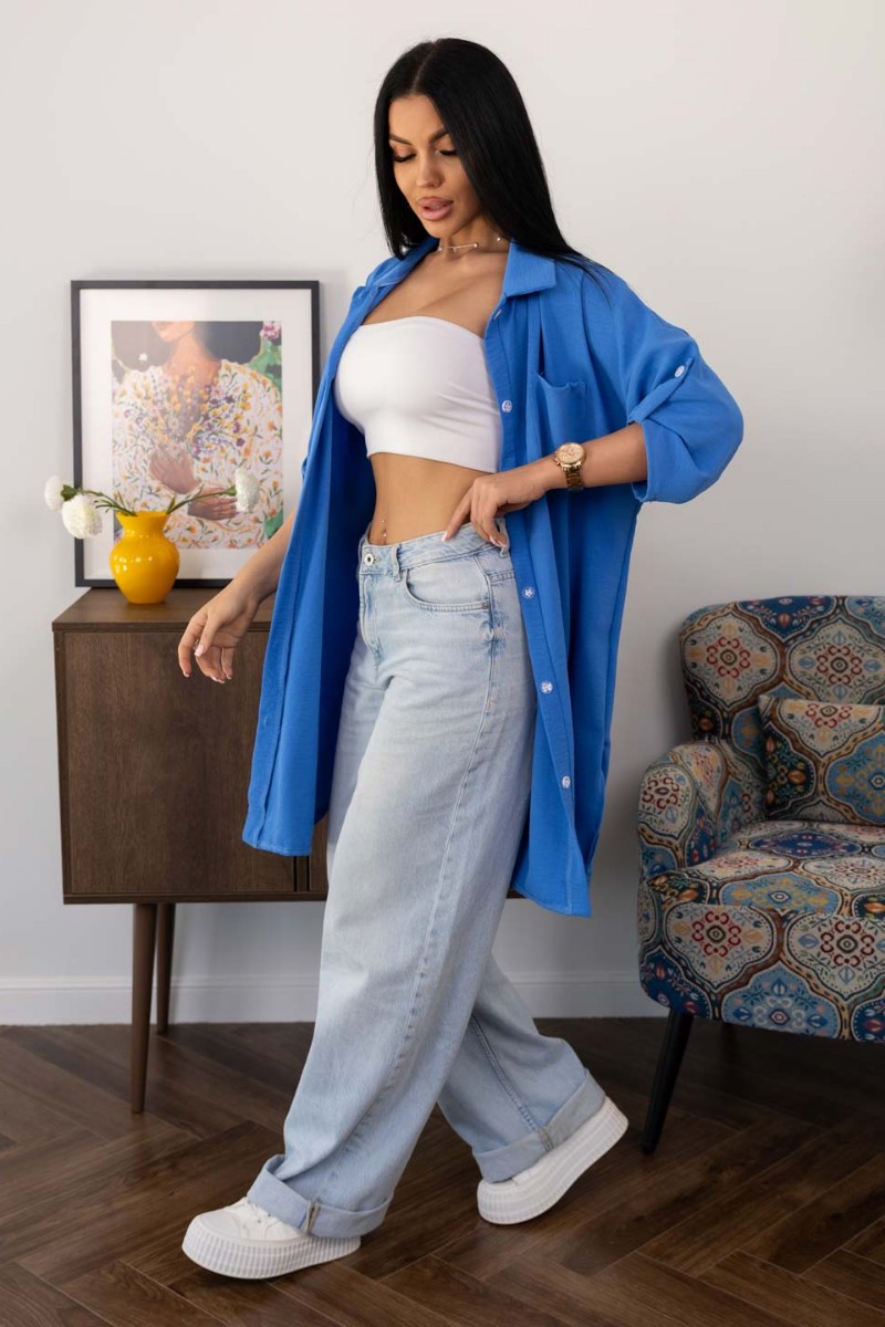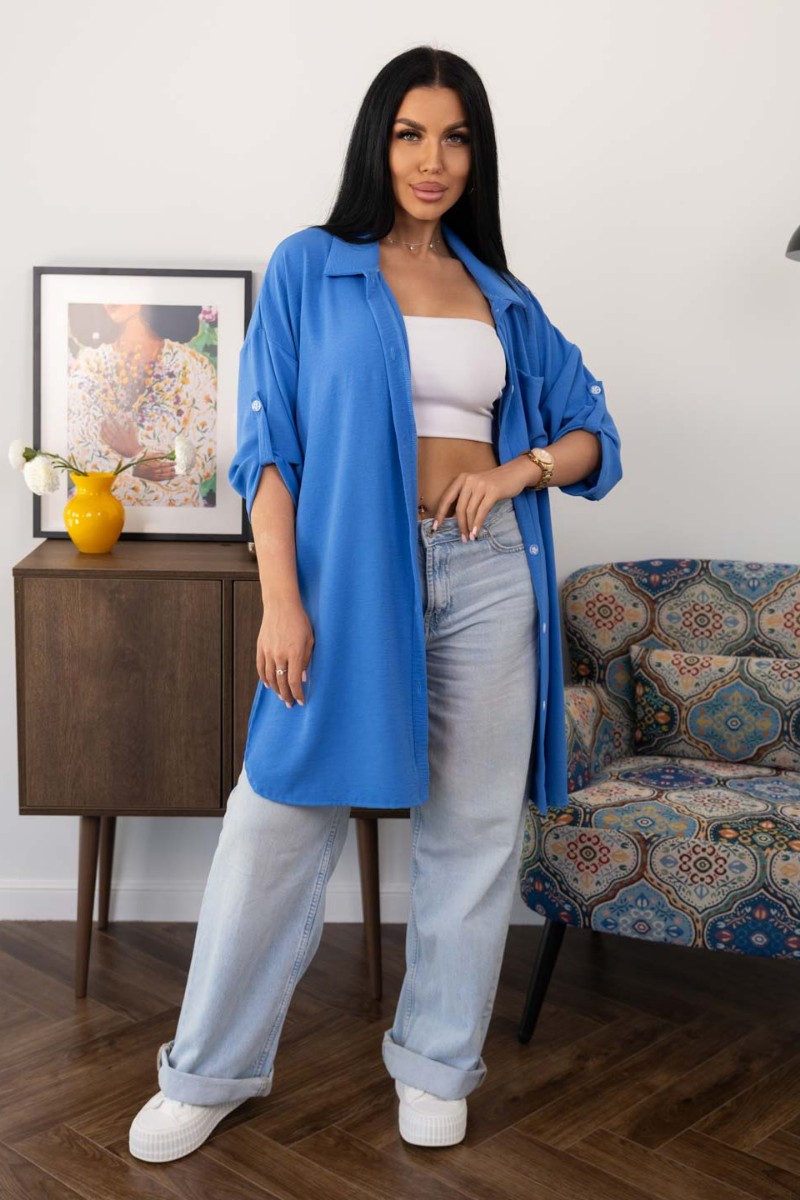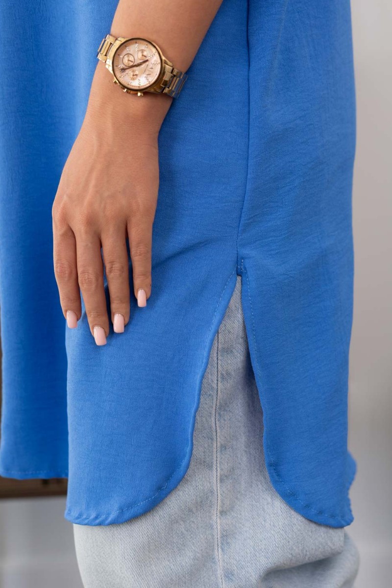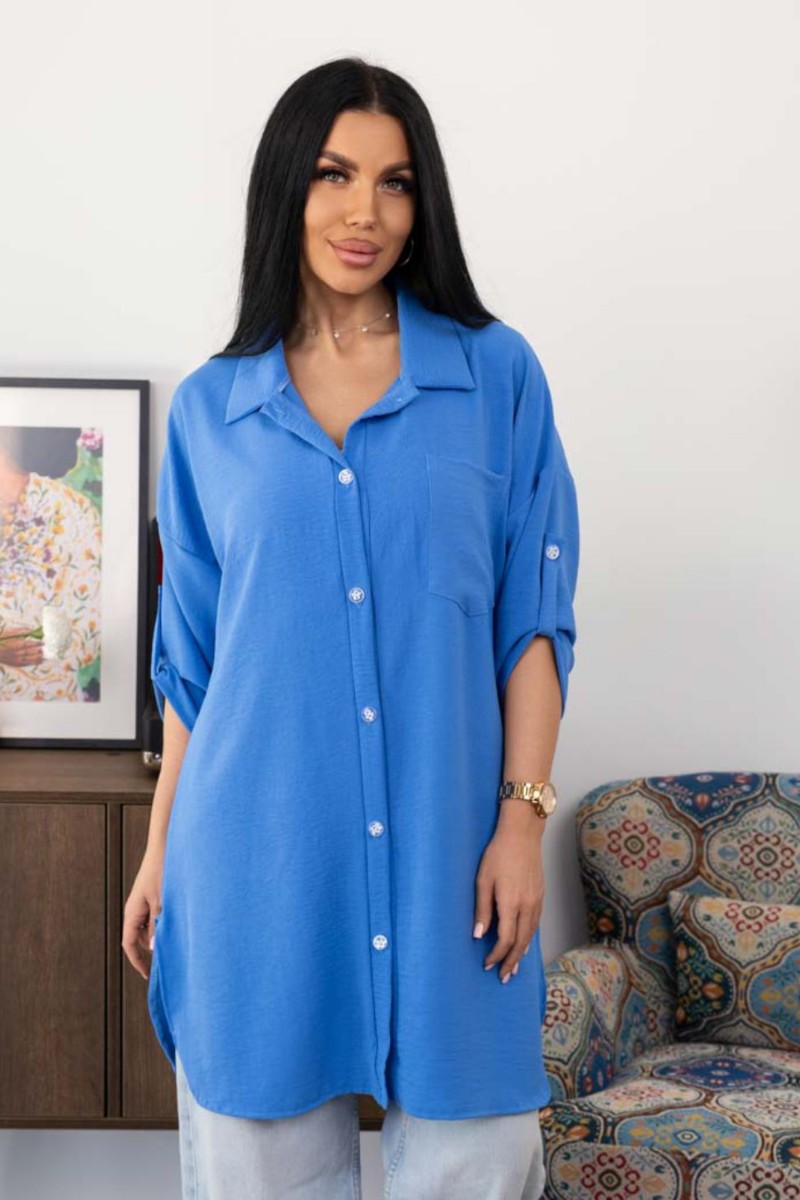 Представляем Вашему вниманию женскую тунику из легкого, воздушного полотна с мятым эффектом. Рубашка с отложным воротником, рукавом 3/4 с патой, разрезами по боковым швам, накладным нагрудным карманом и застежкой на пуговицы.
