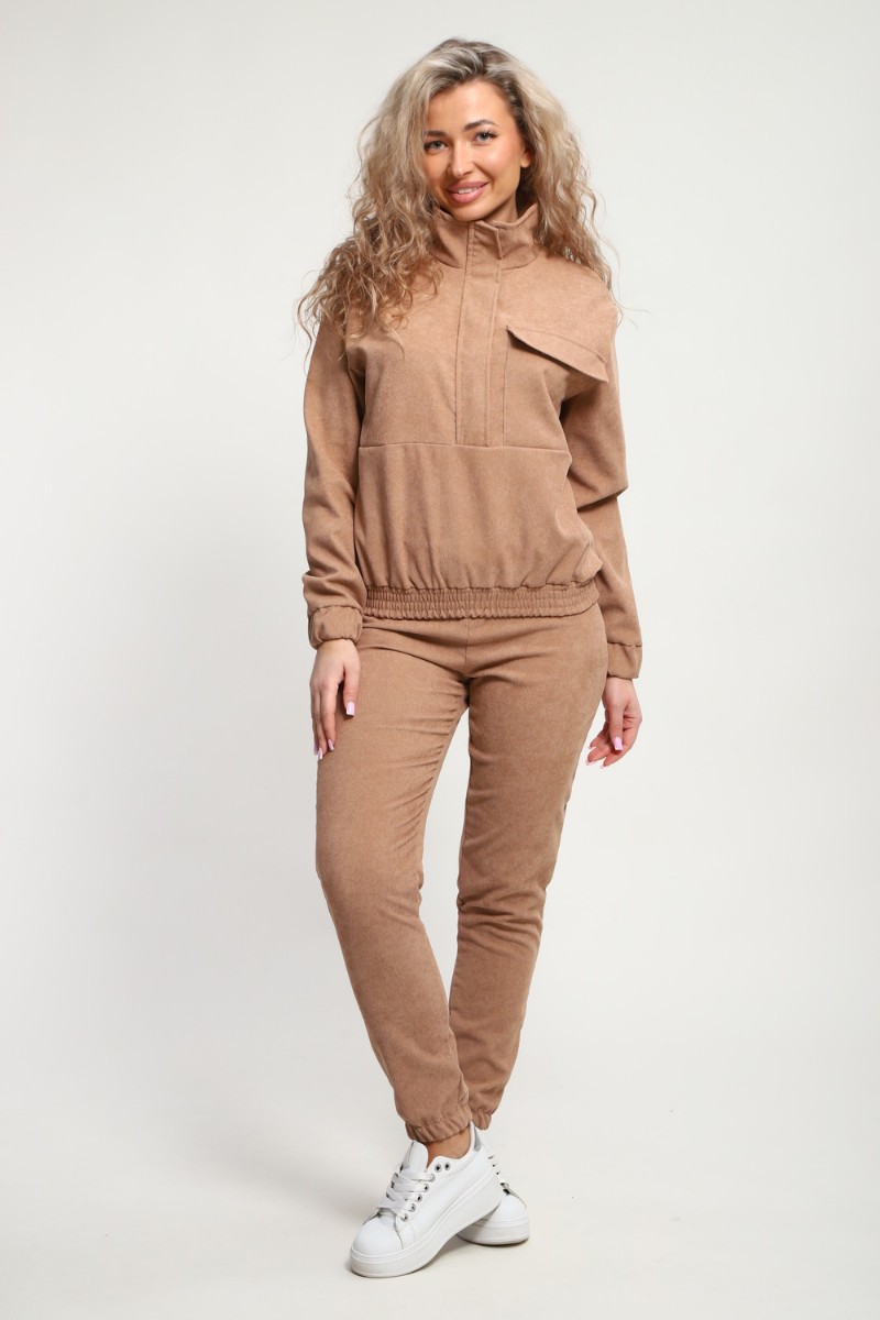 Представляем Вашему вниманию стильный женский костюм двойку из микровельвета, который состоит из толстовки и брюки. Толстовка - воротник-стойка на молнии с клапаном, рукав на резинке. Брюки с карманами по бокам, на резинке в поясе и по низу. Комплект обеспечит максимум комфорта и полную свободу движений в повседневной носке.