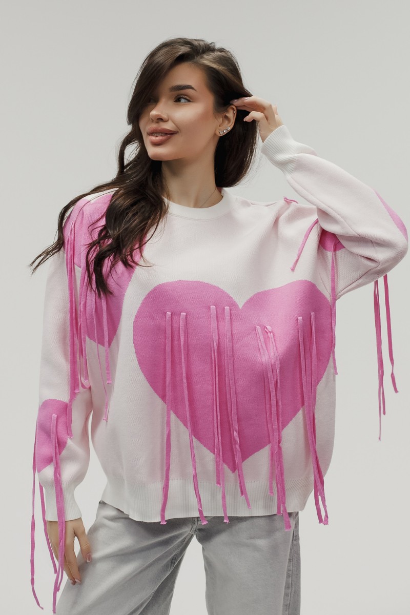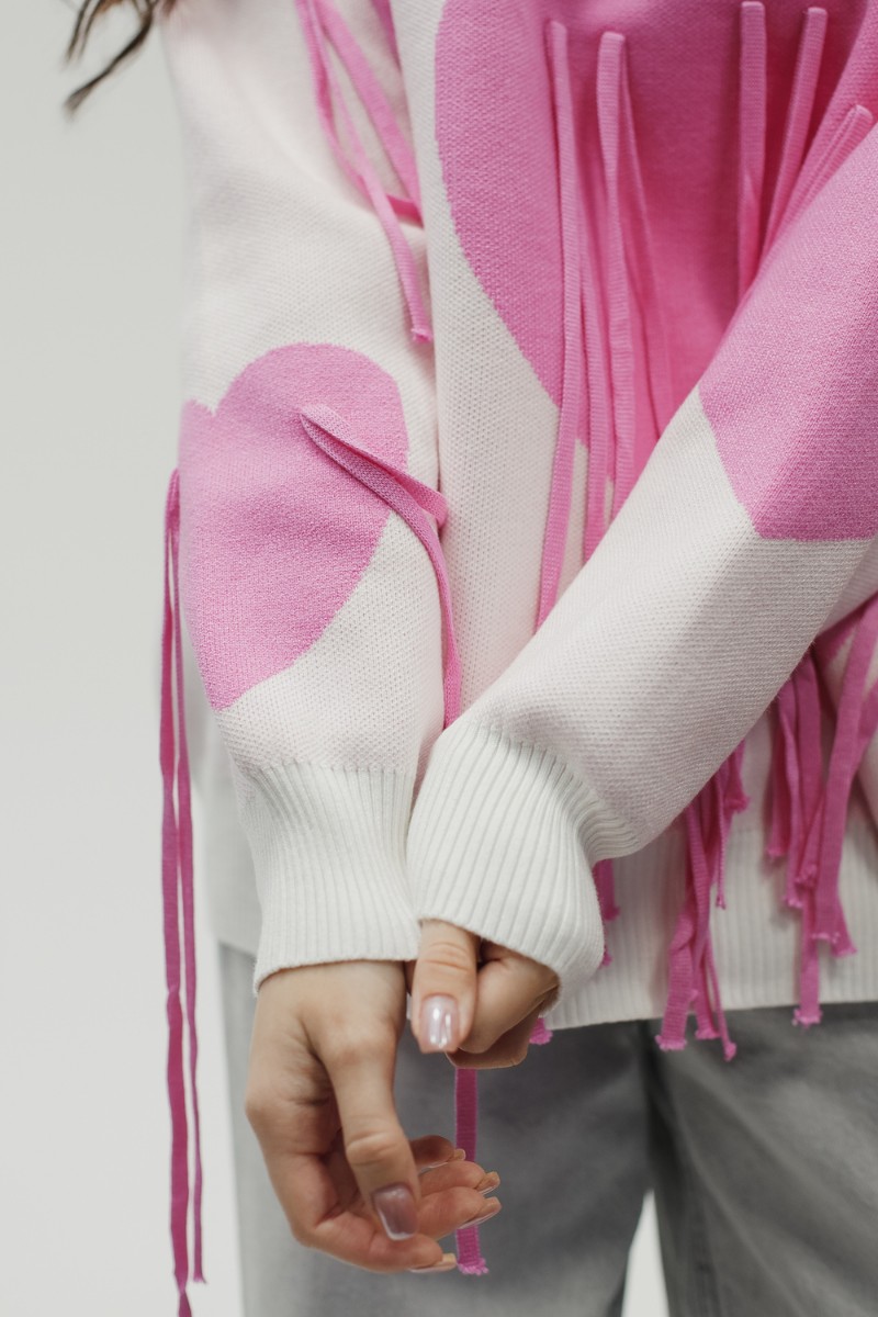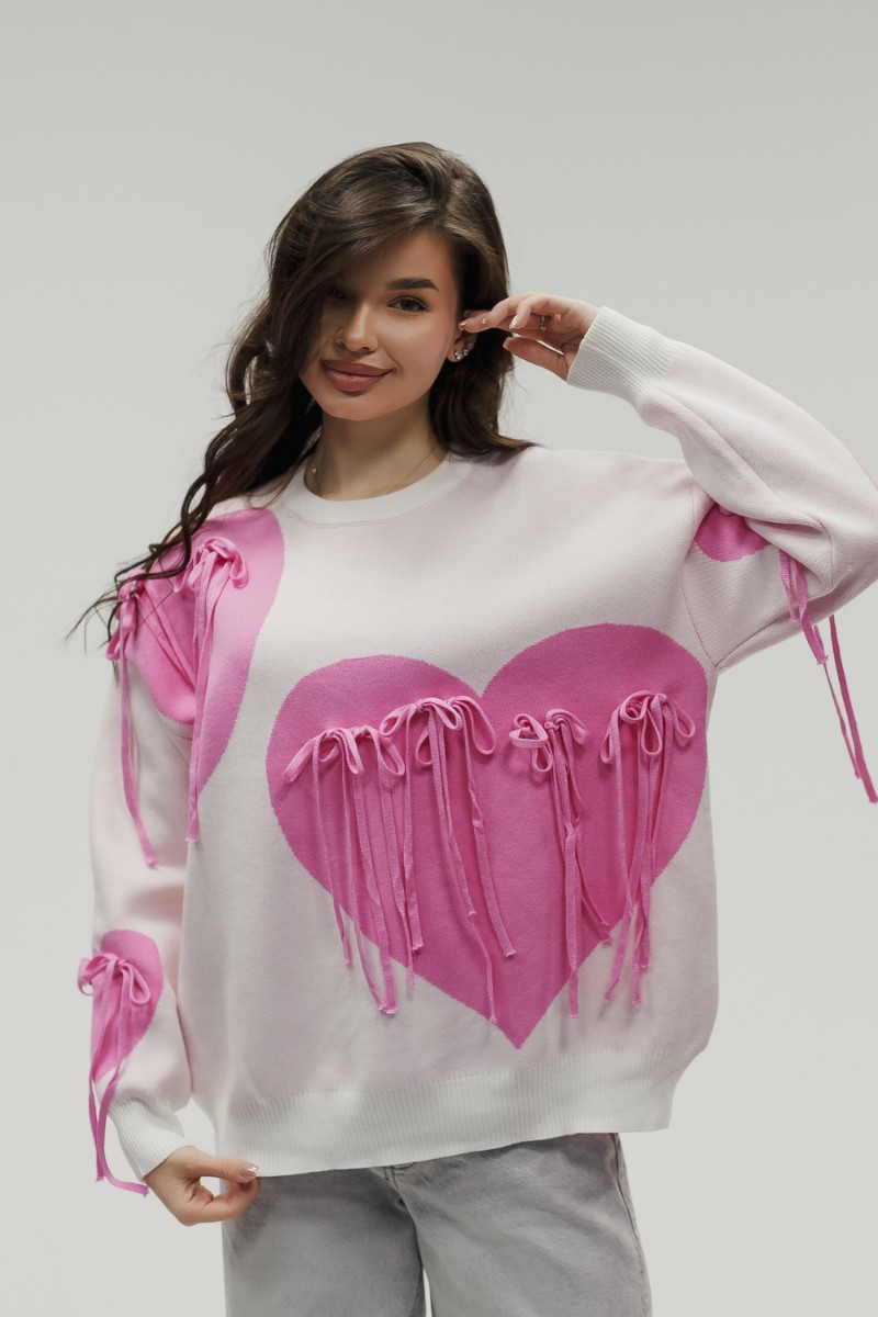 Представляем Вашему вниманию тёплый вязаный свитер с сердечками и декоративными верёвочками романтика в каждой детали! Почувствуйте уют и нежность с этим стильным вязаным свитером: тёплый трикотаж и милый дизайн создадут особое настроение и подчеркнут вашу индивидуальность. Модель сочетает комфорт повседневной вещи с романтичными деталями вывязанными сердечками по всей поверхности свитера и изящными верёвочками на плечах или по бокам, которые можно завязать в аккуратные элегантные бантики это придаёт модели особый шарм и позволяет менять образ по настроению. Плотный вязаный трикотаж (состав: 30% хлопка, 40% вискоза, 30% полиэстер) отлично сохраняет тепло, приятен к телу и не вызывает раздражения. Свободный силуэт не сковывает движений, подходит для разных типов фигуры и легко комбинируется с другой одеждой. Свитер будет отлично смотреться с джинсами скинни или бойфрендами. Для повседневного кэжуал‑образа, с юбками миди и высокими сапогами,для романтичного зимнего лука, с легинсами и объёмной верхней одеждой для уютных прогулок, а также со спортивной обувью или ботинками на толстой подошве для стильных городских образов. Сезонность осень, зима, весна, прохладное лето. Несмотря на декоративные элементы, свитер остаётся удобным в носке бантики не мешают, а при желании верёвочки можно оставить распущенными.