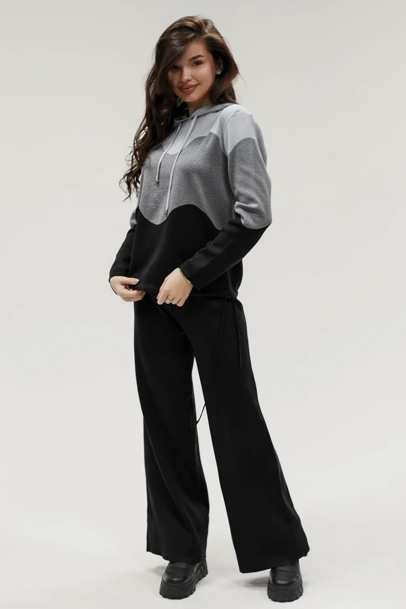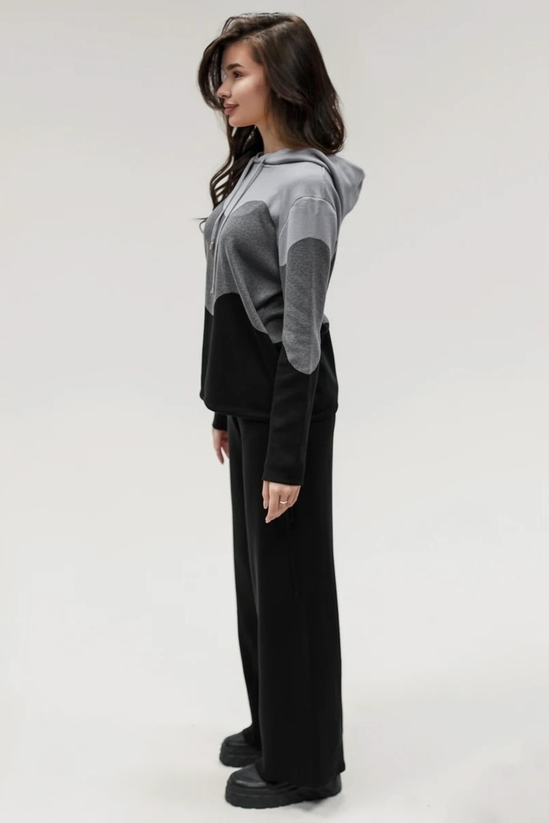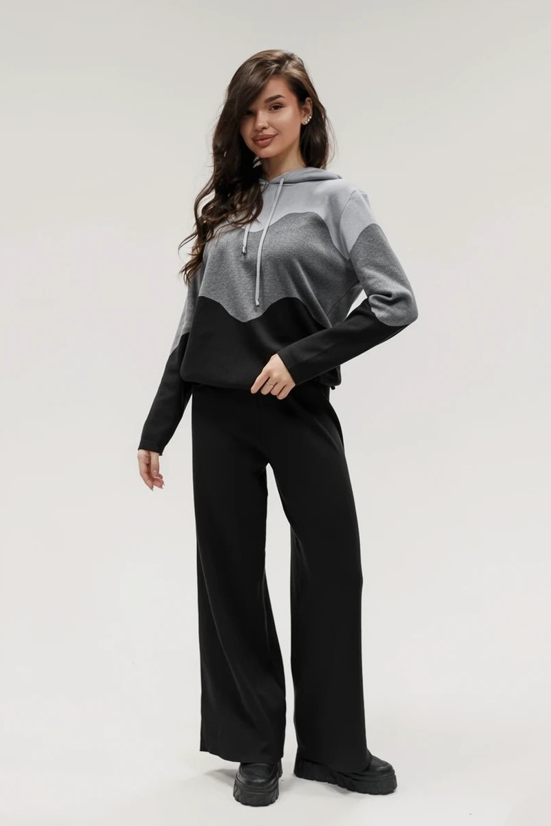 Крой кофты свободный, с капюшоном, кулиской по нижнему краю и эластичными манжетами; крой брюк прямой силуэт, средняя посадка, эластичный пояс. Особенности: кофта с регулируемым капюшоном и кулиской, брюки без карманов.