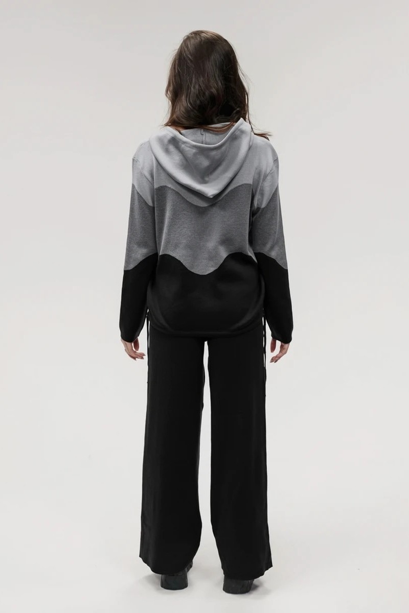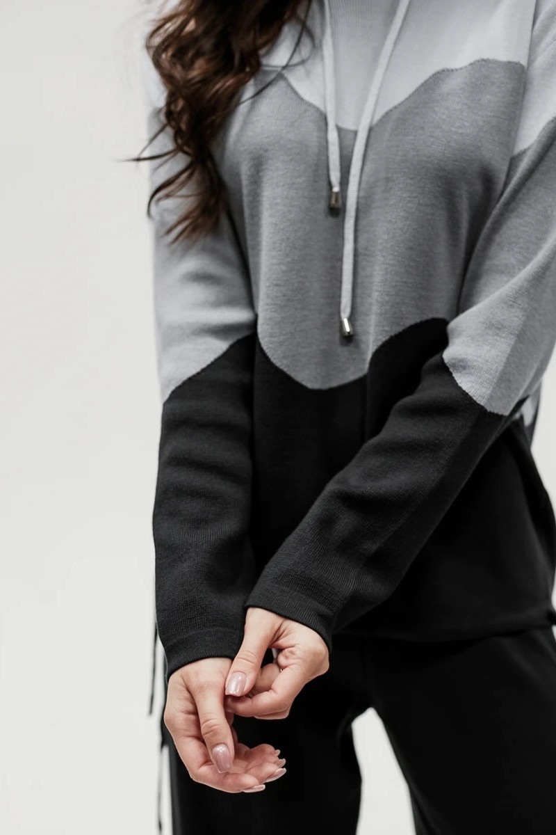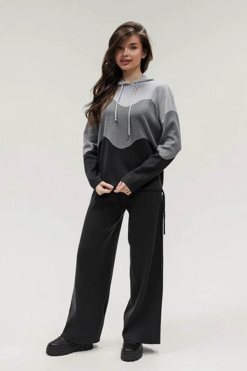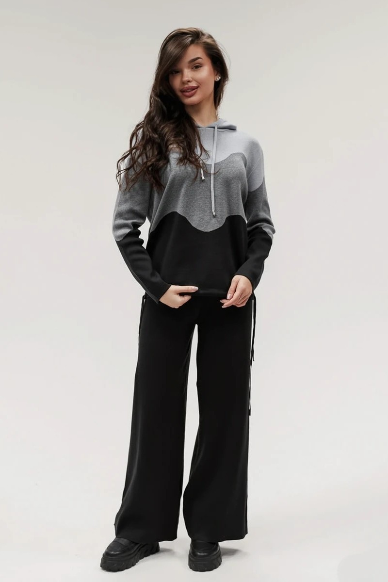 Крой кофты свободный, с капюшоном, кулиской по нижнему краю и эластичными манжетами; крой брюк прямой силуэт, средняя посадка, эластичный пояс. Особенности: кофта с регулируемым капюшоном и кулиской, брюки без карманов.